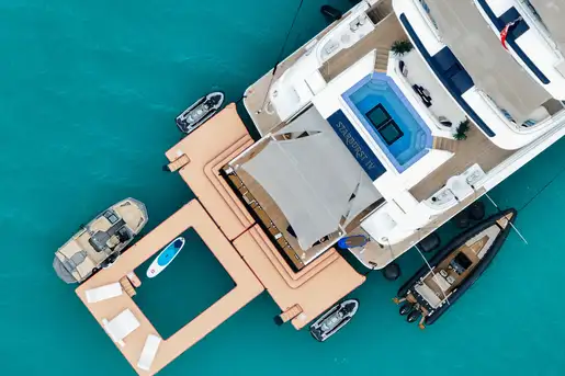 STARBURST IV boasts a stunning beach club, complete with espresso bar, that is dappled with natural light through the pool above. The contents of a huge toy locker range from waverunners, SeaBobs and all manner of tows, to flyboards, wakeboards and an inflatable aquapark including a 13m sun-deck-to-sea slide.