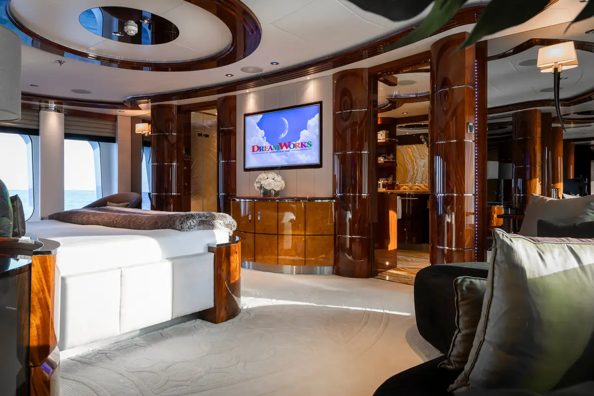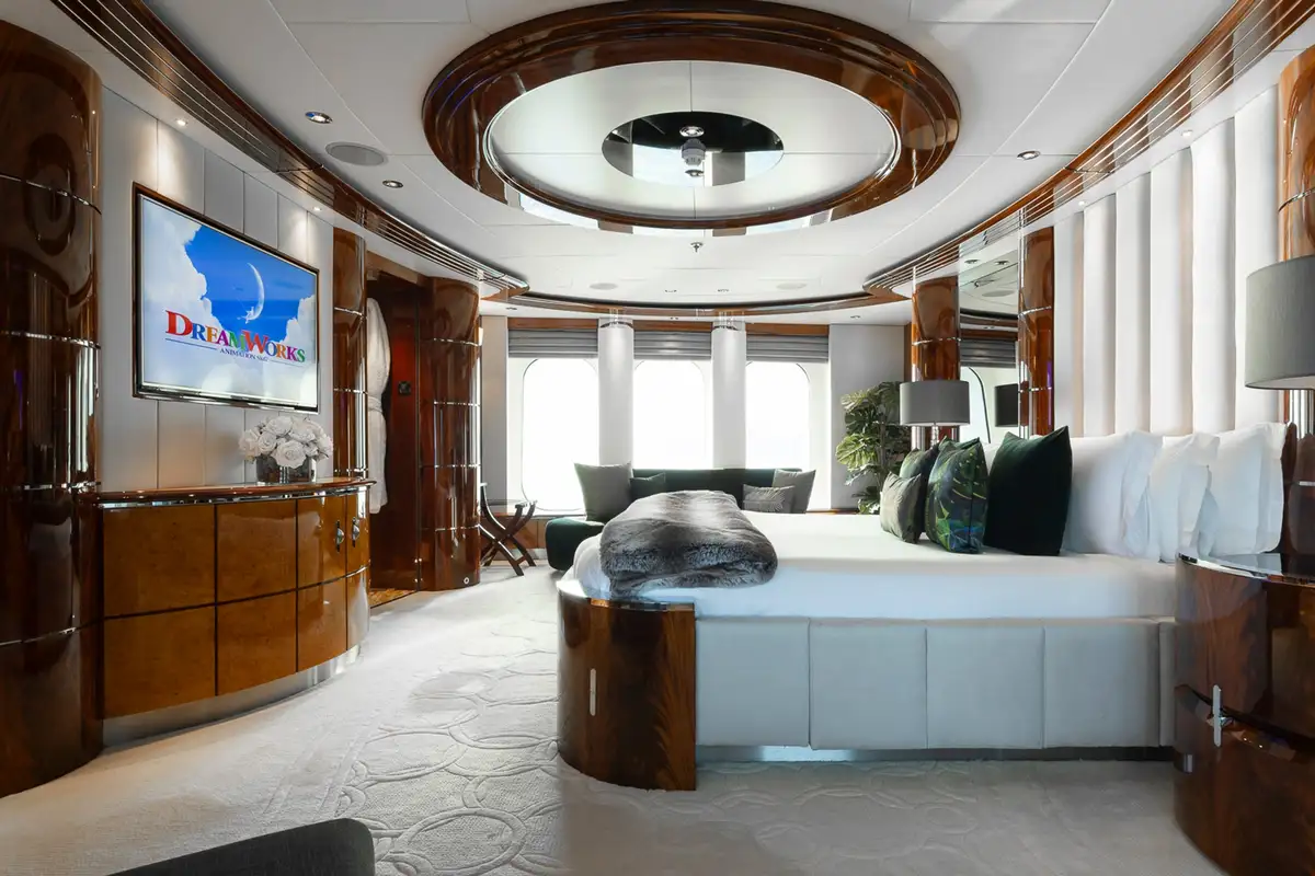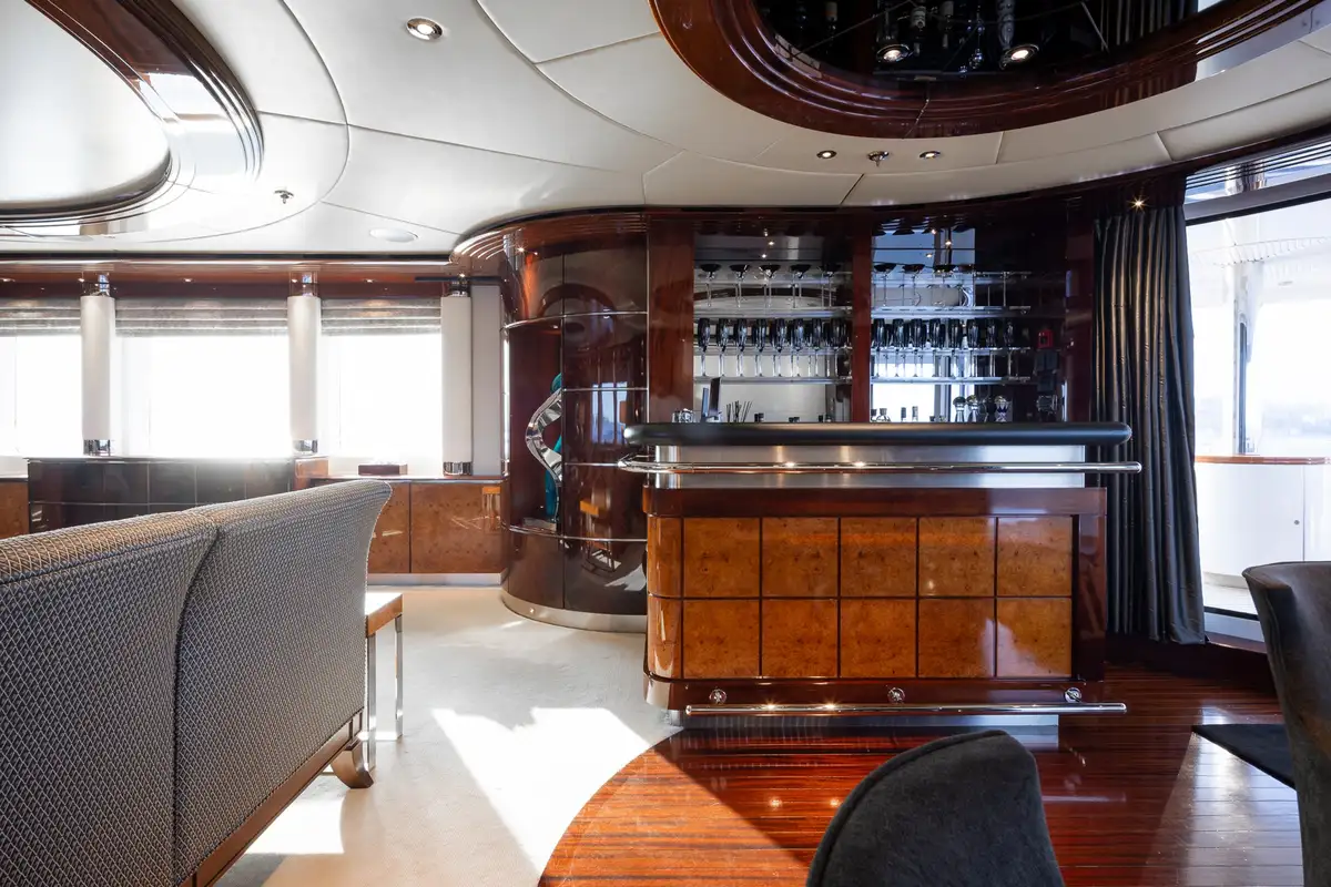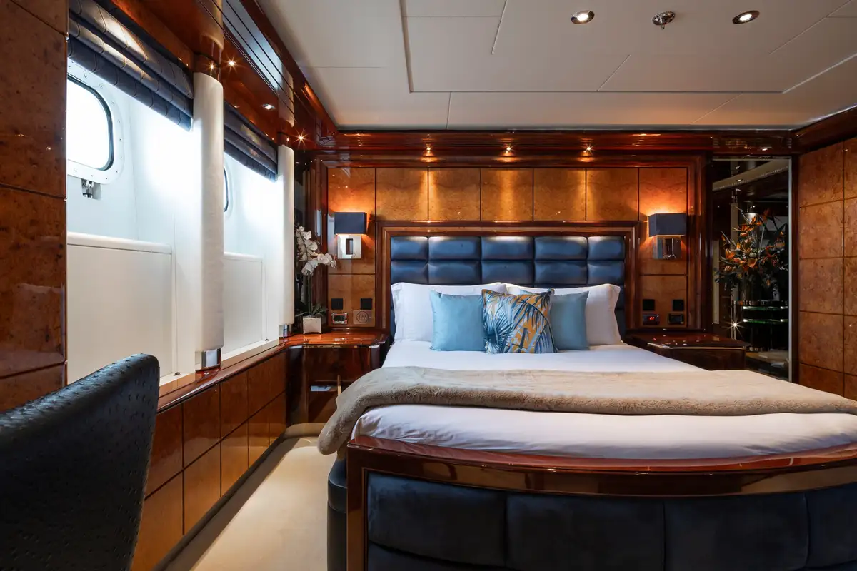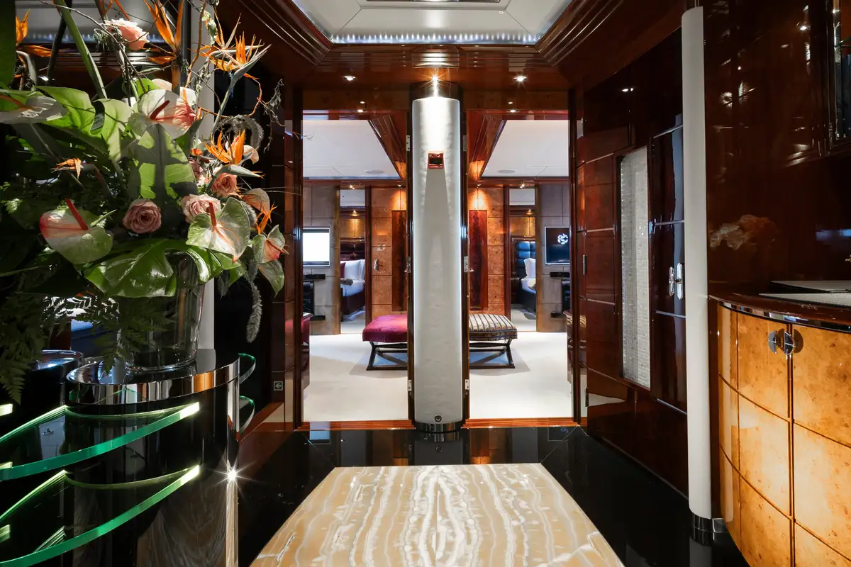 Her eye-catching interior blends Asian influences with Art Deco touches to create lavish entertaining spaces that are also supremely comfortable to live in. The more formal main salon and dining area is off-set by the relaxed setting of the sky lounge, with its large, curving corner sofa and wide opening onto the bridge deck aft.