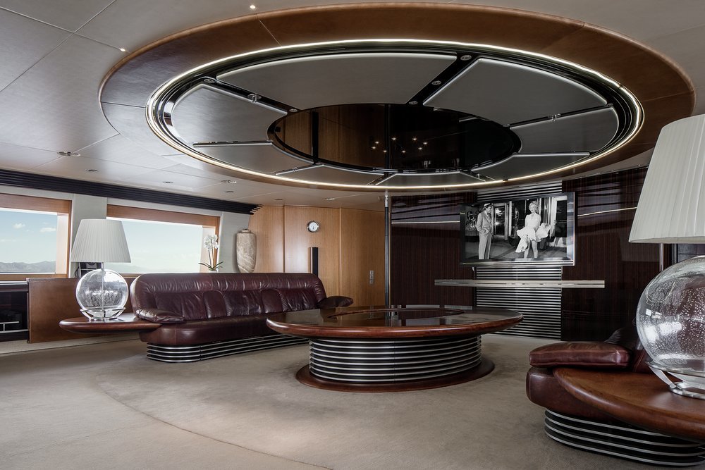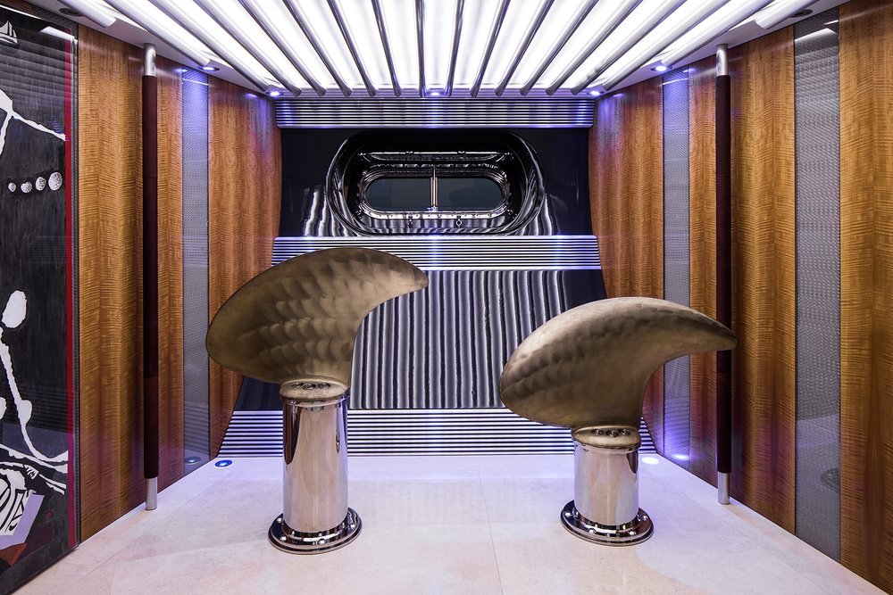 Today the yacht is as iconic as ever. 'She is in immaculate condition,' says Hannah. Her exterior styling and interior design, by the serial award-winning British designer Ken Freivokh, evoke the industrial Art-Deco aesthetic of Fritz Lang's Metropolis, a bold symphony of wood, leather, steel and glass. 'She's incredible,' Hannah continues. 'Around every corner there are stop-and-stare artworks and architectural features, like the three-deck sky-lit atrium where the stairs spiral around the main mast. She's as fresh and impressive as the day she was launched.