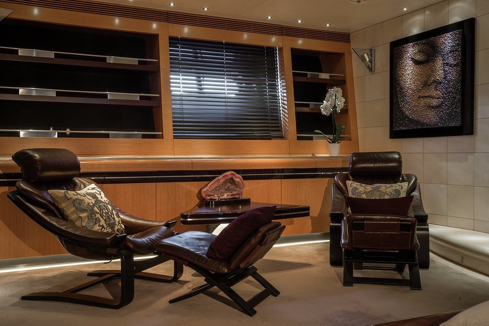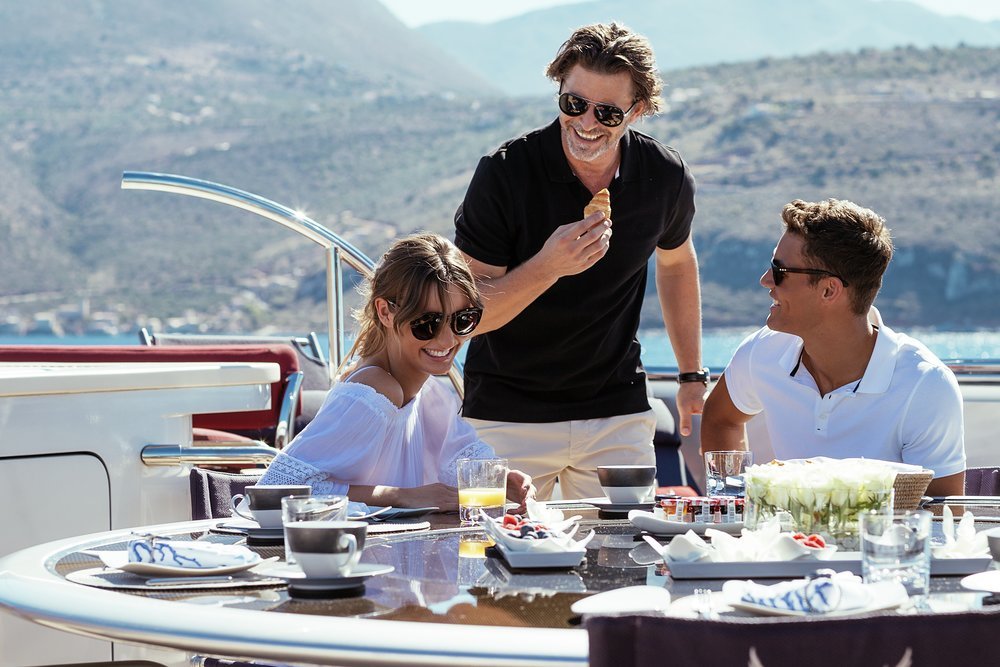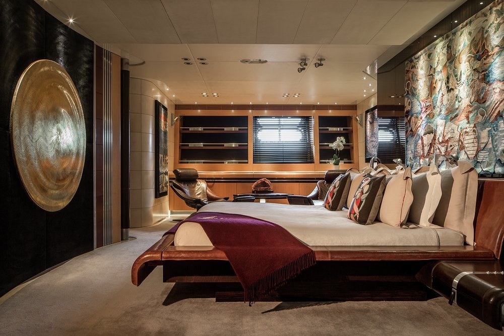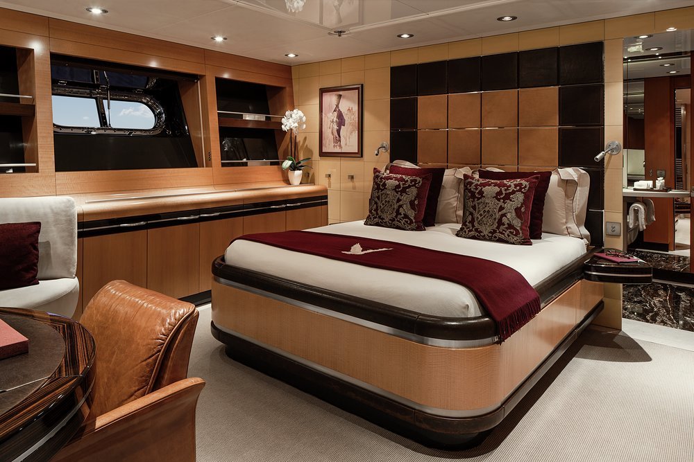 'When it's time for bed, the full-beam master suite on the lower deck has two walk-in wardrobes as well as his-and-hers bathrooms, a cosy lounge and an adjoining gym. As principal you may be tempted to take the private VIP deck instead, aft facing on the bridge deck with access to the terrace and walkaround sidedecks. There are four more double cabins on the lower deck, all of which can be joined to create two more VIP suites. It's super flexible accommodation, which is great news for all sorts of charter parties.'