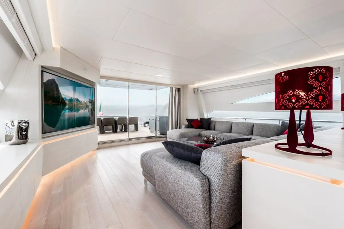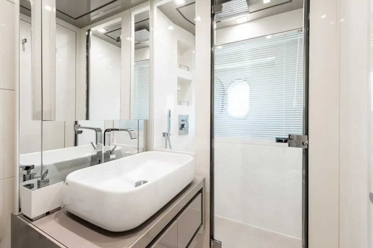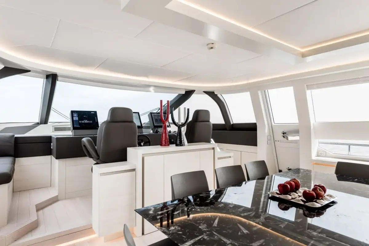 She can accommodate 10 guests and four crew. The guest accommodation is on the lower deck and comprises a full-beam owner’s suite aftmost it features large hull windows, a dressing table, a walk-in wardrobe and en suite heads with a separate shower compartment. Moving forward there are two, en suite, twin-berth cabins. There is a double VIP suite forward to port, with the galley and crew mess to starboard. Forward is the crew accommodation. On the main deck, the wheelhouse is forward. The main saloon has a large formal dining area forward with J-shaped sofa seating aft.