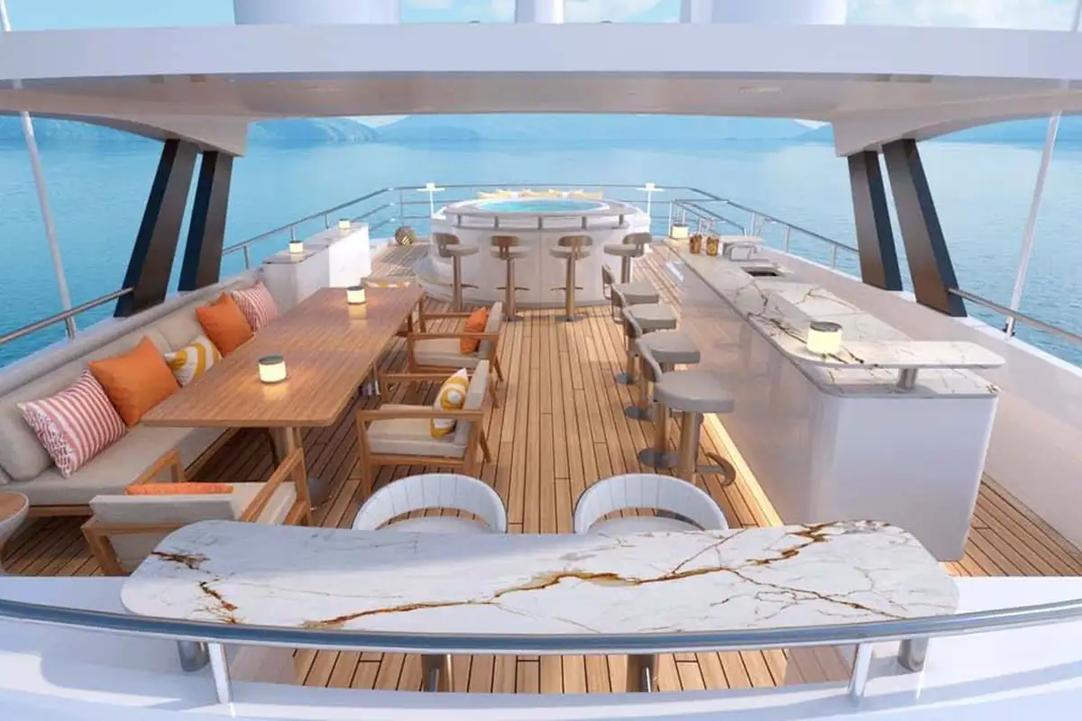 Large sliding doors seamlessly connect the winter garden with bridge deck aft, creating one large space to enjoy the best of both worlds, while the sun deck provides 360° views and a spacious lounge area with bar and grill.