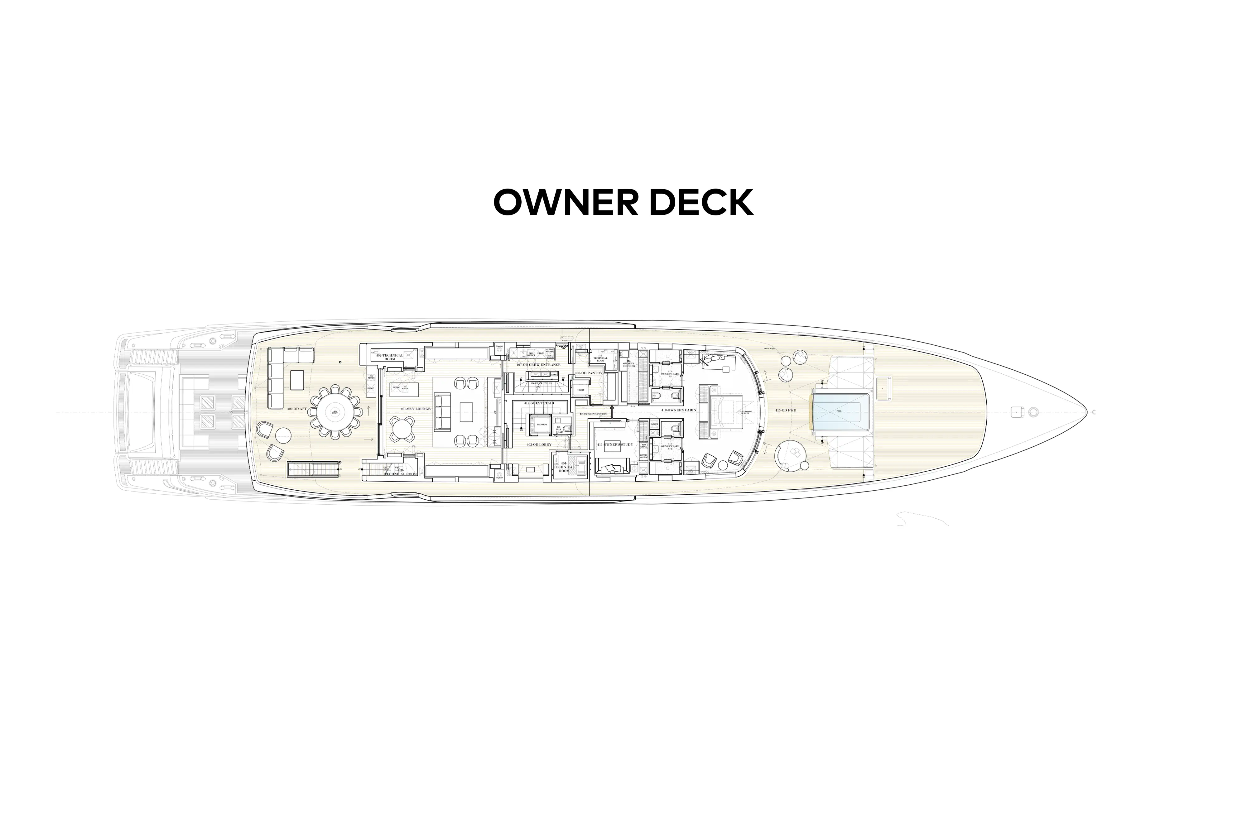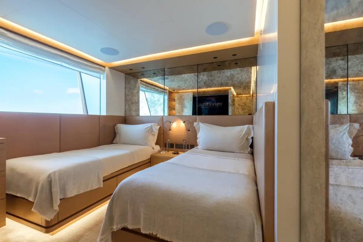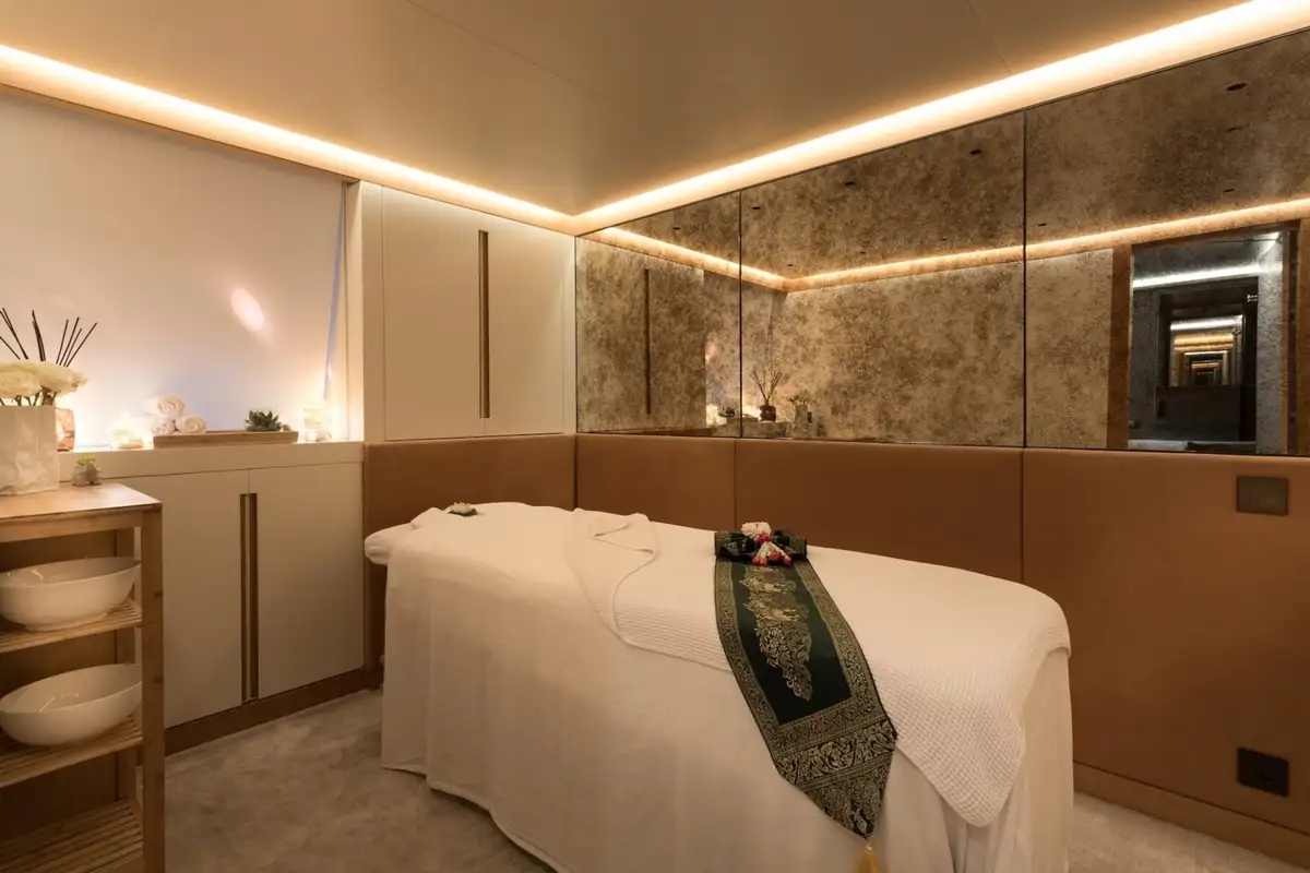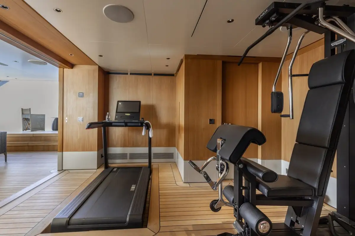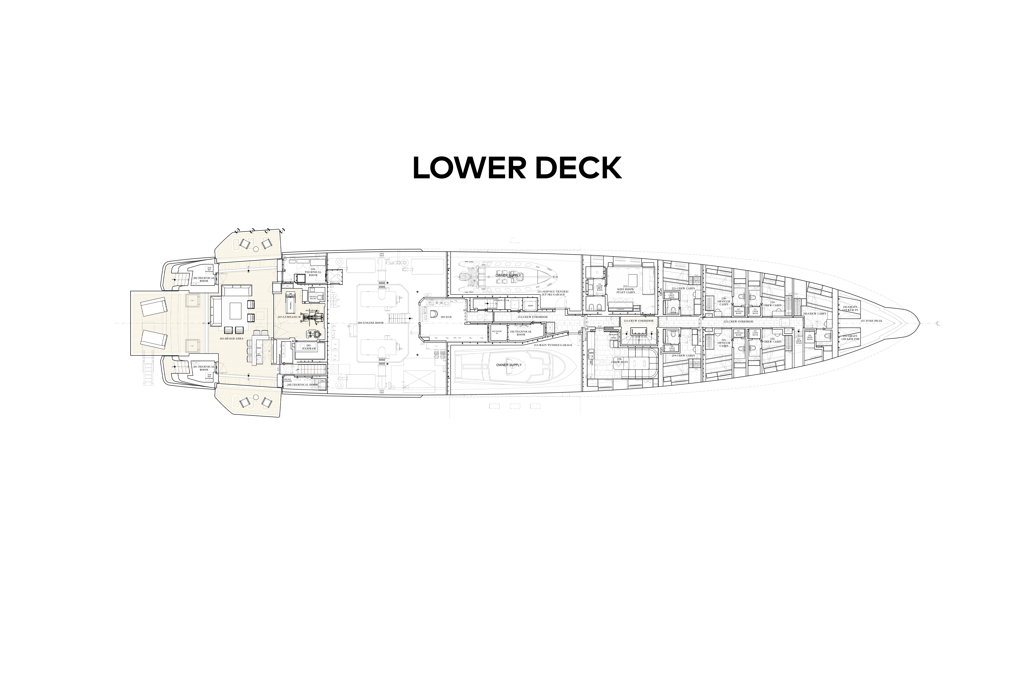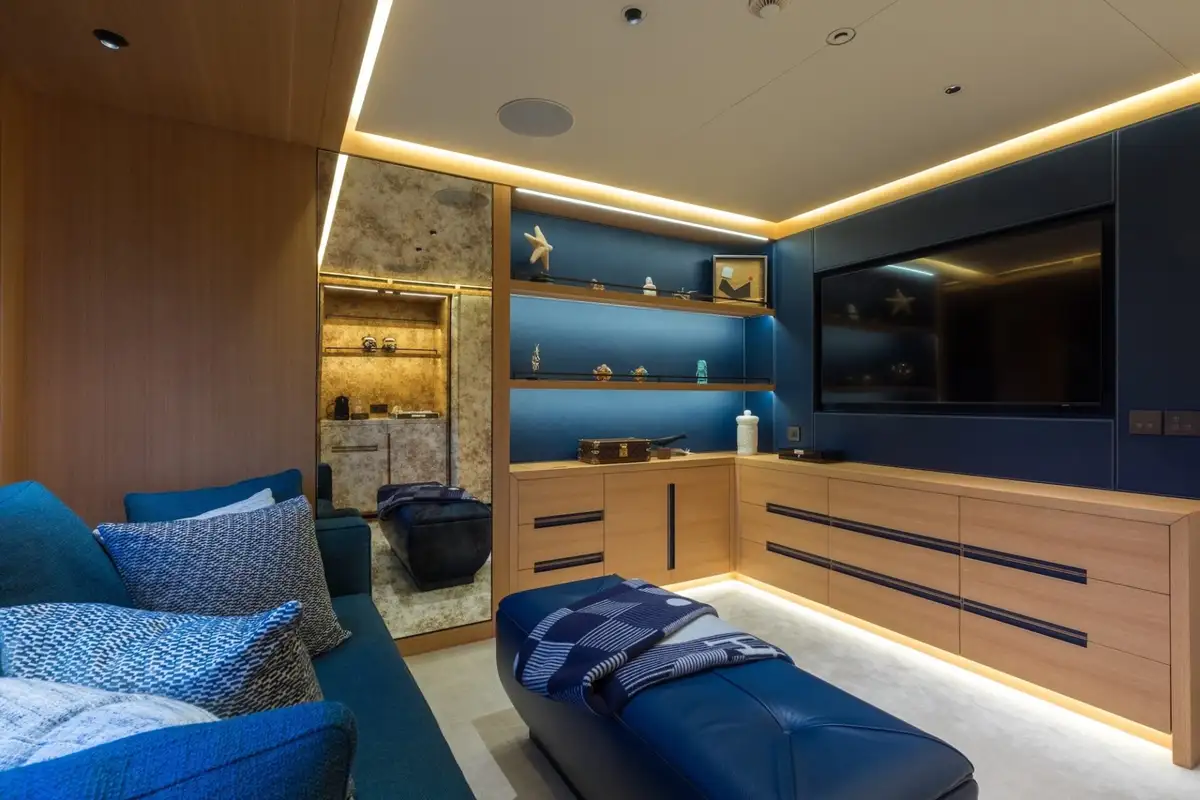 Accommodation is for 12 guests in six suites, including a full owner’s deck complete with a private study and direct exterior access. The main deck offers two VIP suites and three additional guest cabins, delivering excellent flexibility for families. The lower deck houses a professional wellness centre with gym and hammam. Crew quarters accommodate up to 16 crew, ensuring seamless service.