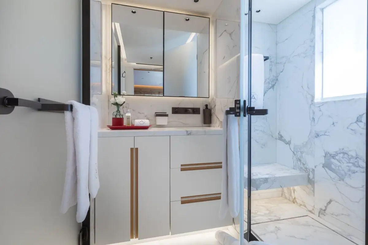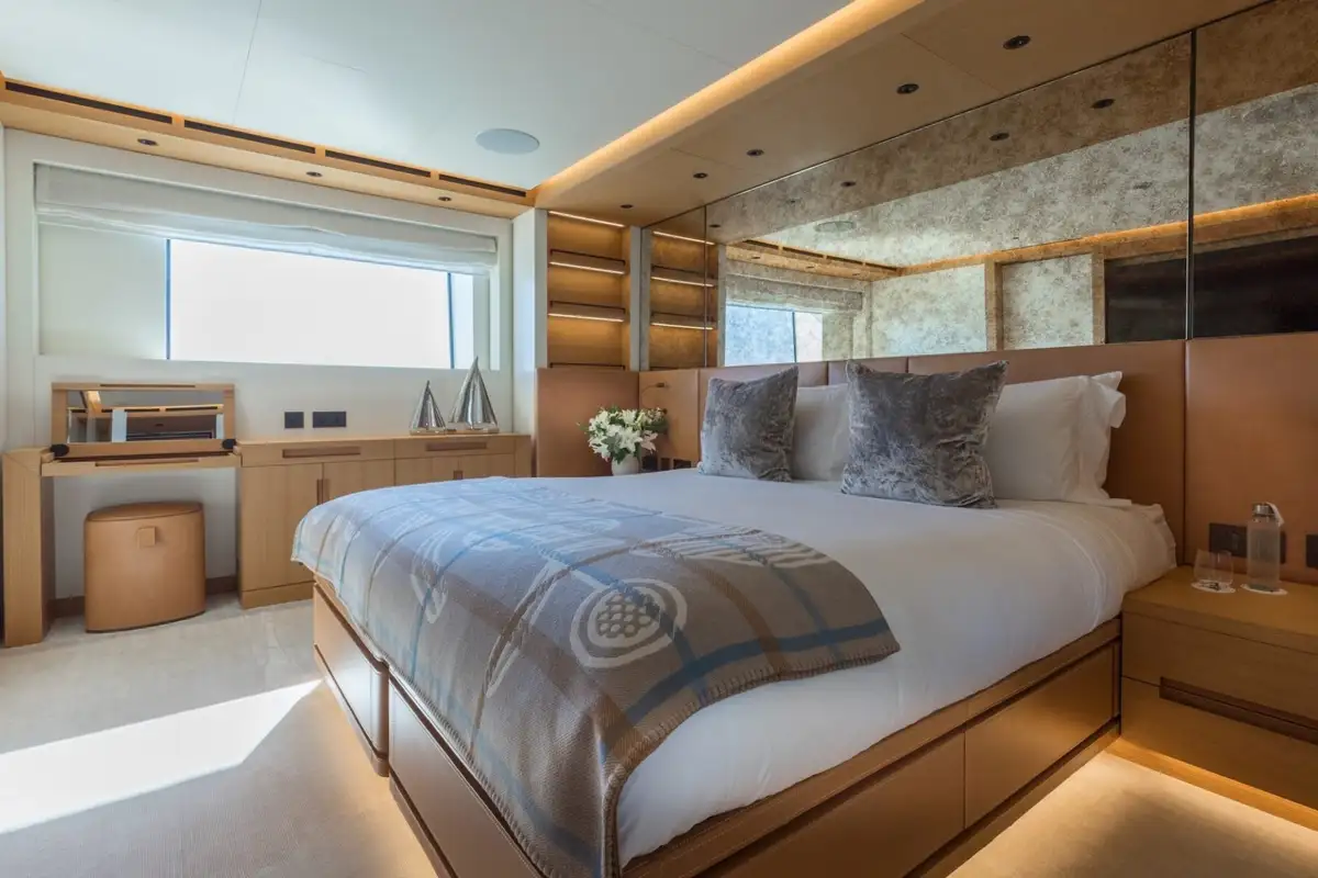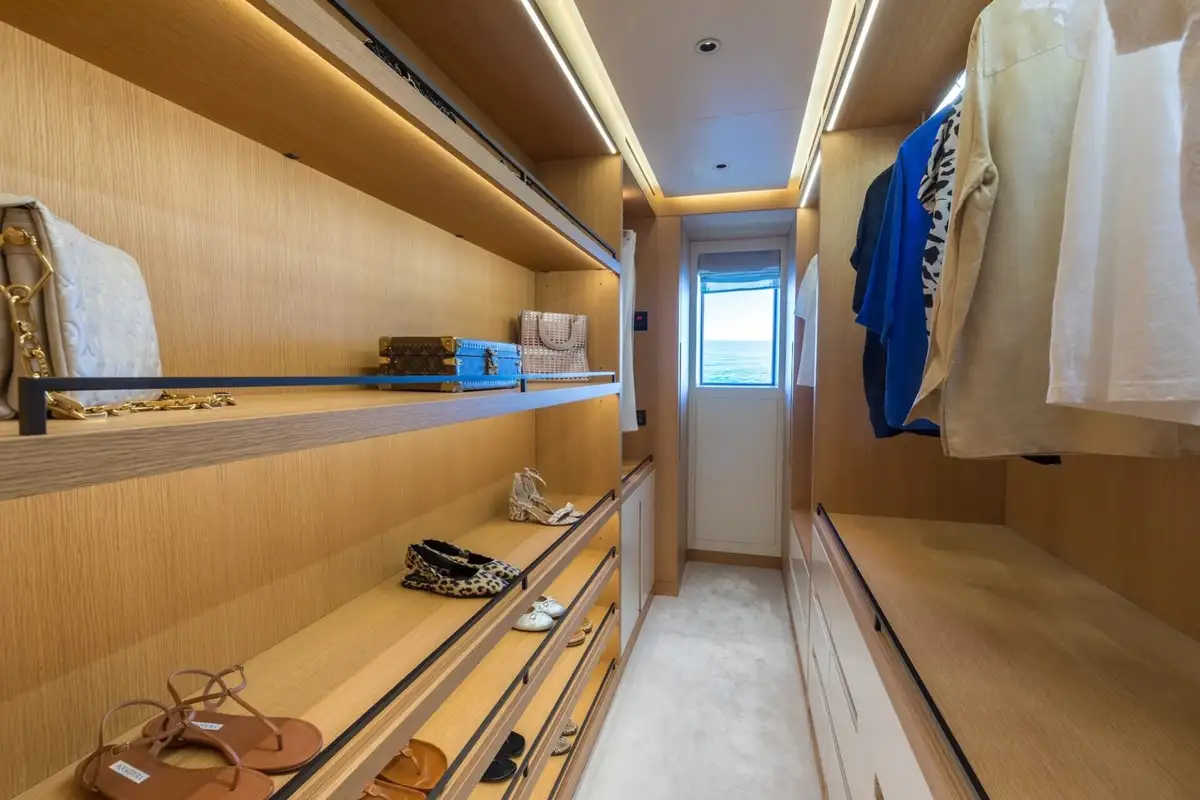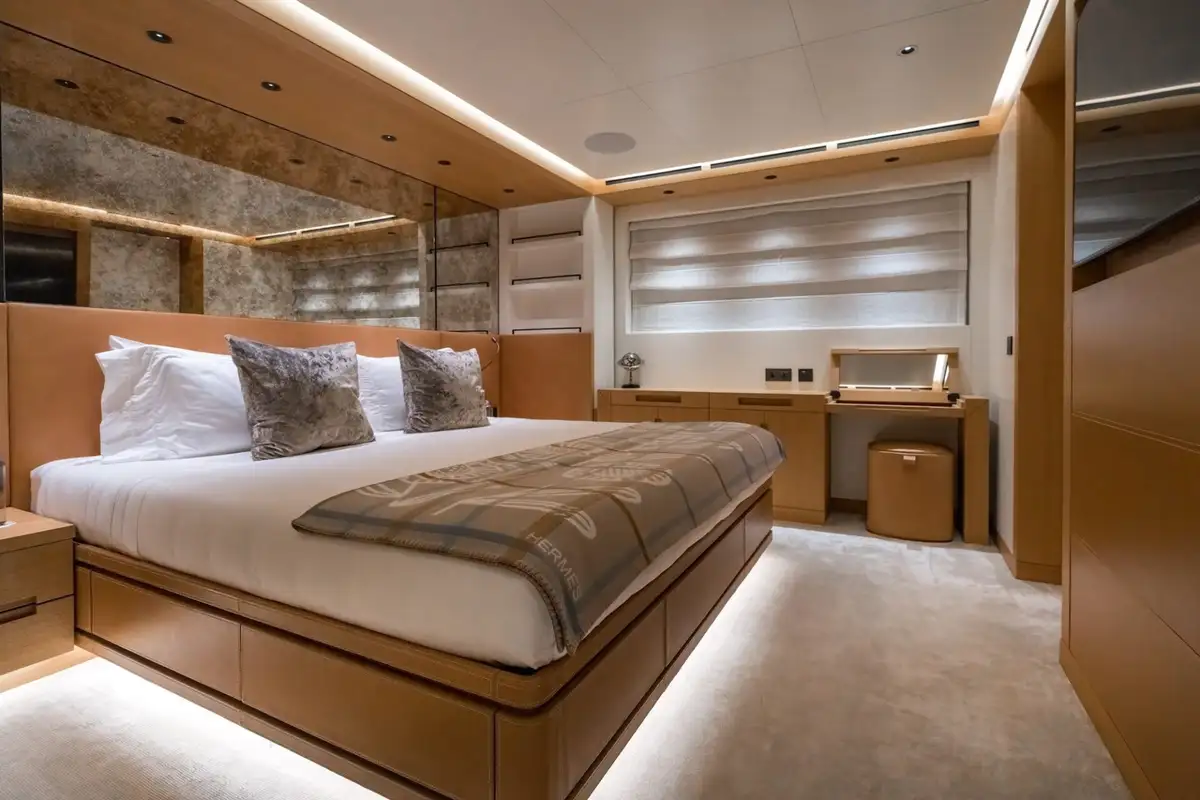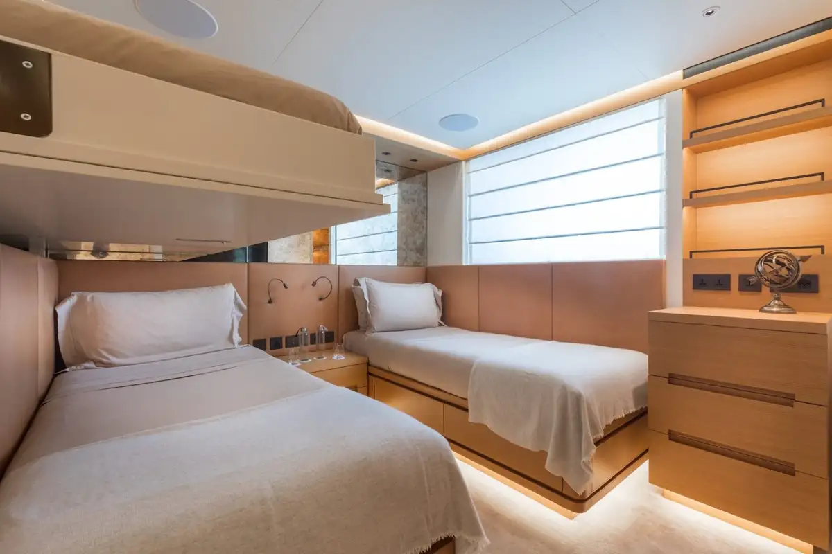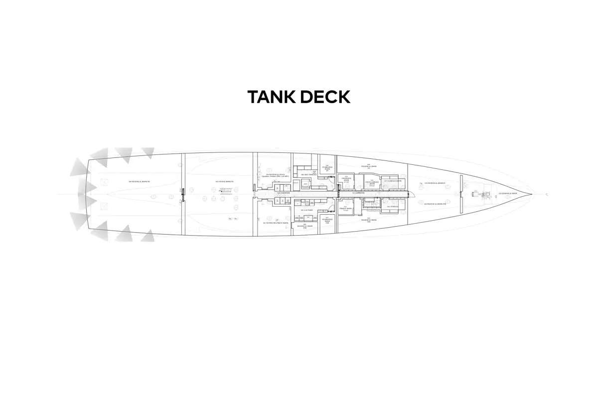 Accommodation is for 12 guests in six suites, including a full owner’s deck complete with a private study and direct exterior access. The main deck offers two VIP suites and three additional guest cabins, delivering excellent flexibility for families. The lower deck houses a professional wellness centre with gym and hammam. Crew quarters accommodate up to 16 crew, ensuring seamless service.