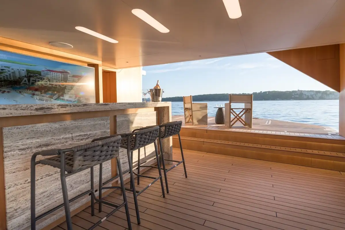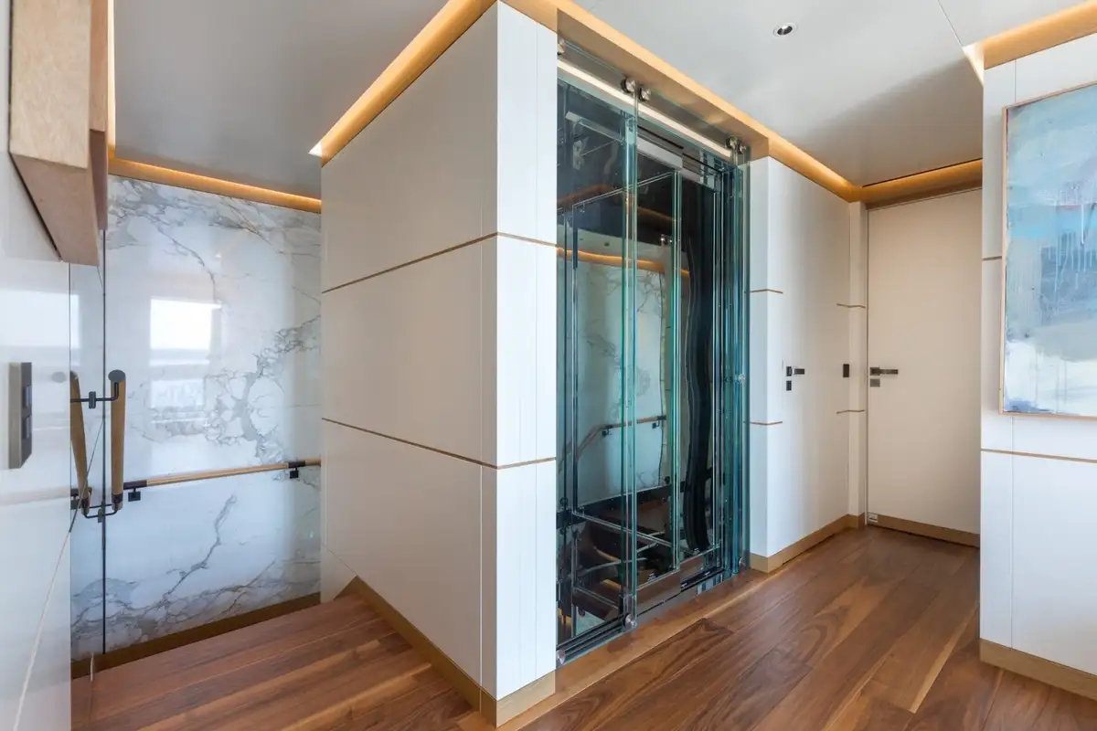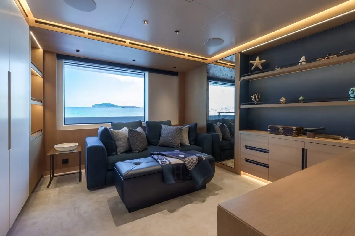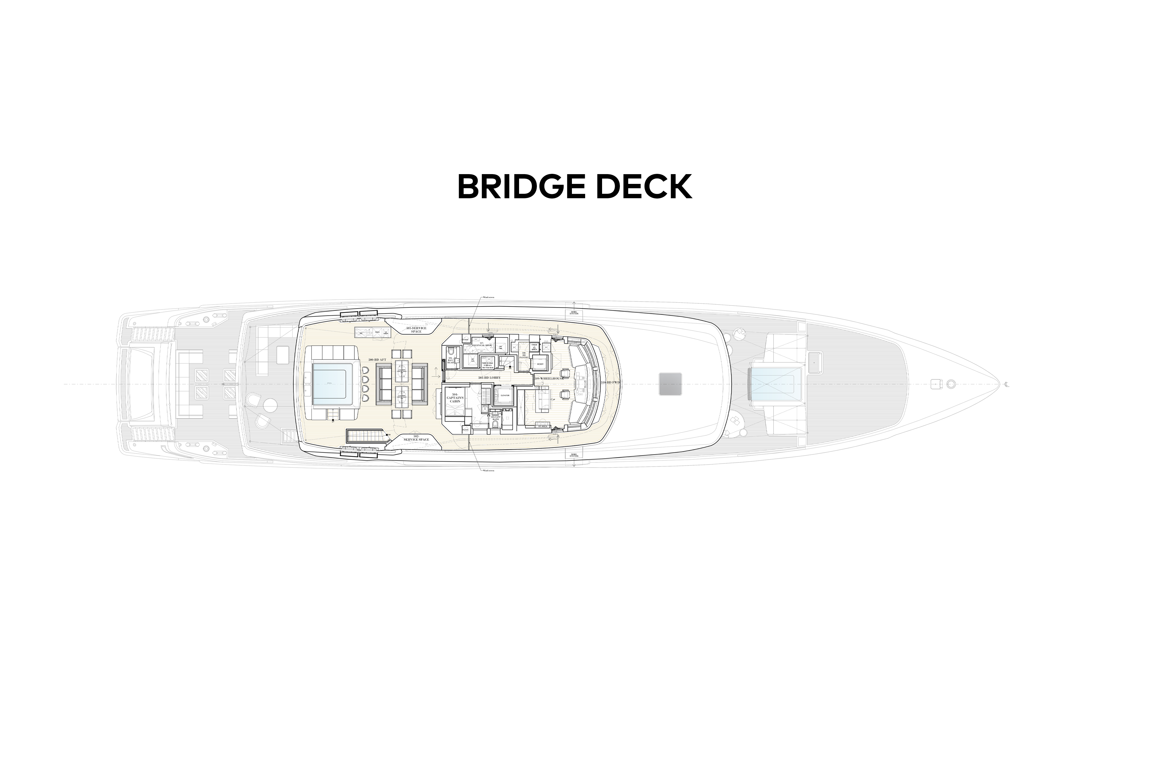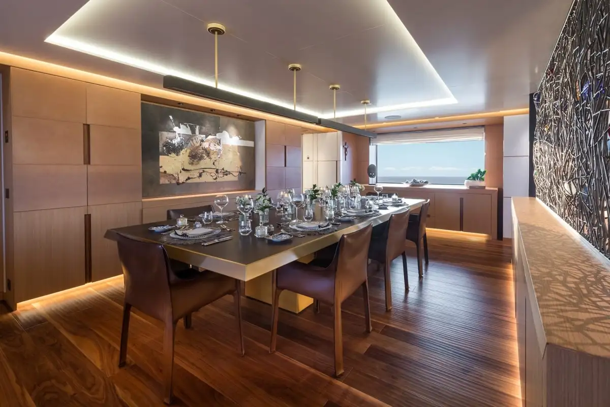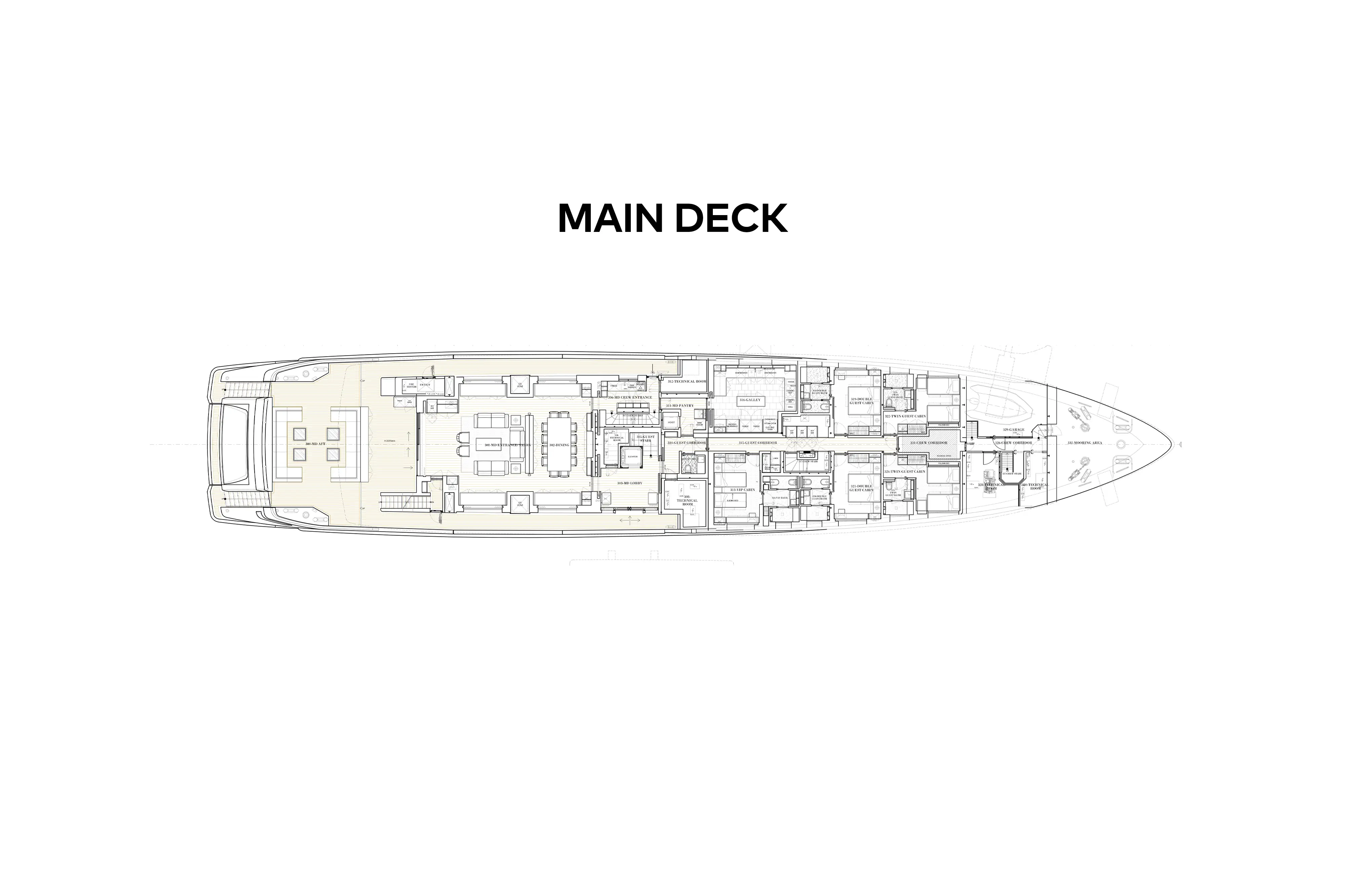 Her sophisticated and highly functional interior is defined by expansive glazing, creating a seamless connection between the living spaces and the sea. Social areas have been designed to encourage intuitive guest flow, while dedicated service routes support efficient and discreet crew operations. An internal elevator services the main deck through to the bridge deck, ensuring effortless movement and convenient access between key guest areas.