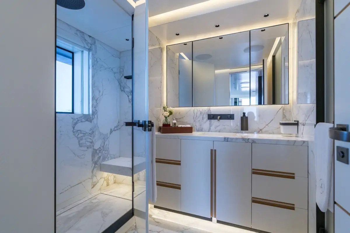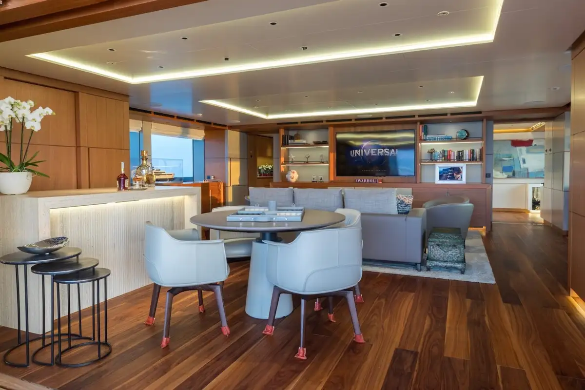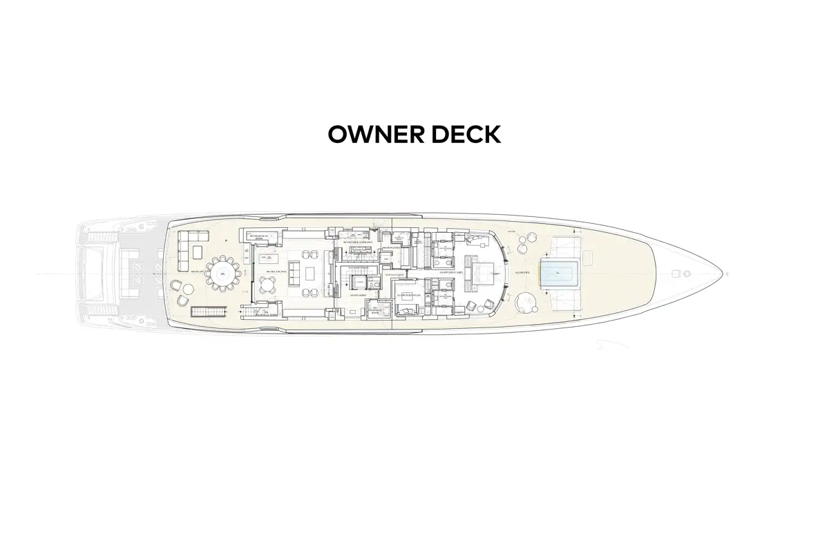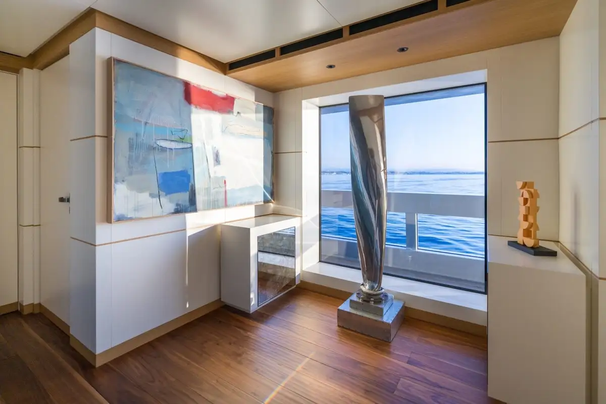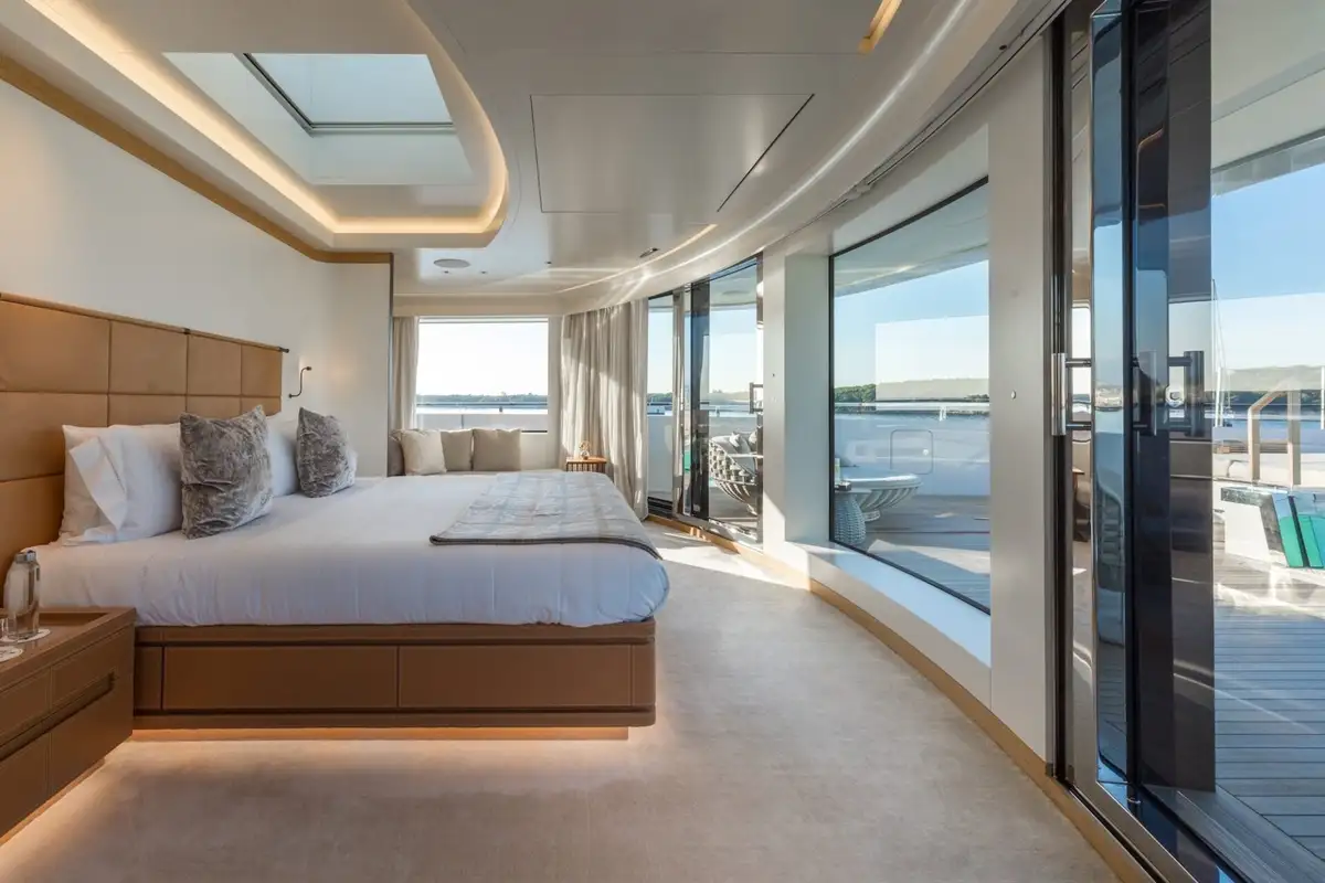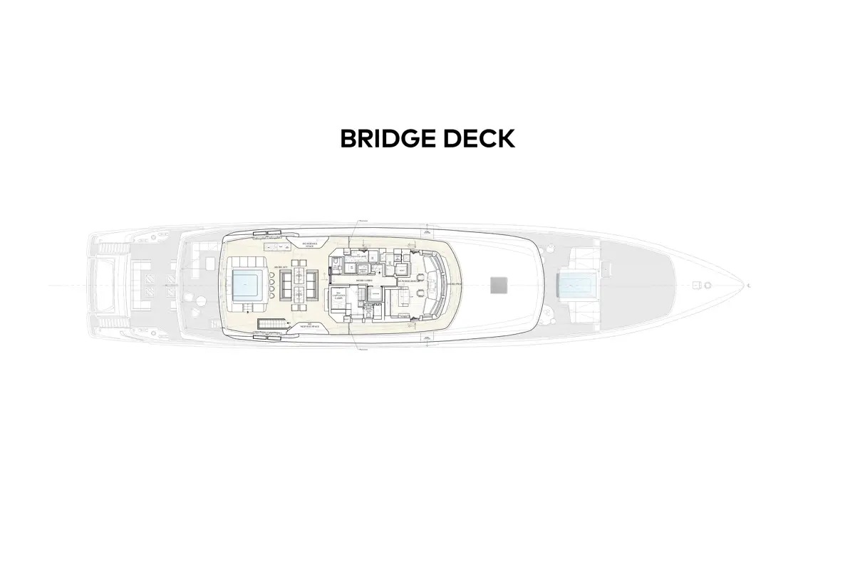 Her sophisticated and highly functional interior is defined by expansive glazing, creating a seamless connection between the living spaces and the sea. Social areas have been designed to encourage intuitive guest flow, while dedicated service routes support efficient and discreet crew operations. An internal elevator services the main deck through to the bridge deck, ensuring effortless movement and convenient access between key guest areas.