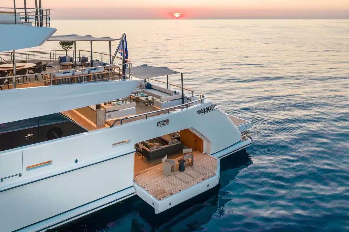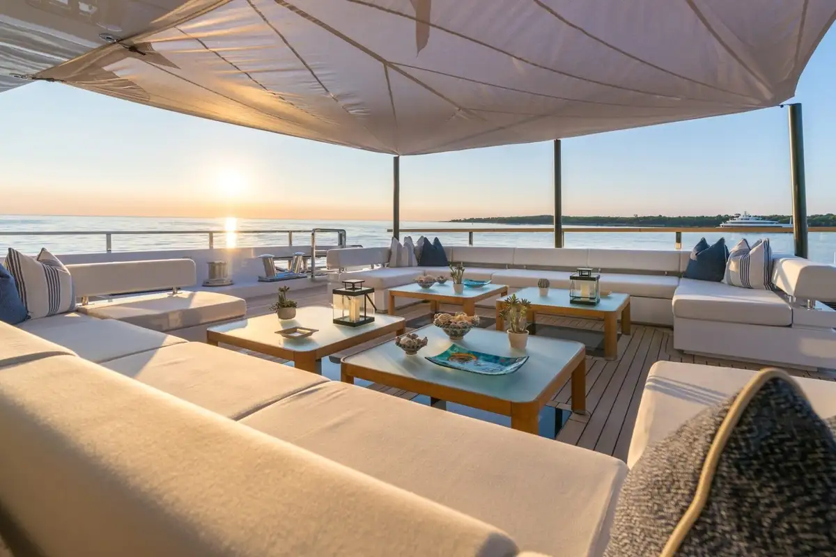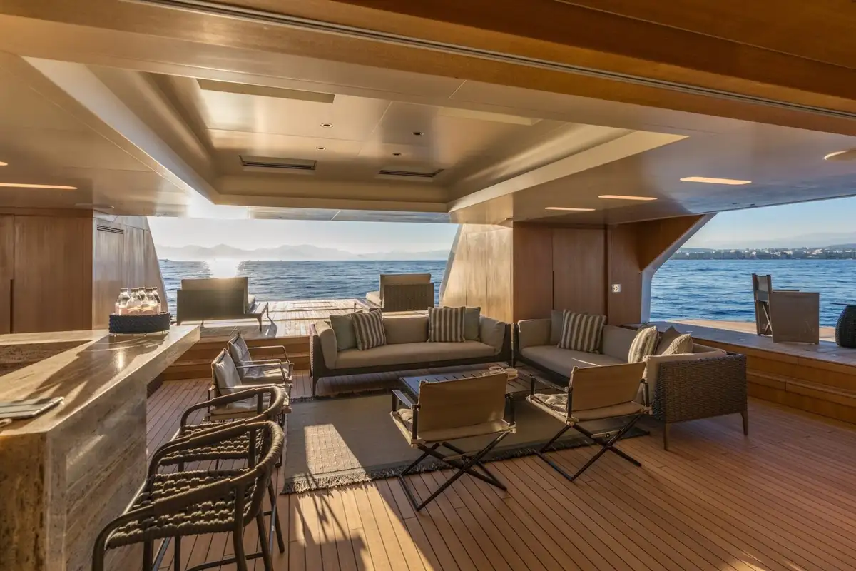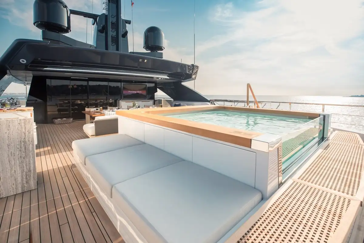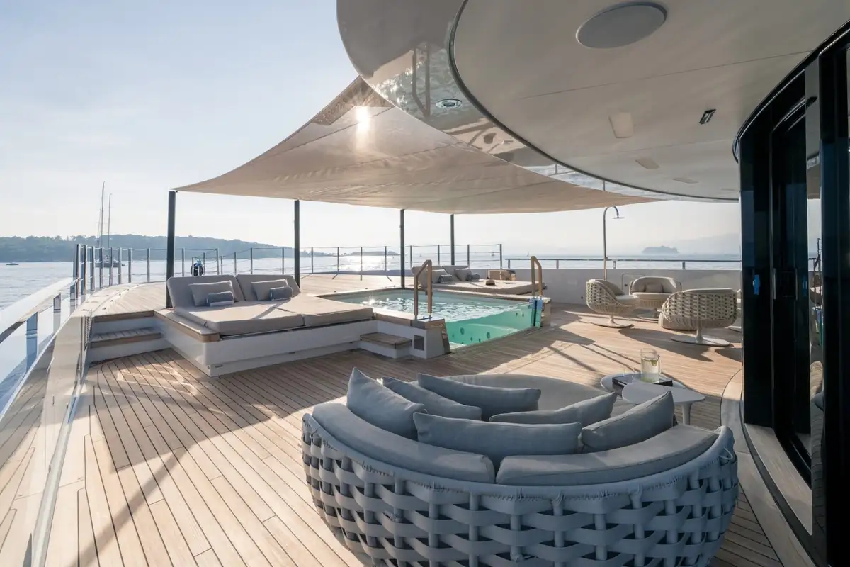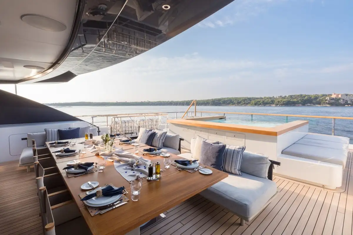 Outdoor living is central to her appeal. The expansive beach club features fold‑down platforms that open to form a generous waterside lounge with direct access to the spa and gym. The foredeck provides a secluded relaxation area, while the bridge deck hosts a substantial Jacuzzi, al fresco dining and versatile open‑air lounging.
