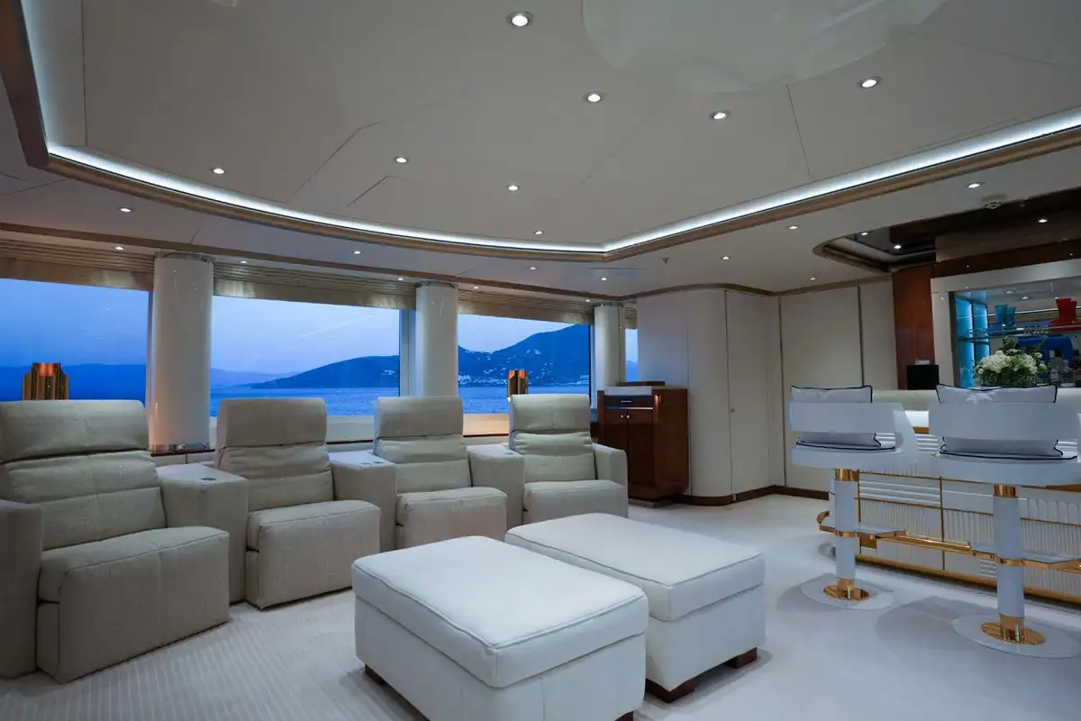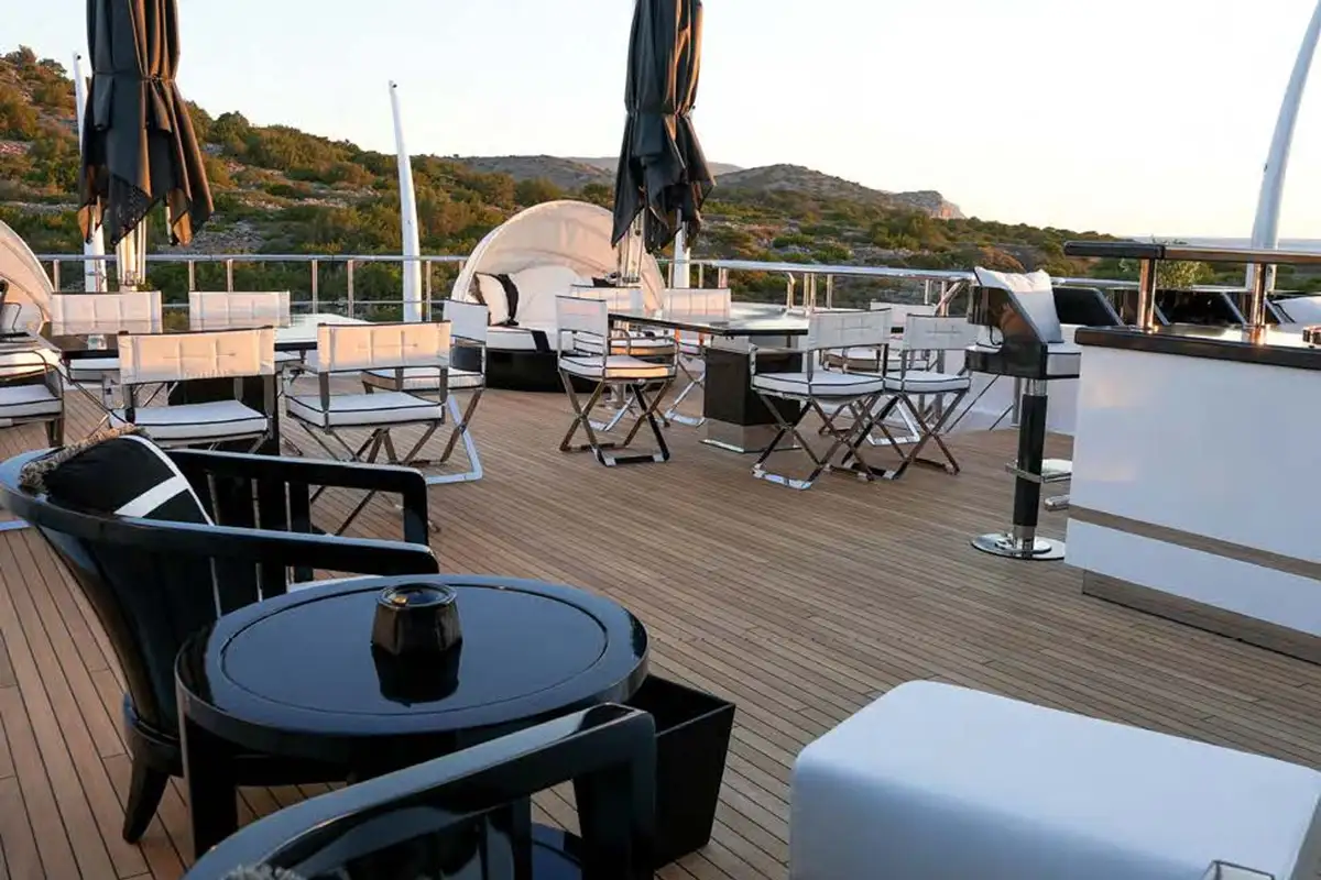 Expansive guest deck spaces include a large sun deck, around half the length of the yacht. It features a touch-and-go helipad and sun lounge with wet bar and BBQ aft. There is also an outdoor cinema, disco, a large glass-backed jacuzzi with sunpads forward and climate-controlled gym beneath the hardtop.