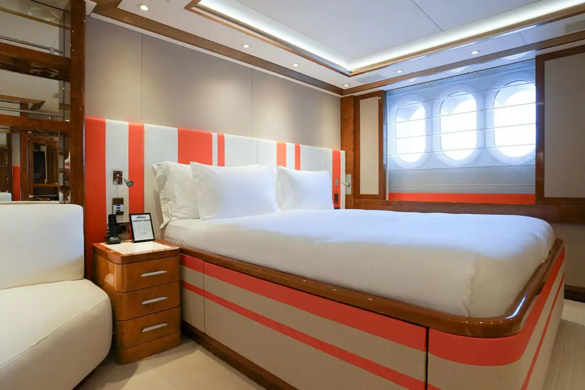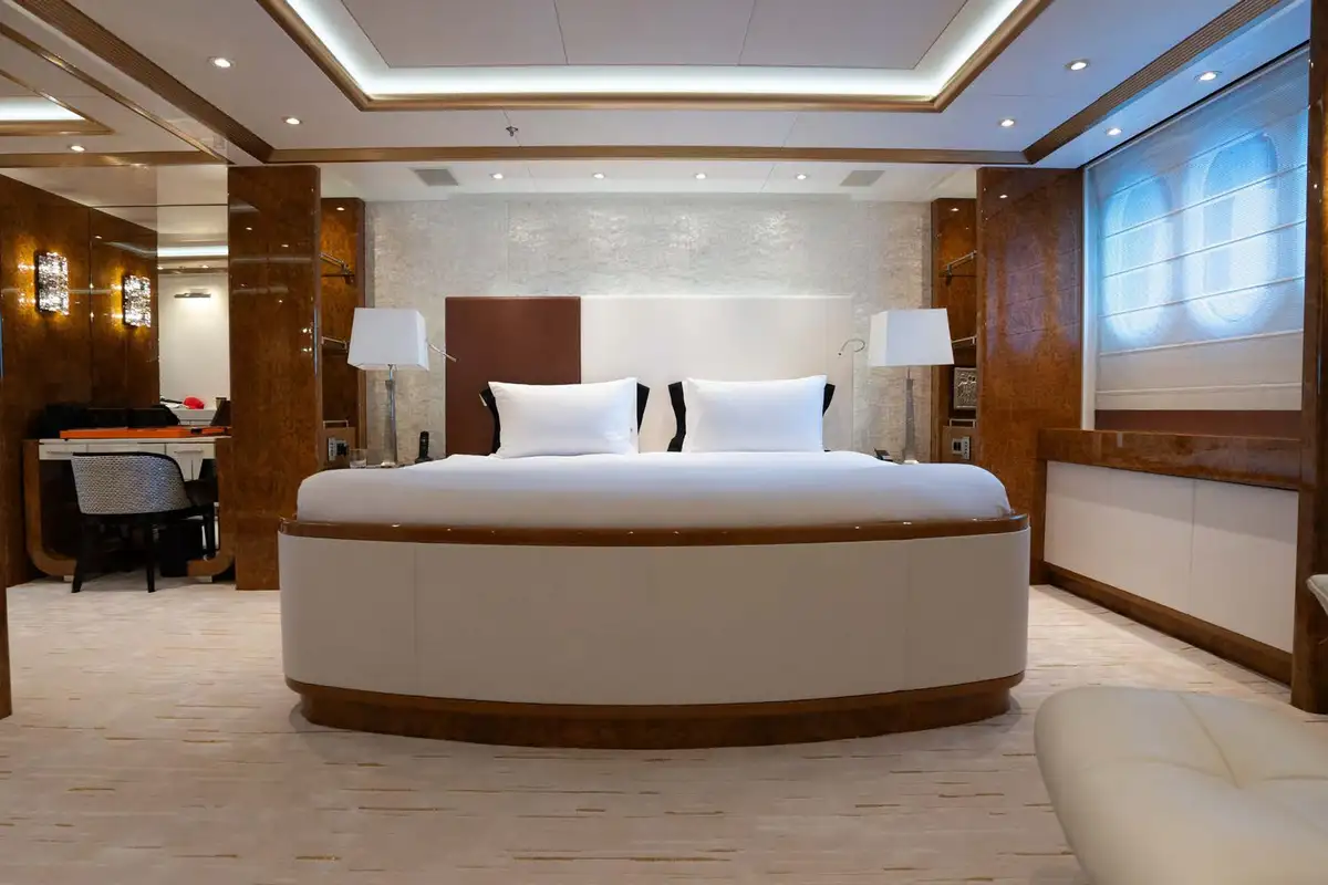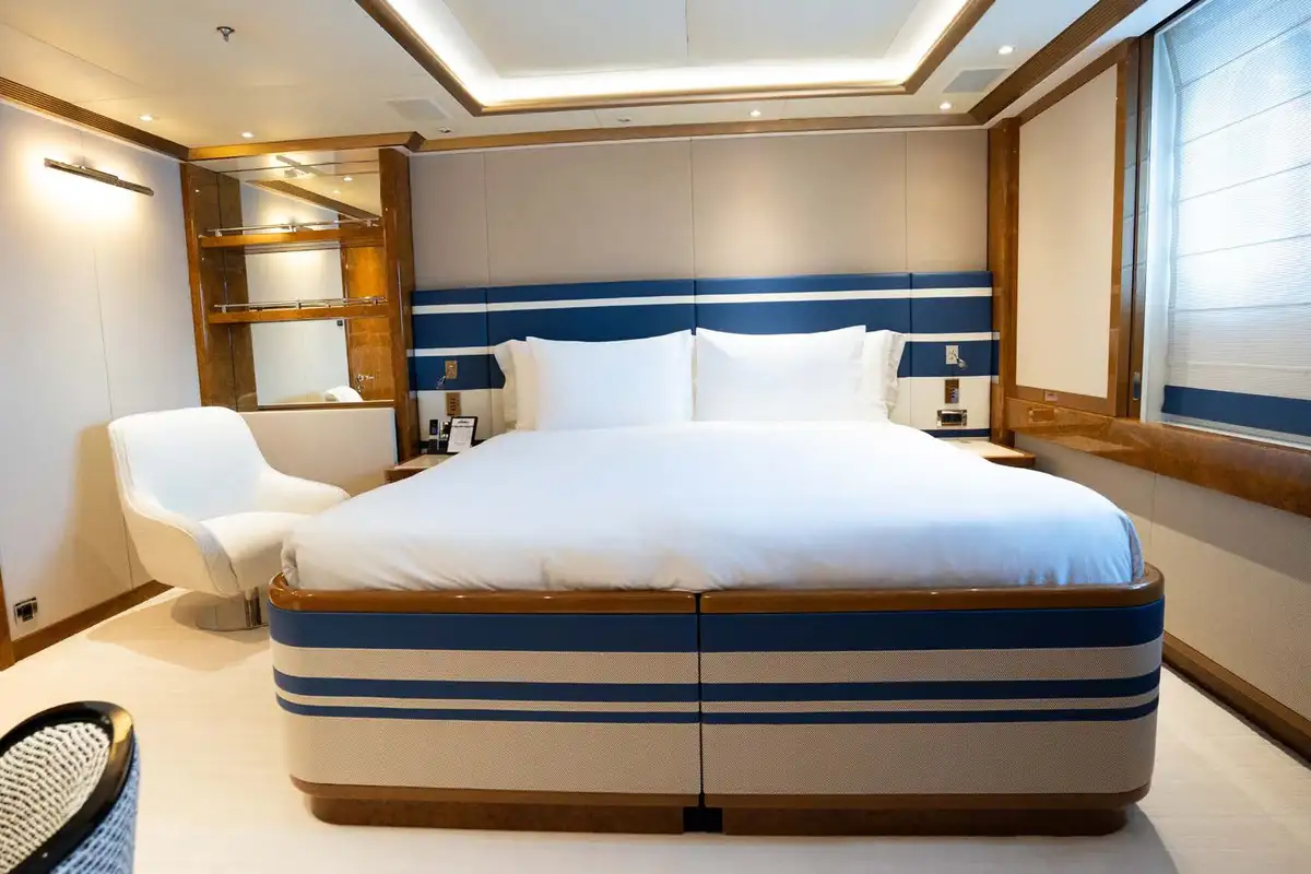 She welcomes 12 guests in six suites, the pick of which is the duplex owner's suite with private observation lounge forward on the main deck. There is also access to a private foredeck terrace. Three further double suites and two twin suites complete her accommodation, and she also sleeps up to 14 crew.