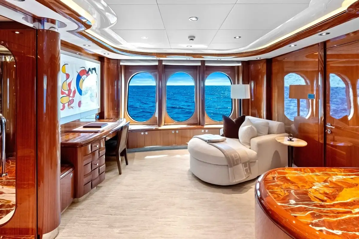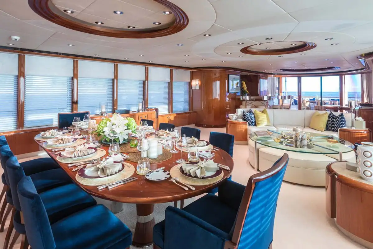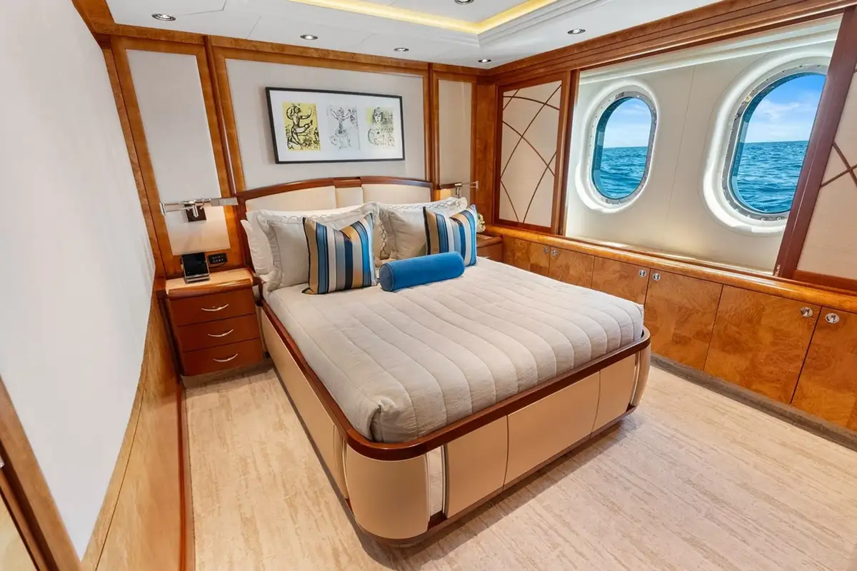 Accommodation for eleven guests in five luxurious staterooms that all feature fine marble as well as elegant cherry and maple burl woods throughout this spectacular yacht, with a serene and modern interior decor.