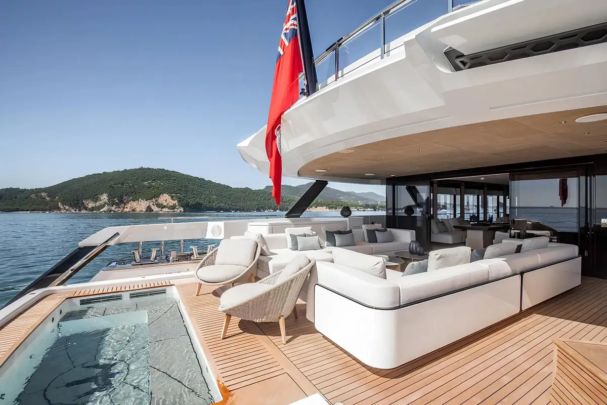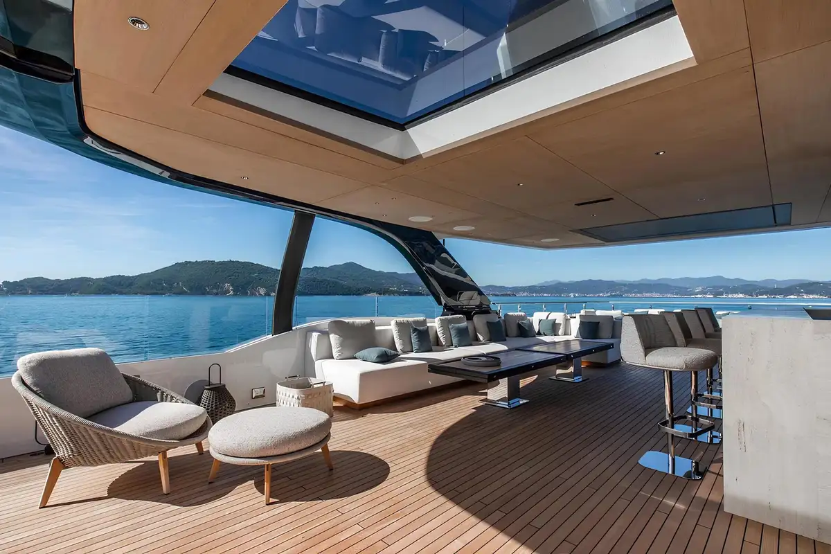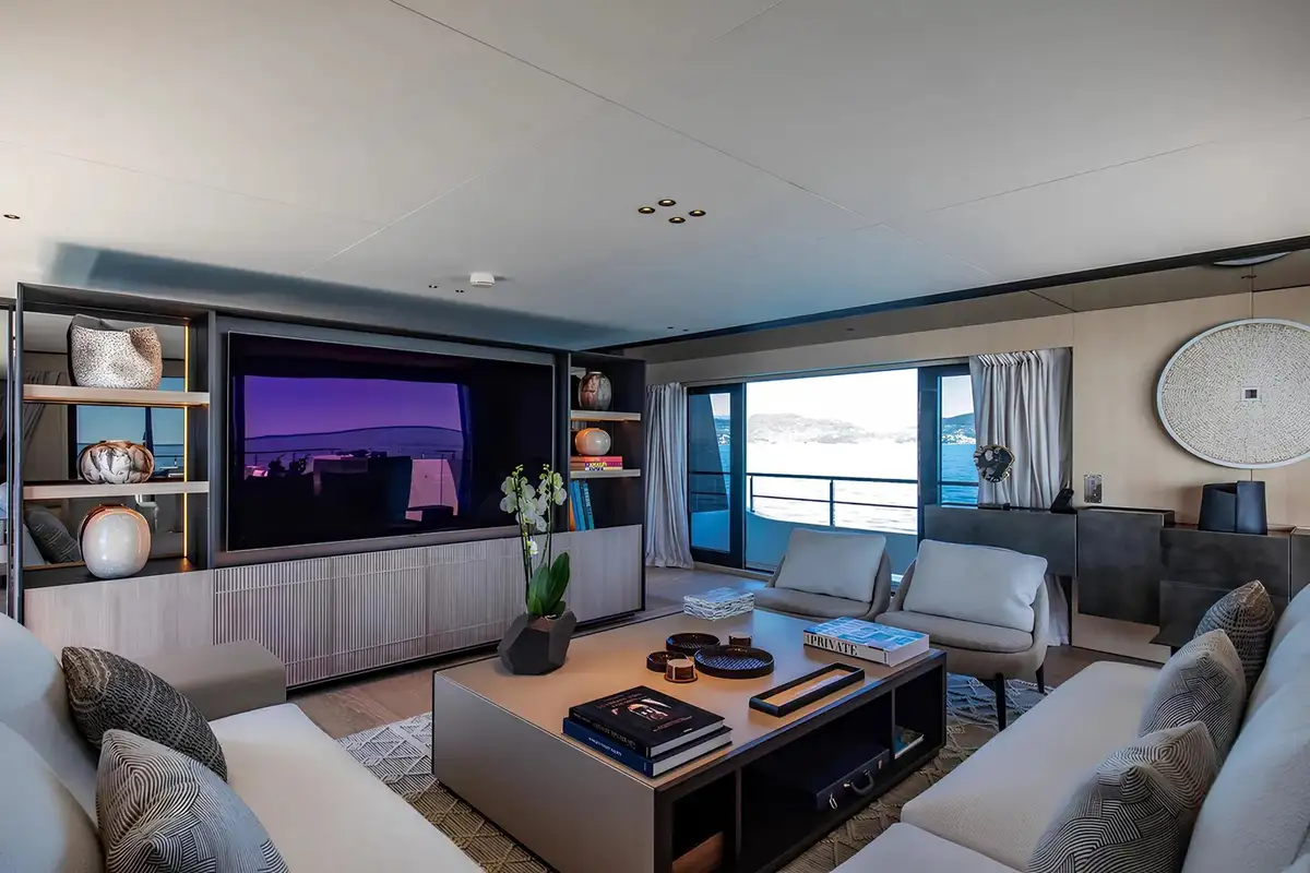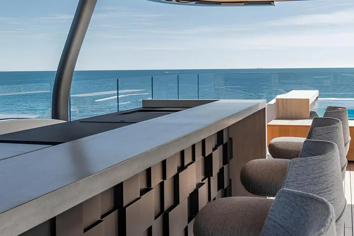 Exterior spaces are equally impressive. Expansive decks feature built-in furniture with integrated storage, a stern pool with a lifting floor, and a second custom-made Jacuzzi on the forward sun deck. Alfresco dining options are available on both the upper deck and sun deck, providing ideal settings for outdoor entertainment. The sun deck is also equipped with a large drop-down 85” TV that rotates 360 degrees - perfect for movie nights or watching live events.