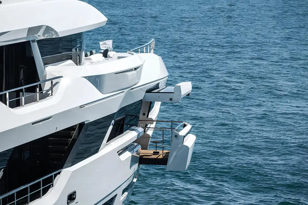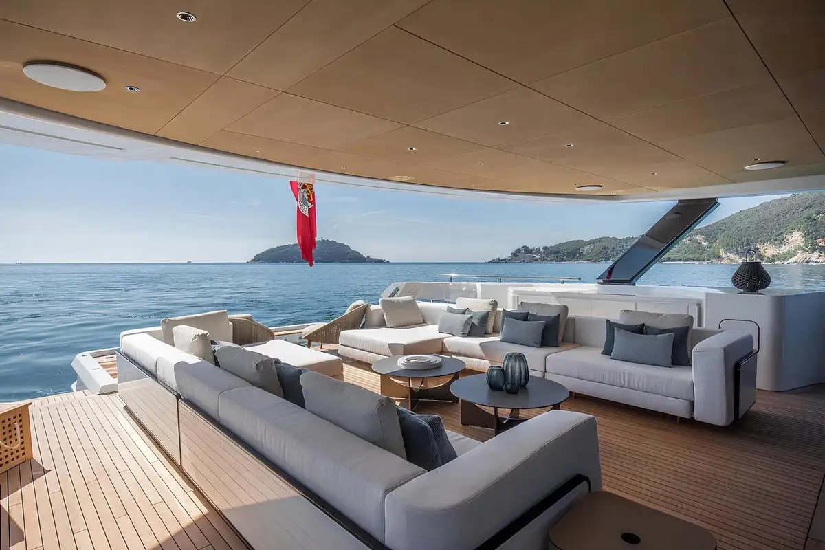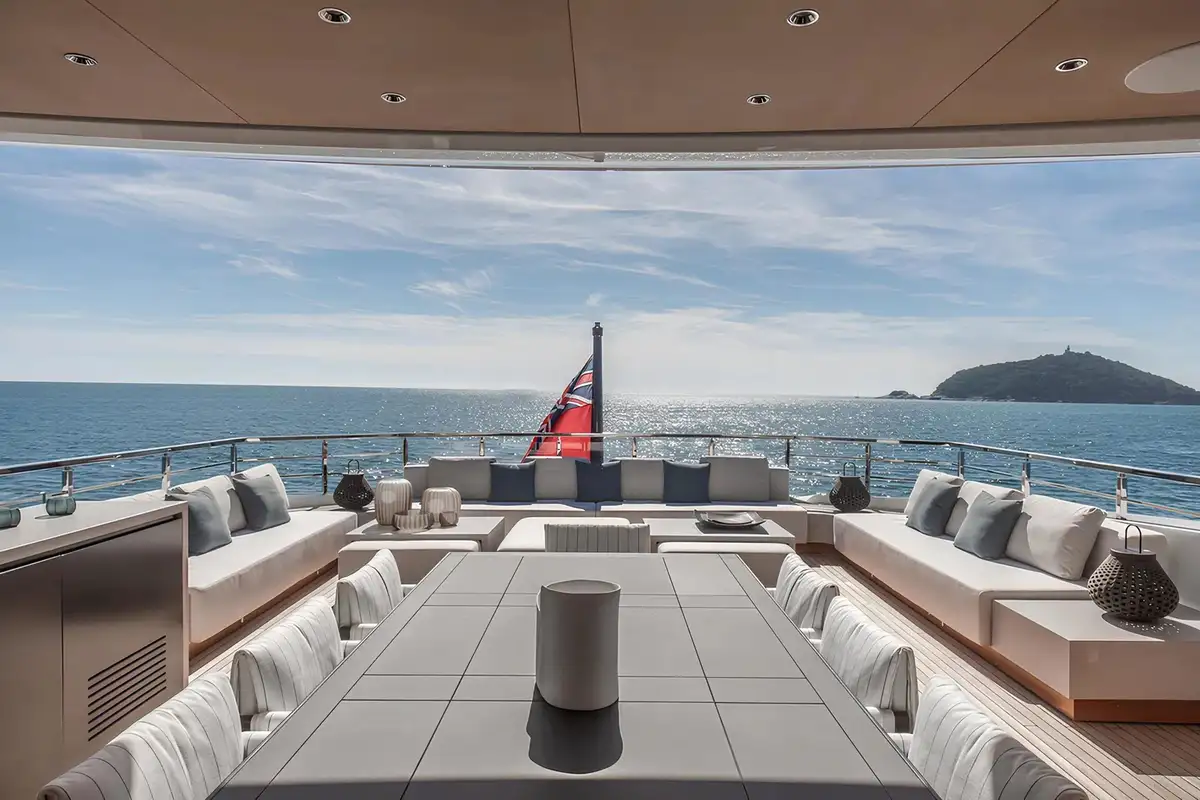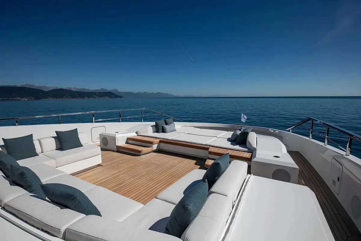 Exterior spaces are equally impressive. Expansive decks feature built-in furniture with integrated storage, a stern pool with a lifting floor, and a second custom-made Jacuzzi on the forward sun deck. Alfresco dining options are available on both the upper deck and sun deck, providing ideal settings for outdoor entertainment. The sun deck is also equipped with a large drop-down 85” TV that rotates 360 degrees - perfect for movie nights or watching live events.