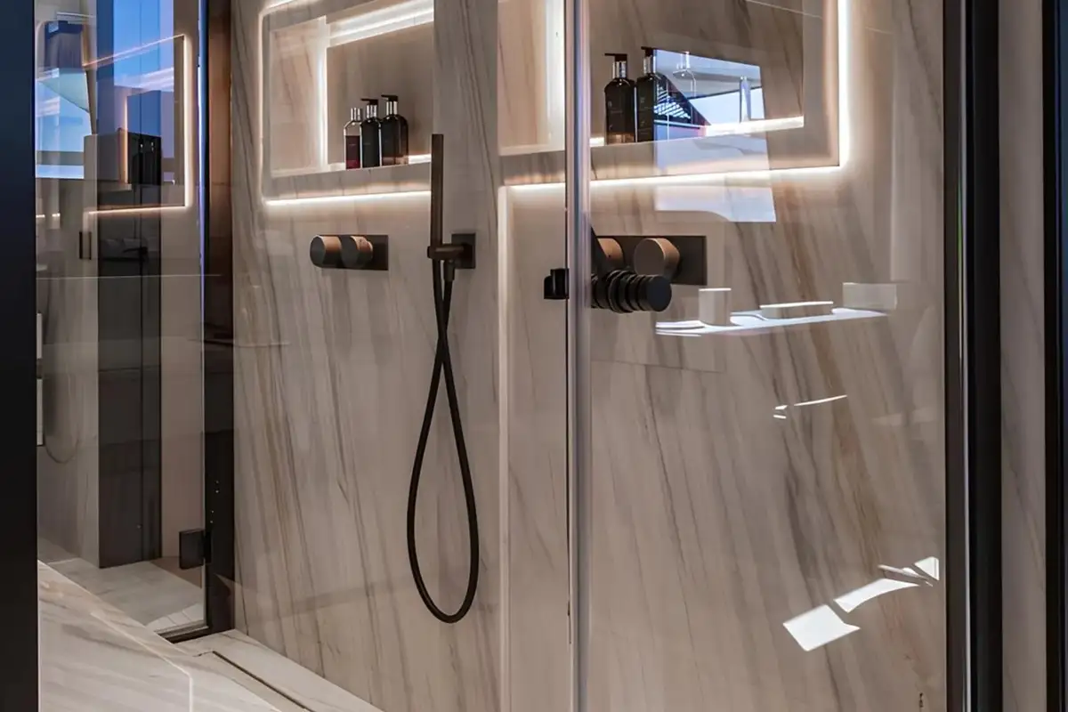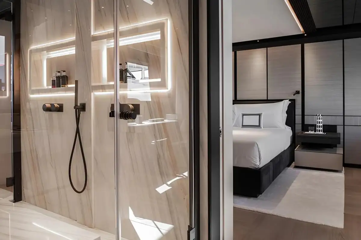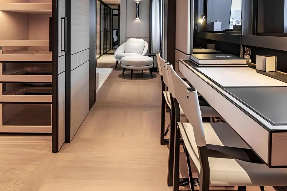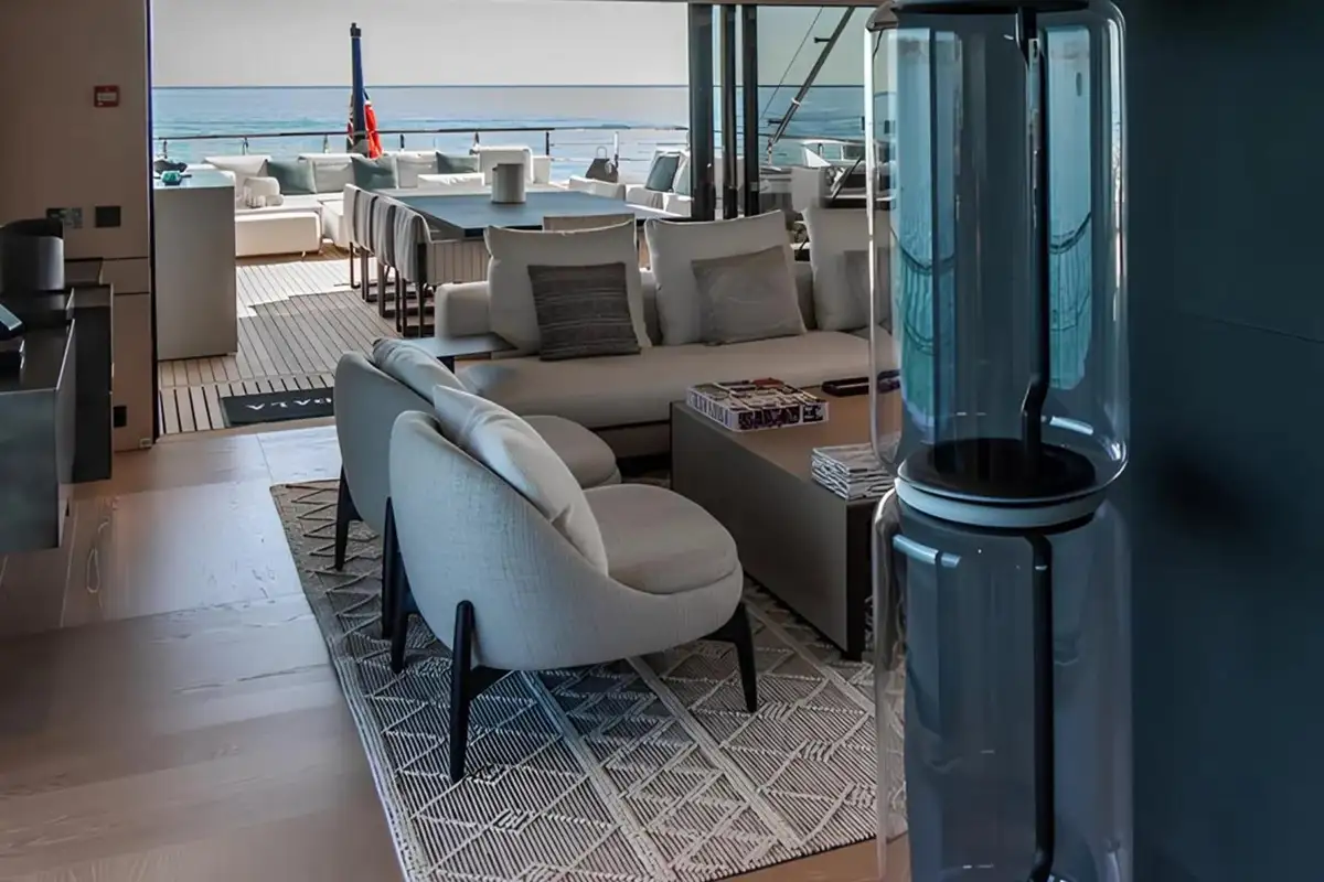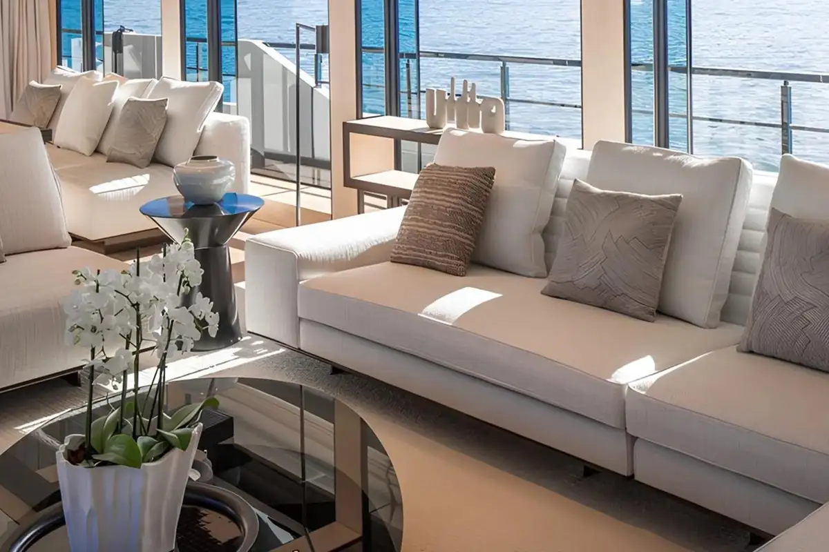 The interior design by Cassetta Yacht Designers is sophisticated, contemporary, and refined. Full-height windows flood the main deck with natural light and offer panoramic views, seamlessly connecting indoor and outdoor areas. Smart design elements, such as mirrored ceilings and mullions in the main deck salon, enhance the sense of space. Custom-made furnishings, leathers, fabrics, upgraded stones, and high-end lighting fixtures contribute to an elevated and luxurious onboard atmosphere.