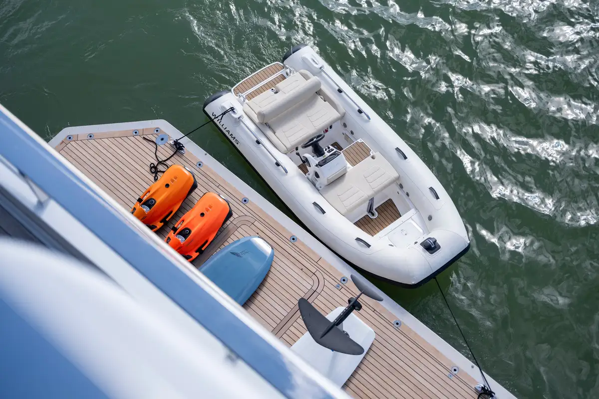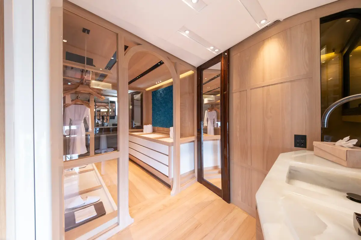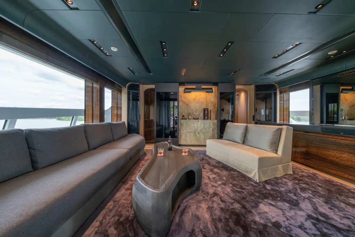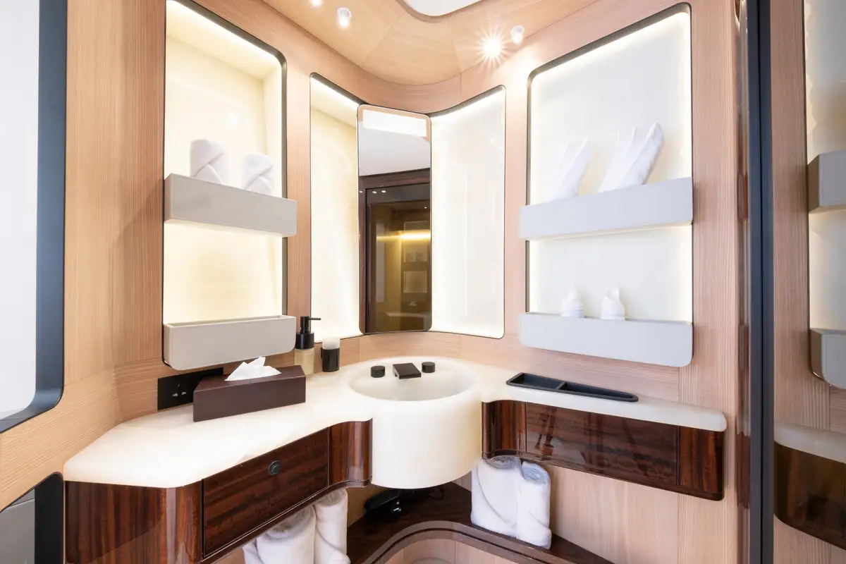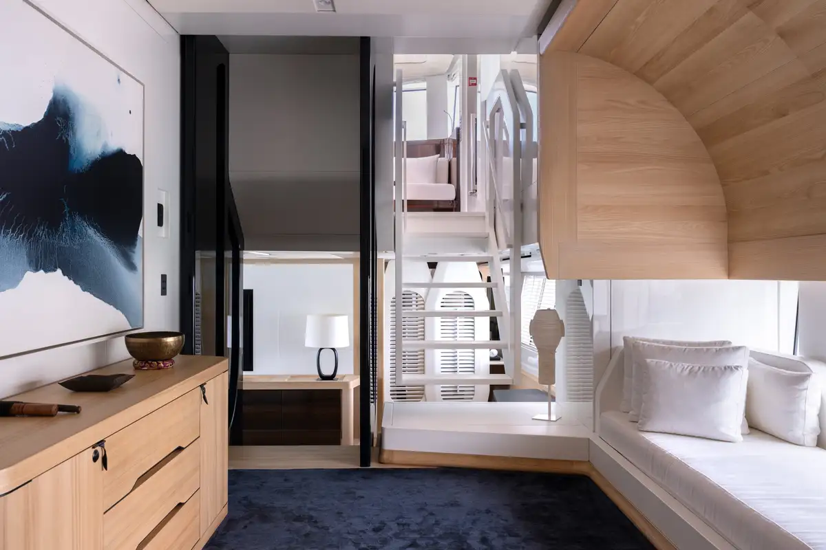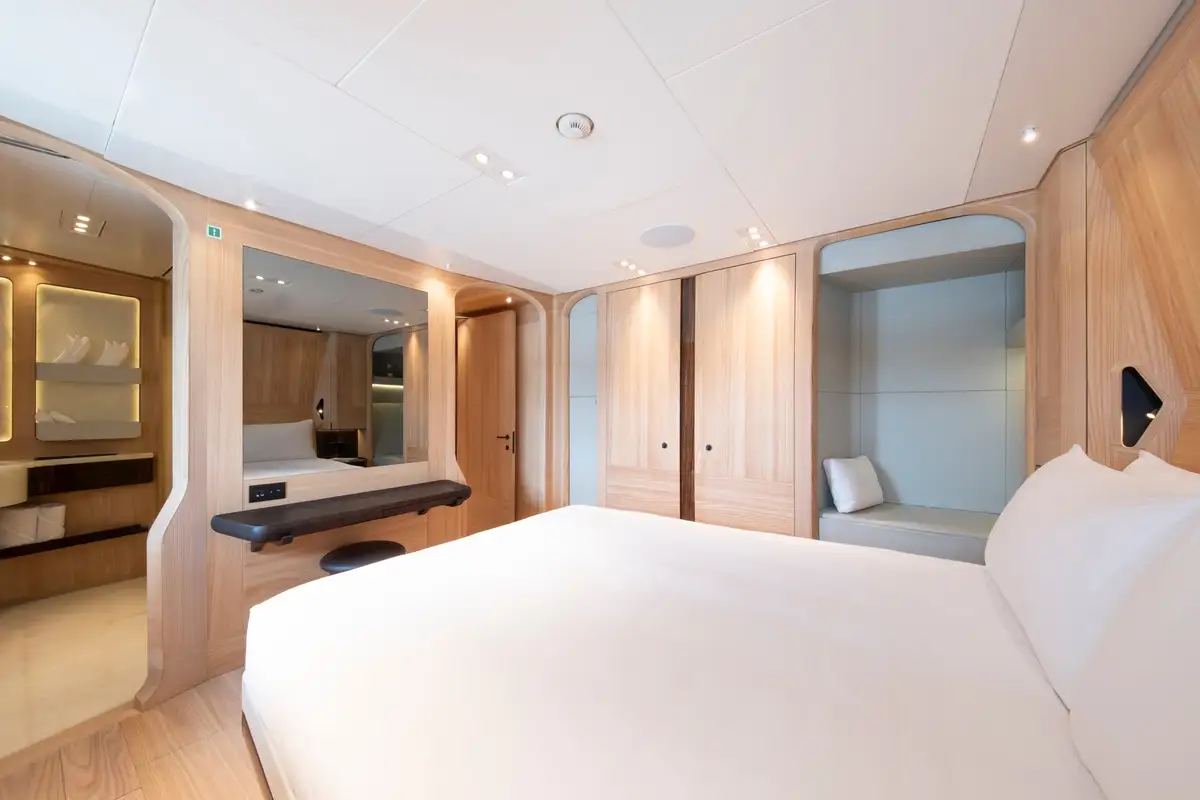 Her interior and deck spaces have been thoughtfully designed for both family enjoyment and guest entertainment, with a spacious main salon, elegant dining areas inside and out, and an inviting owner’s suite forward on the main deck. On the lower deck, a 65-square-meter beach club with gym opens on three sides to create a seamless connection to the sea, complemented by four well-appointed guest cabins for extended stays onboard. The expansive, multi-level master suite and a custom jacuzzi on the owner’s forward deck further elevate her appeal.