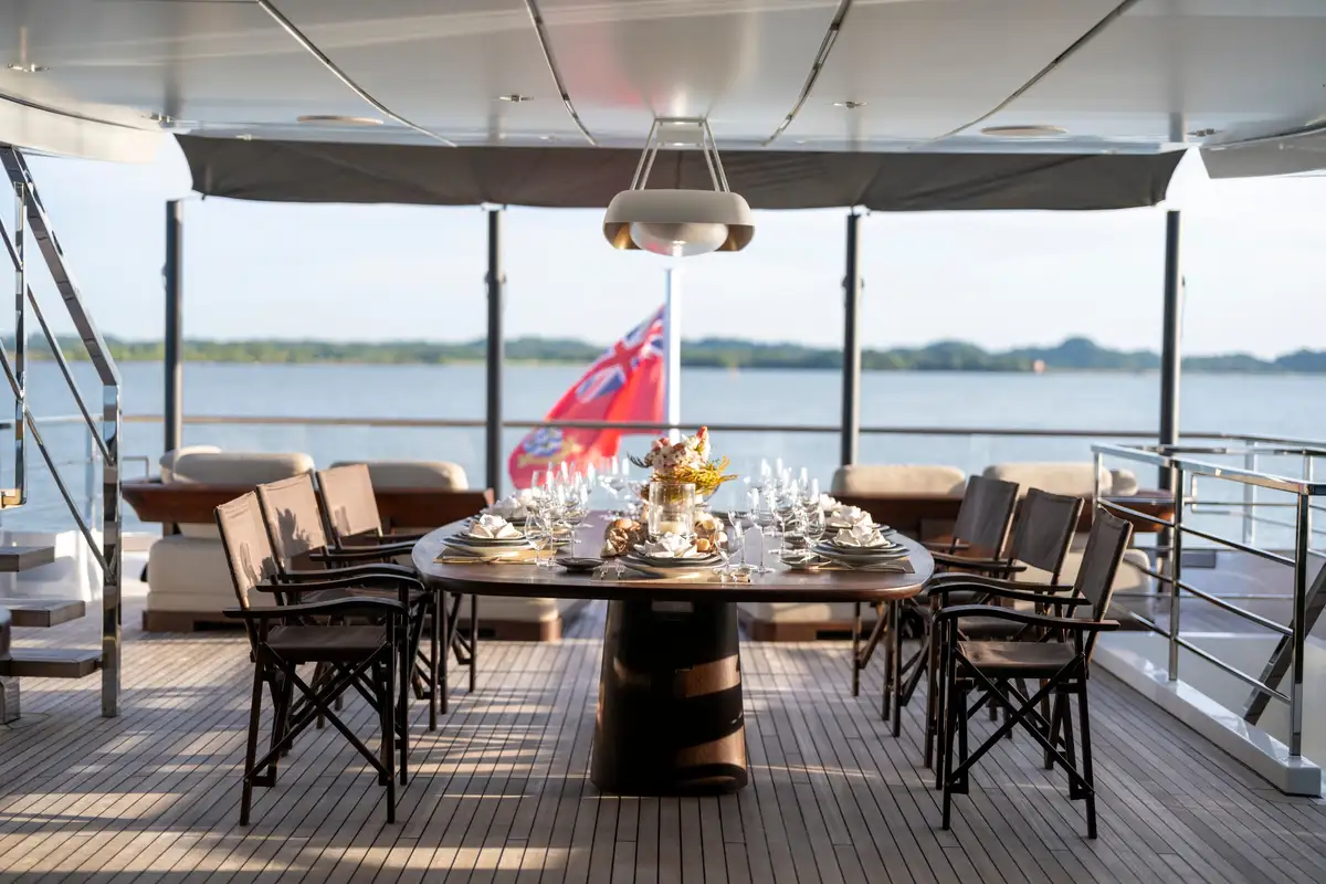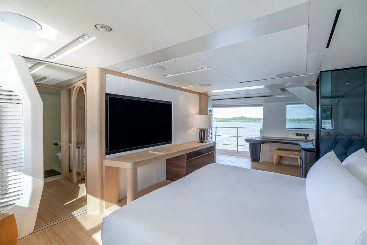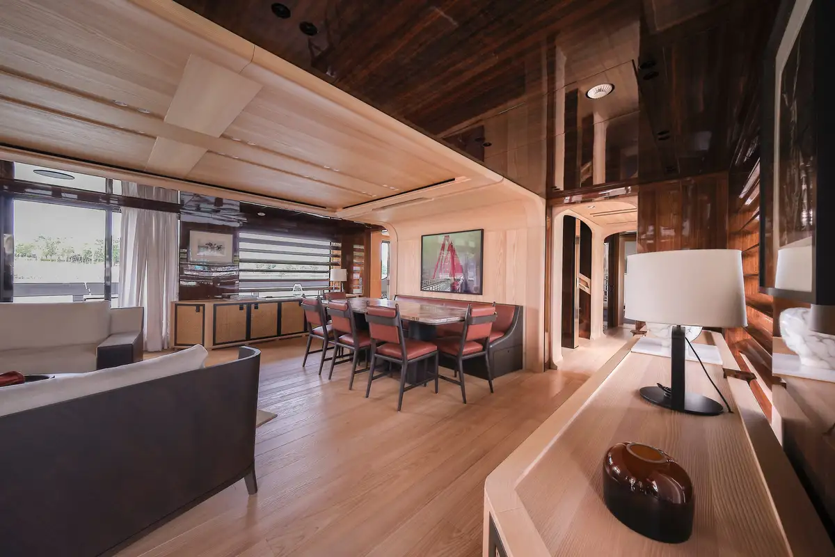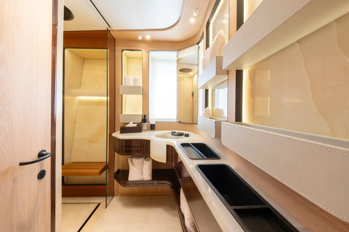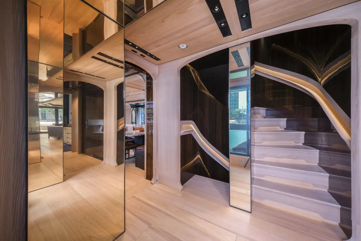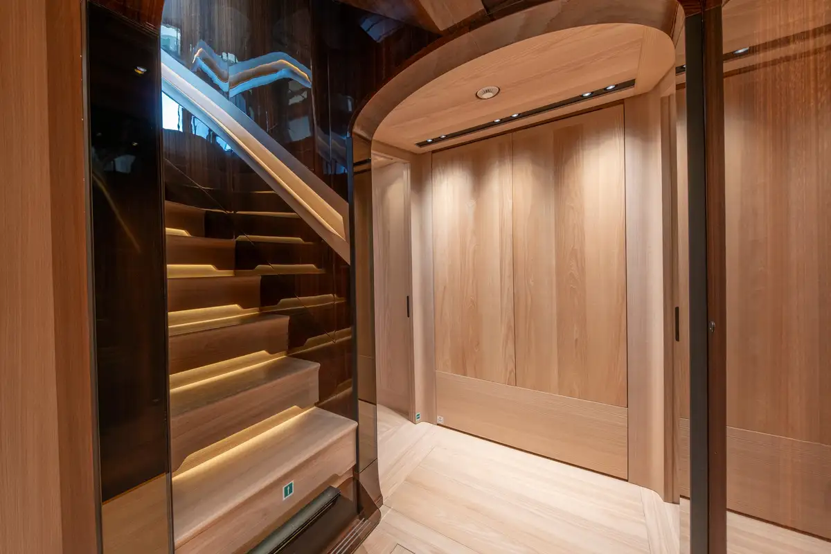 Her interior and deck spaces have been thoughtfully designed for both family enjoyment and guest entertainment, with a spacious main salon, elegant dining areas inside and out, and an inviting owner’s suite forward on the main deck. On the lower deck, a 65-square-meter beach club with gym opens on three sides to create a seamless connection to the sea, complemented by four well-appointed guest cabins for extended stays onboard. The expansive, multi-level master suite and a custom jacuzzi on the owner’s forward deck further elevate her appeal.