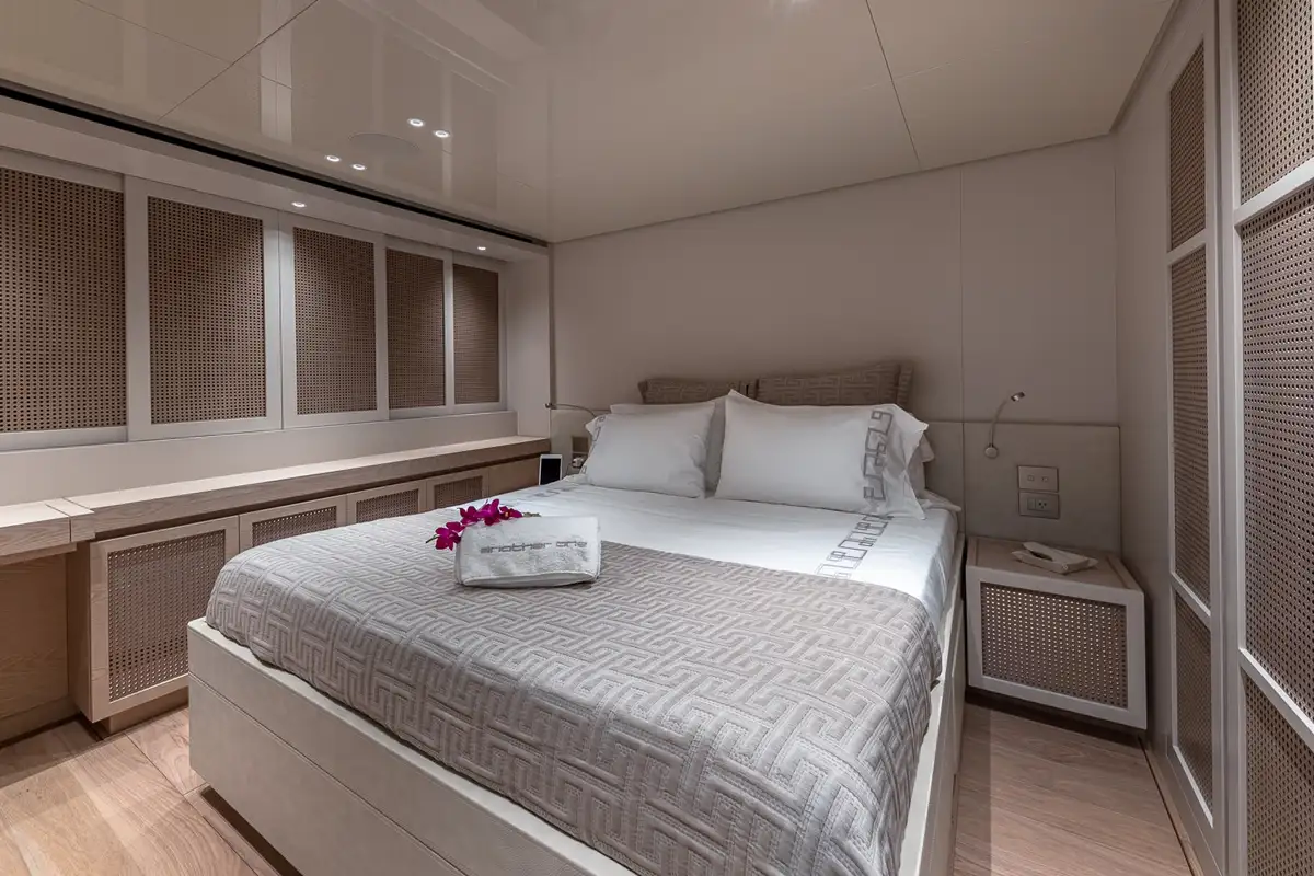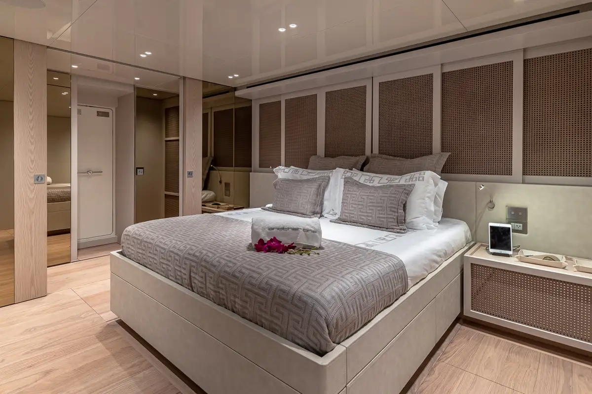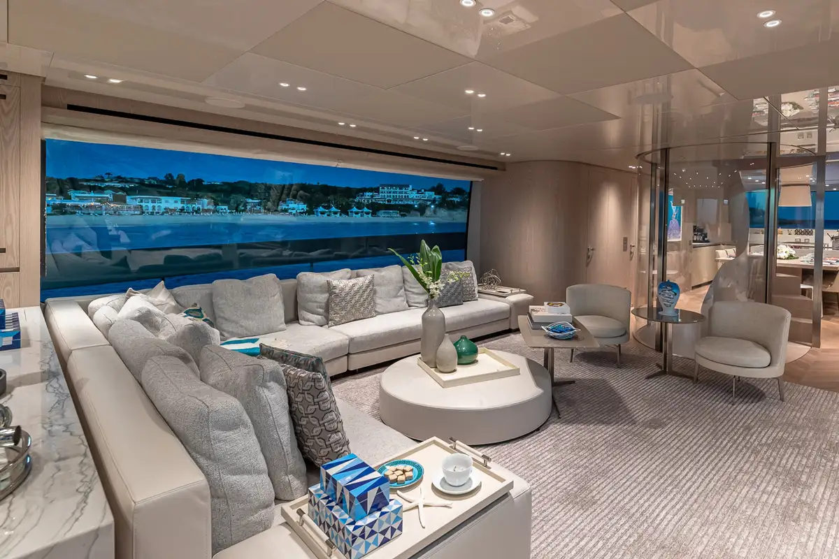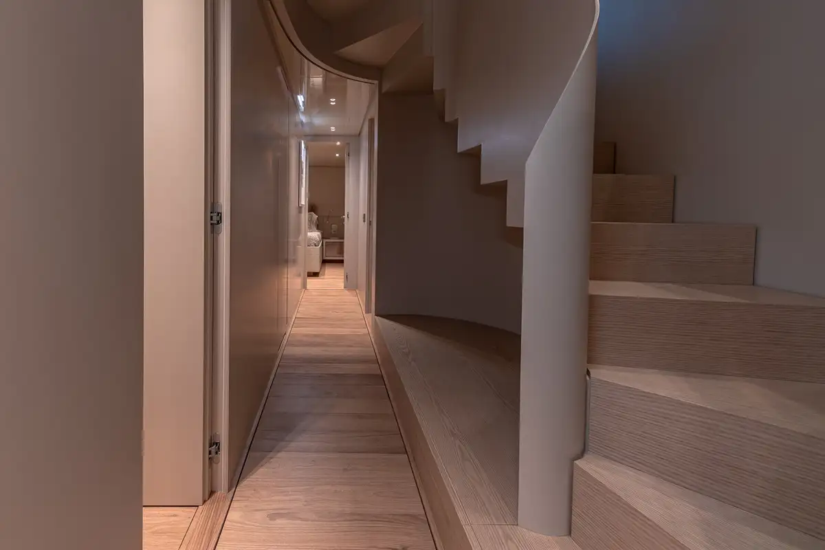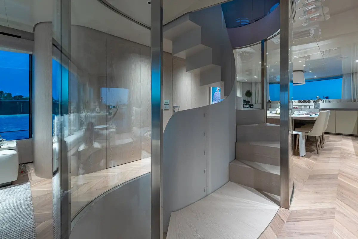 Her modern and elegant interior was conceived by Lissoni Associati and features soft and neutral finishes throughout. The open-plan main deck has a family-style galley and dining area forward, dayhead to starboard with sidedeck access, a spacious main saloon aft and sliding glass doors leading out to the aft deck lounge. The central staircase is an architectural work of art that seamlessly connects all three decks. Accommodation for nine guests can be found on the lower deck including the owner's suite, two double cabins, and a twin cabin, all en suite.