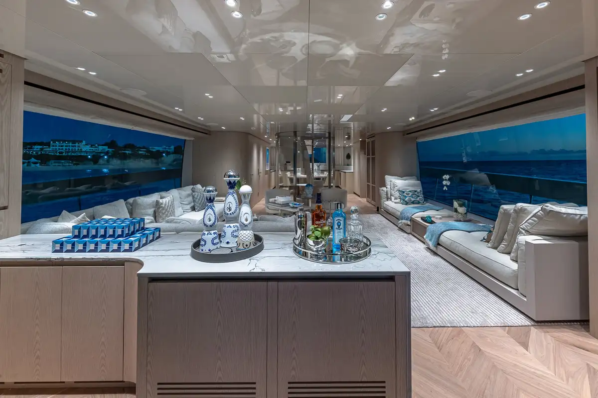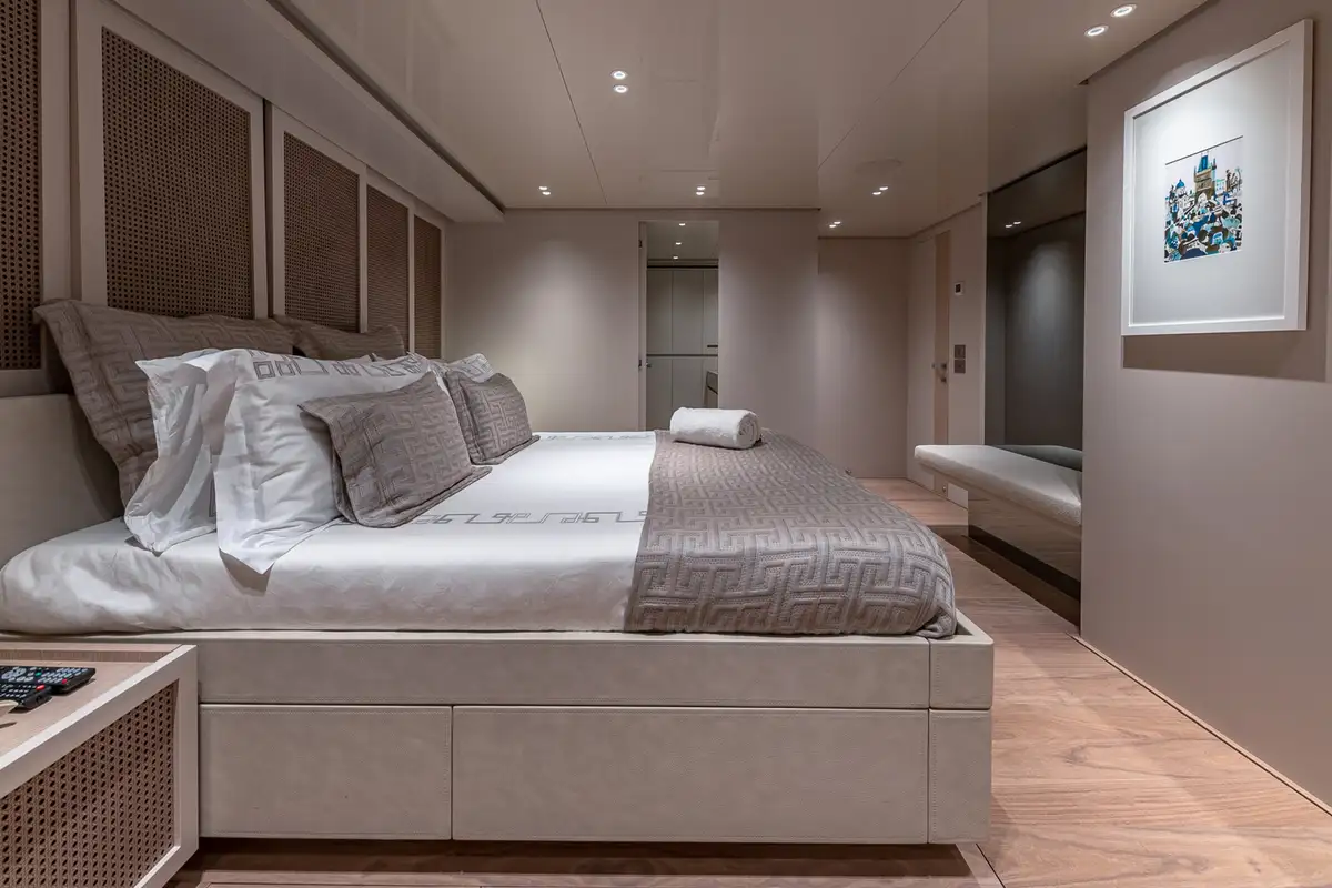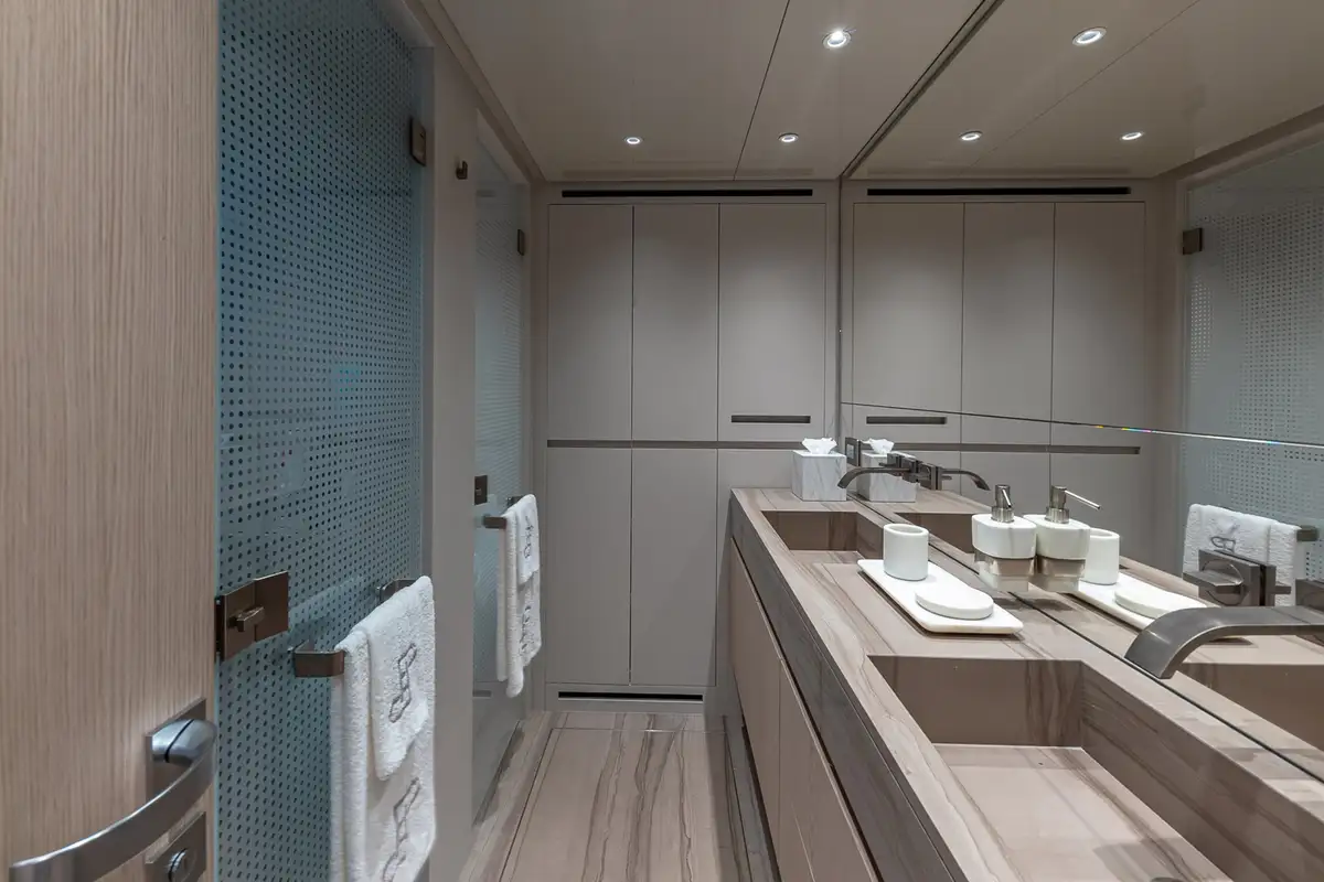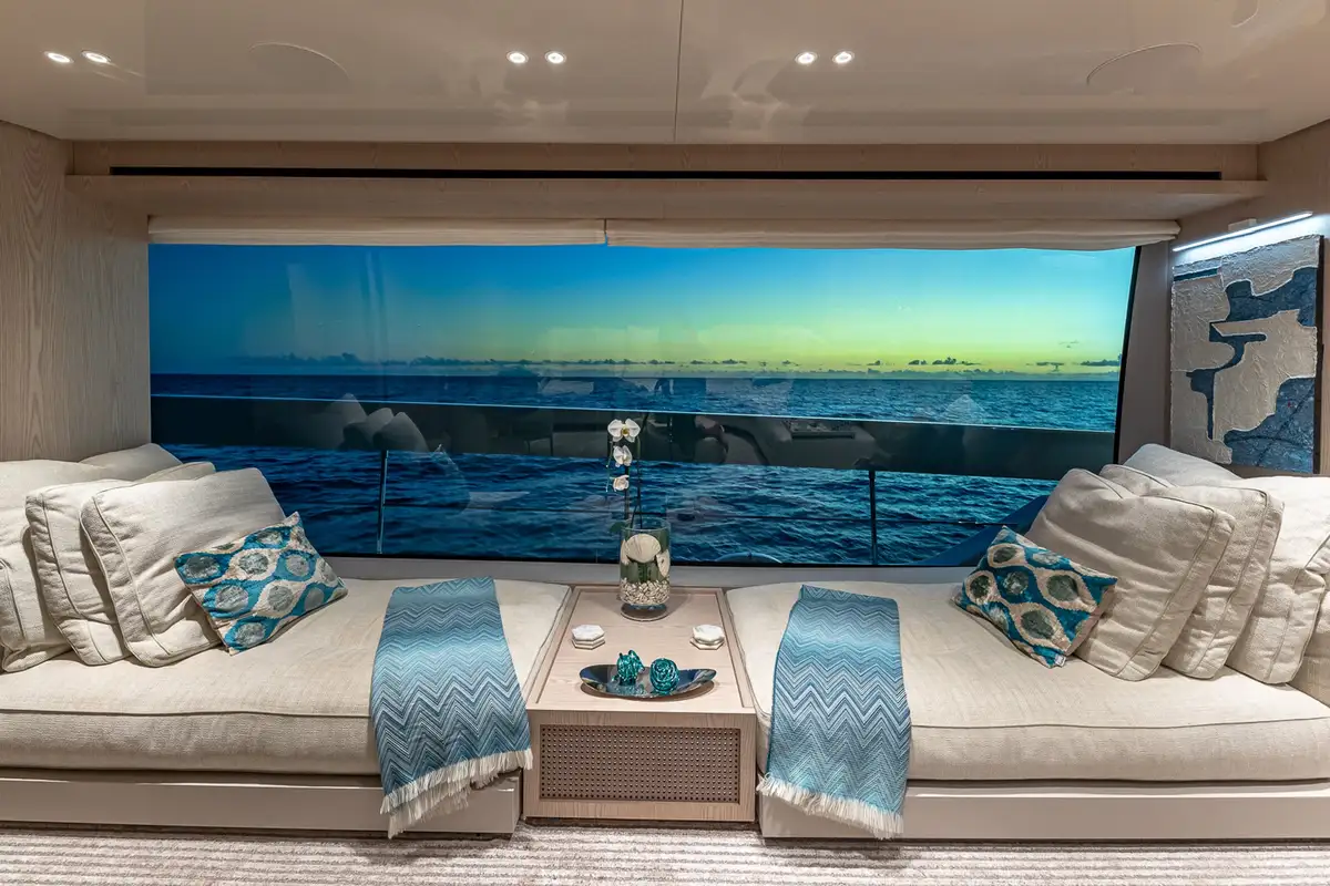 Her modern and elegant interior was conceived by Lissoni Associati and features soft and neutral finishes throughout. The open-plan main deck has a family-style galley and dining area forward, dayhead to starboard with sidedeck access, a spacious main saloon aft and sliding glass doors leading out to the aft deck lounge. The central staircase is an architectural work of art that seamlessly connects all three decks. Accommodation for nine guests can be found on the lower deck including the owner's suite, two double cabins, and a twin cabin, all en suite.