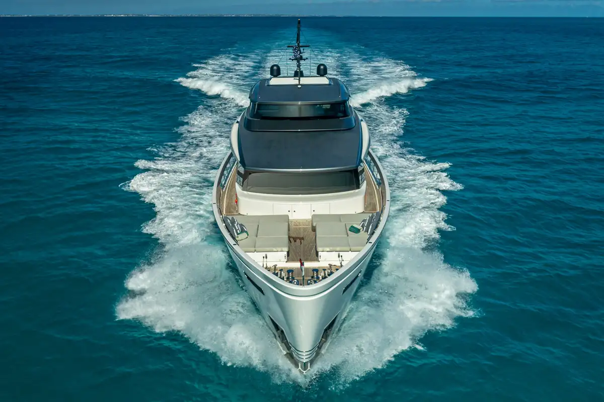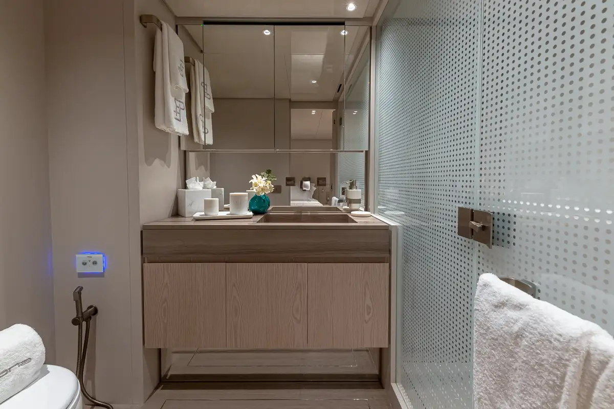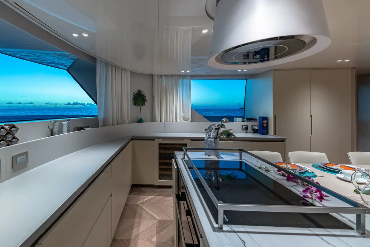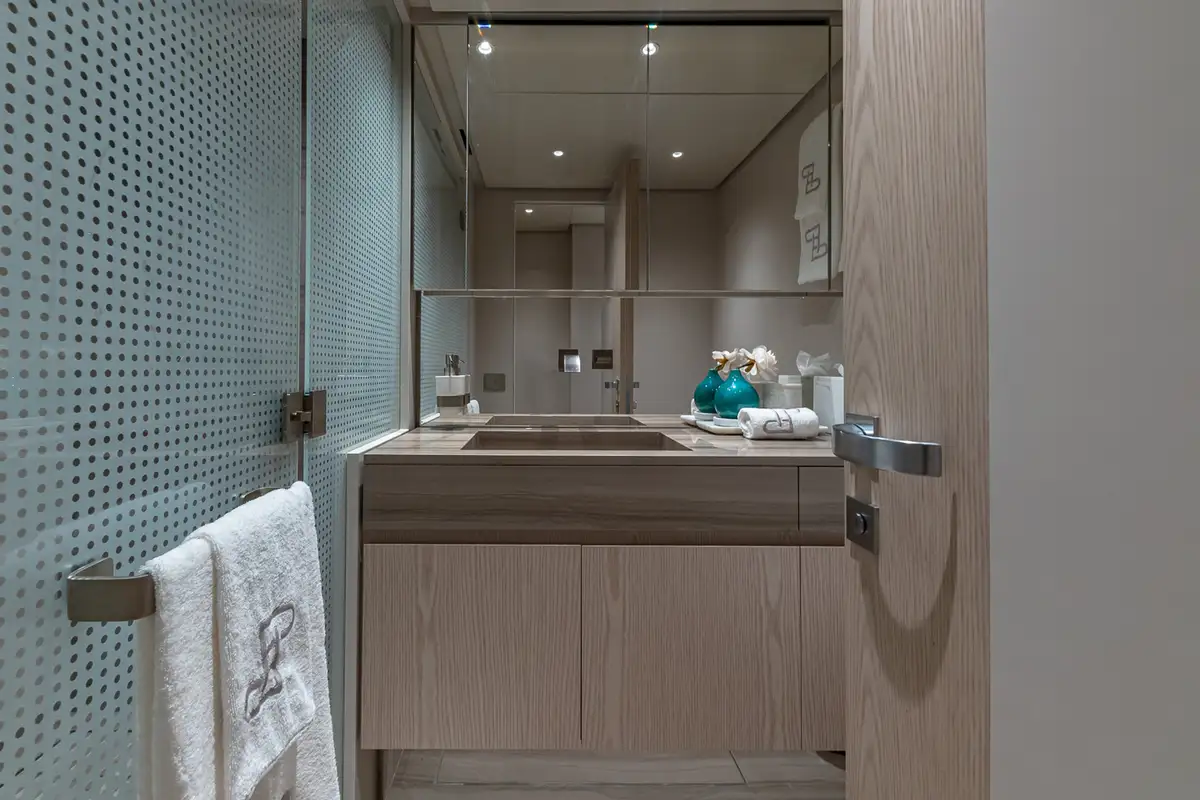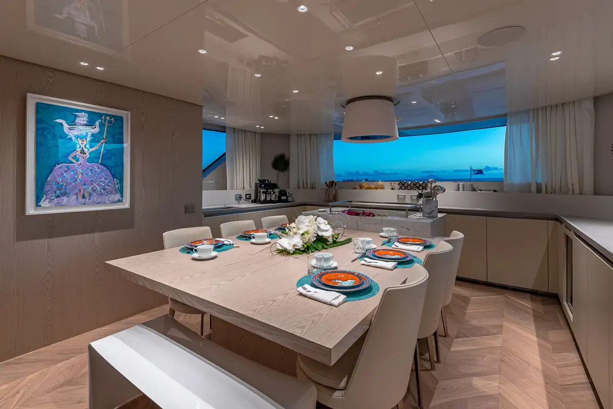 Her modern and elegant interior was conceived by Lissoni Associati and features soft and neutral finishes throughout. The open-plan main deck has a family-style galley and dining area forward, dayhead to starboard with sidedeck access, a spacious main saloon aft and sliding glass doors leading out to the aft deck lounge. The central staircase is an architectural work of art that seamlessly connects all three decks. Accommodation for nine guests can be found on the lower deck including the owner's suite, two double cabins, and a twin cabin, all en suite.
