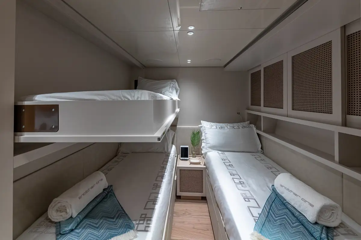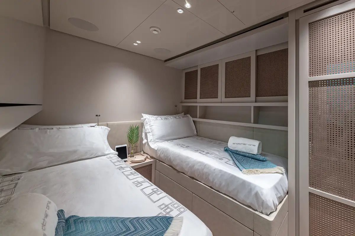Powered by four 1,350hp Volvo Penta IPS drives, ANOTHER ONE has a cruising speed of 20 knots, a top speed of 23 knots and a maximum range of 1,600nm at her passage speed of 10 knots. Her 1.9m (6.2ft) draft allows access to shallow island waters where zero speed stabilisers ensure comfort at anchor.