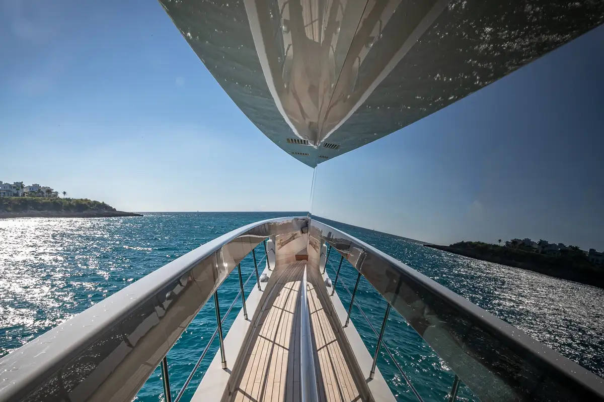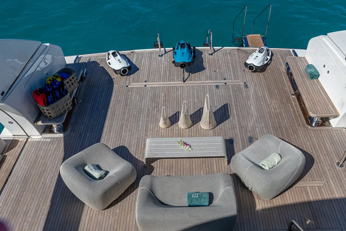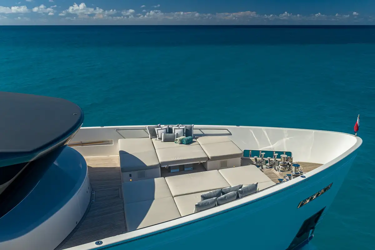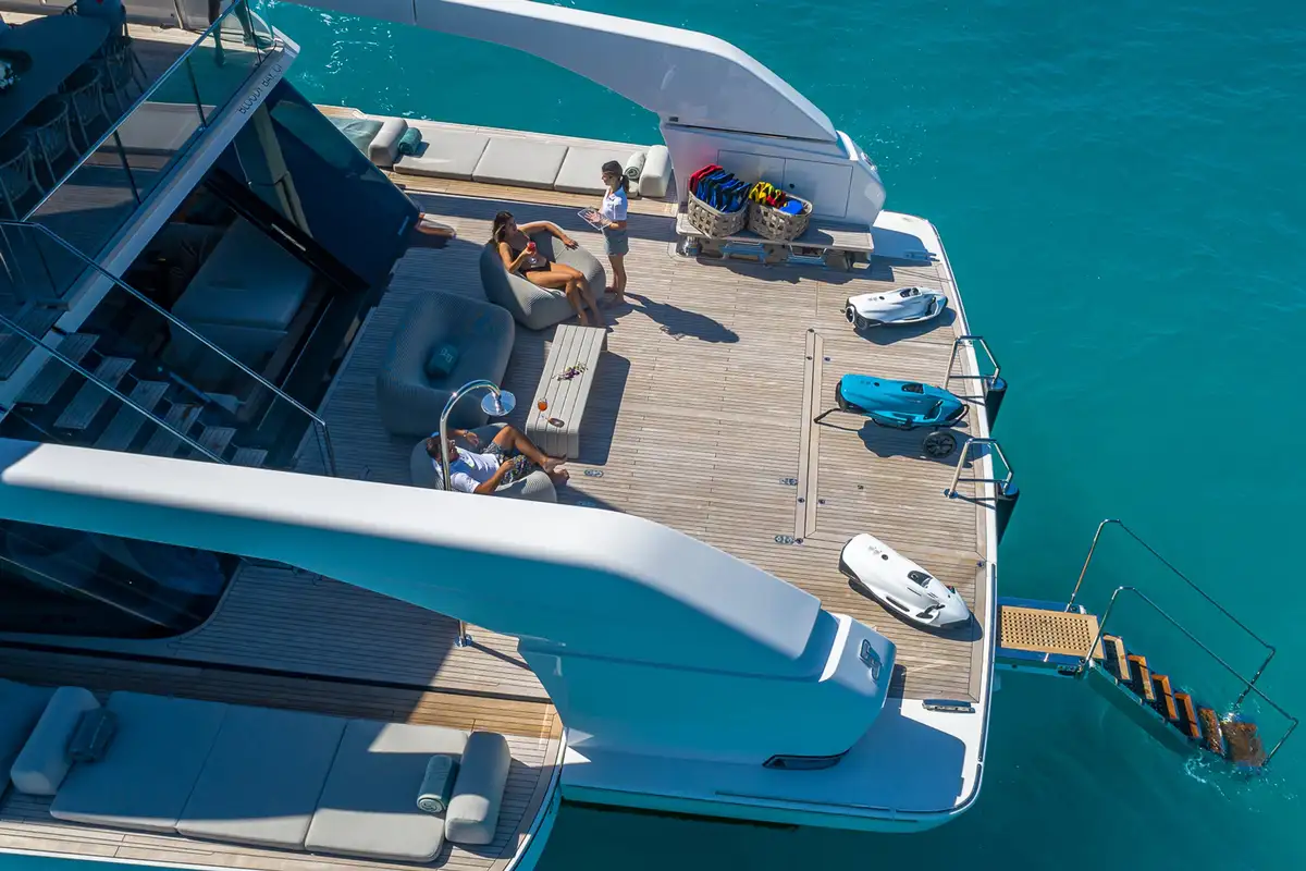 The main deck has open-air dining aft shaded by the overhang and steps lead down to the swim platform and hydraulic bathing platform. Walkaround sidedecks lead forward to two large foredeck sunpads for privacy in port. The fly bridge, which has a helm station forward and lounging areas aft, can be open air or climate controlled with a louvered roof, retractable side windows and a glass sliding door aft opening onto a sun lounge.