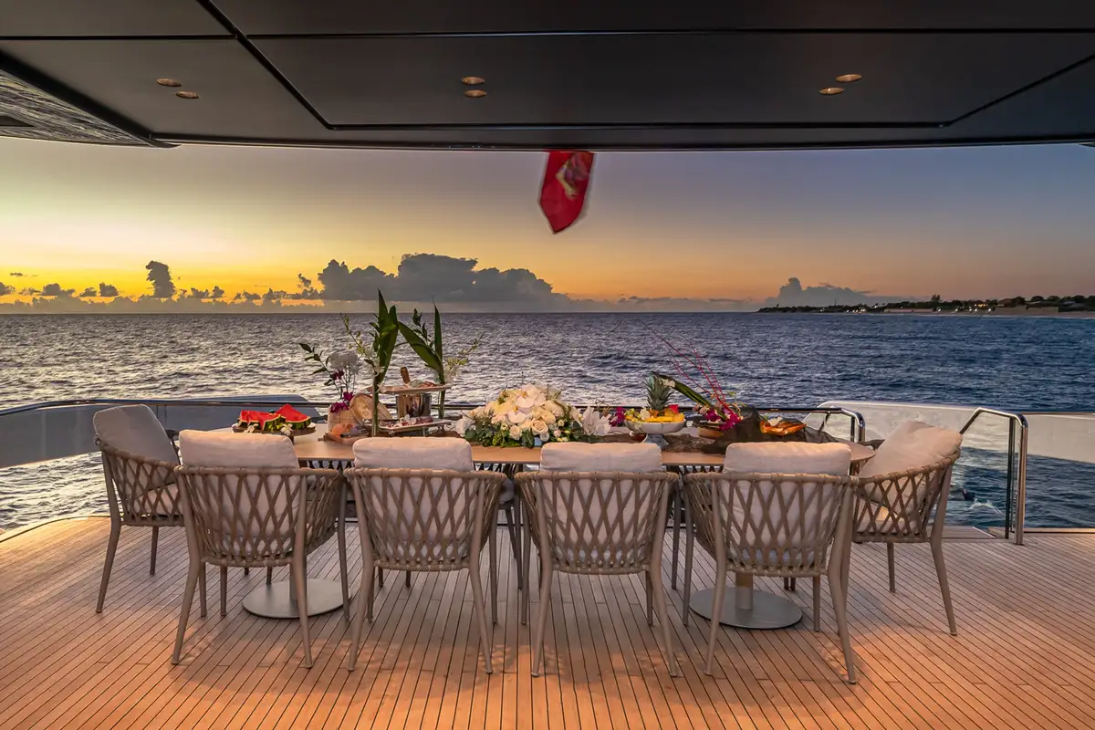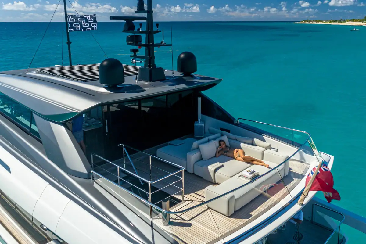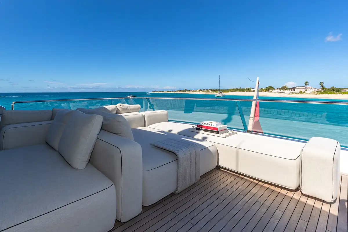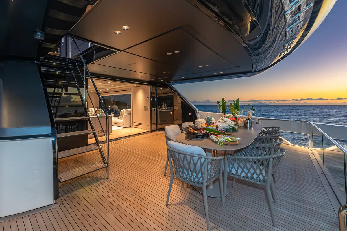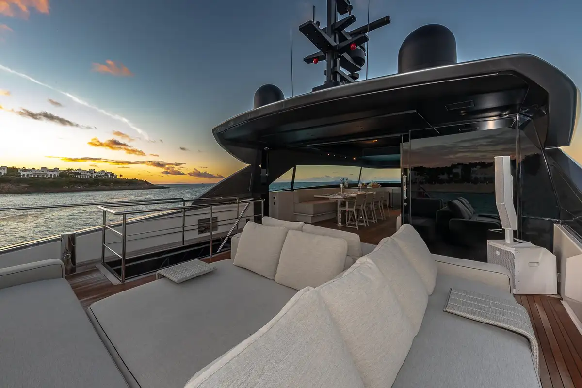 The main deck has open-air dining aft shaded by the overhang and steps lead down to the swim platform and hydraulic bathing platform. Walkaround sidedecks lead forward to two large foredeck sunpads for privacy in port. The fly bridge, which has a helm station forward and lounging areas aft, can be open air or climate controlled with a louvered roof, retractable side windows and a glass sliding door aft opening onto a sun lounge.
