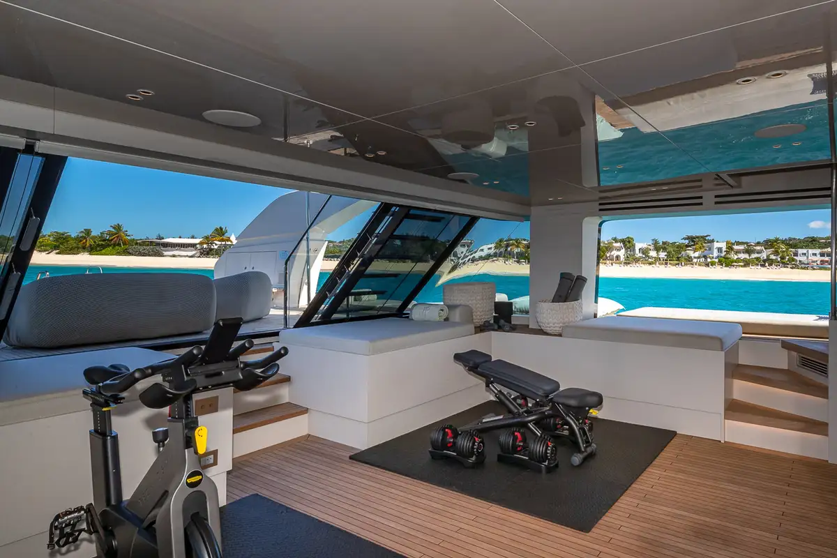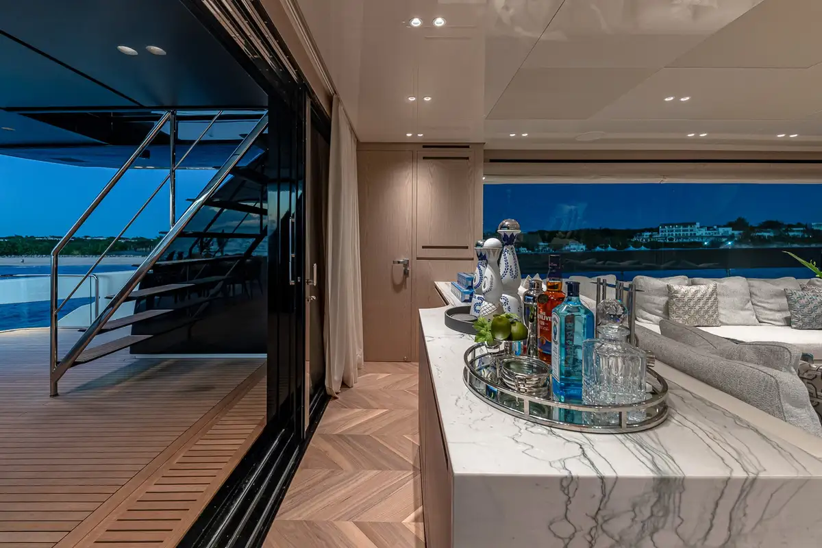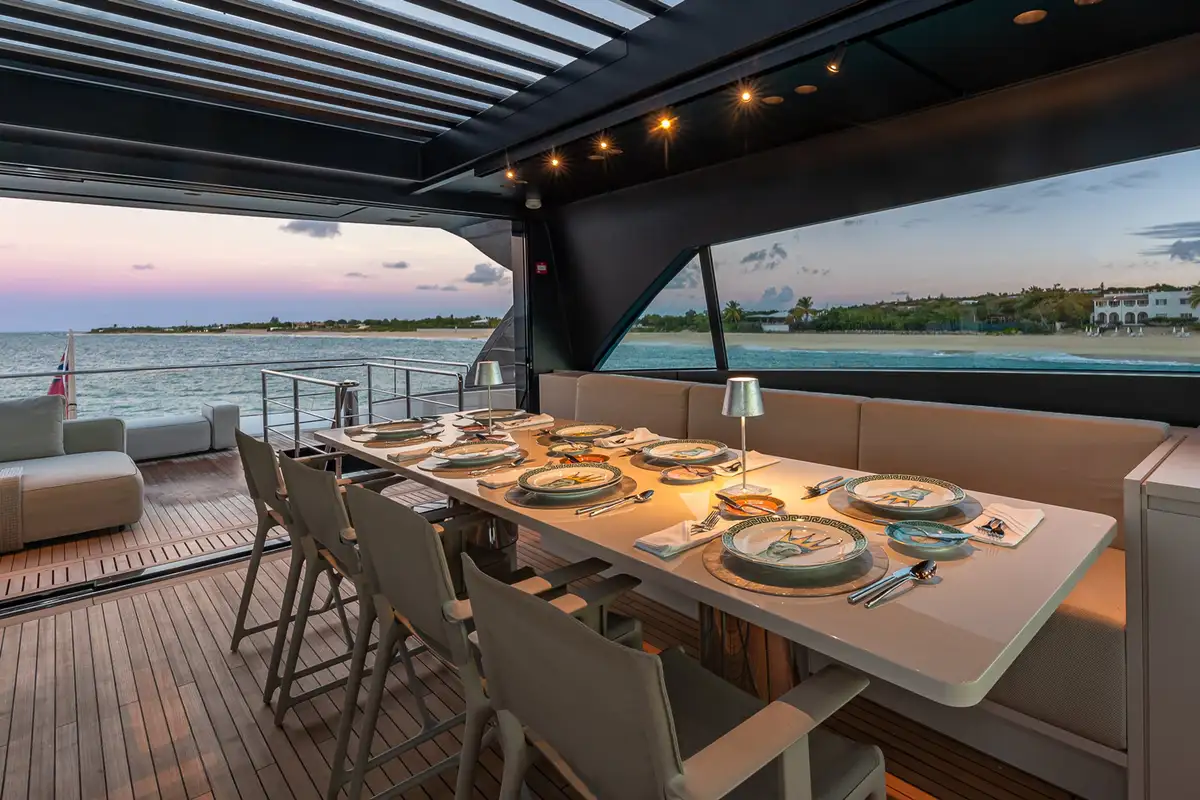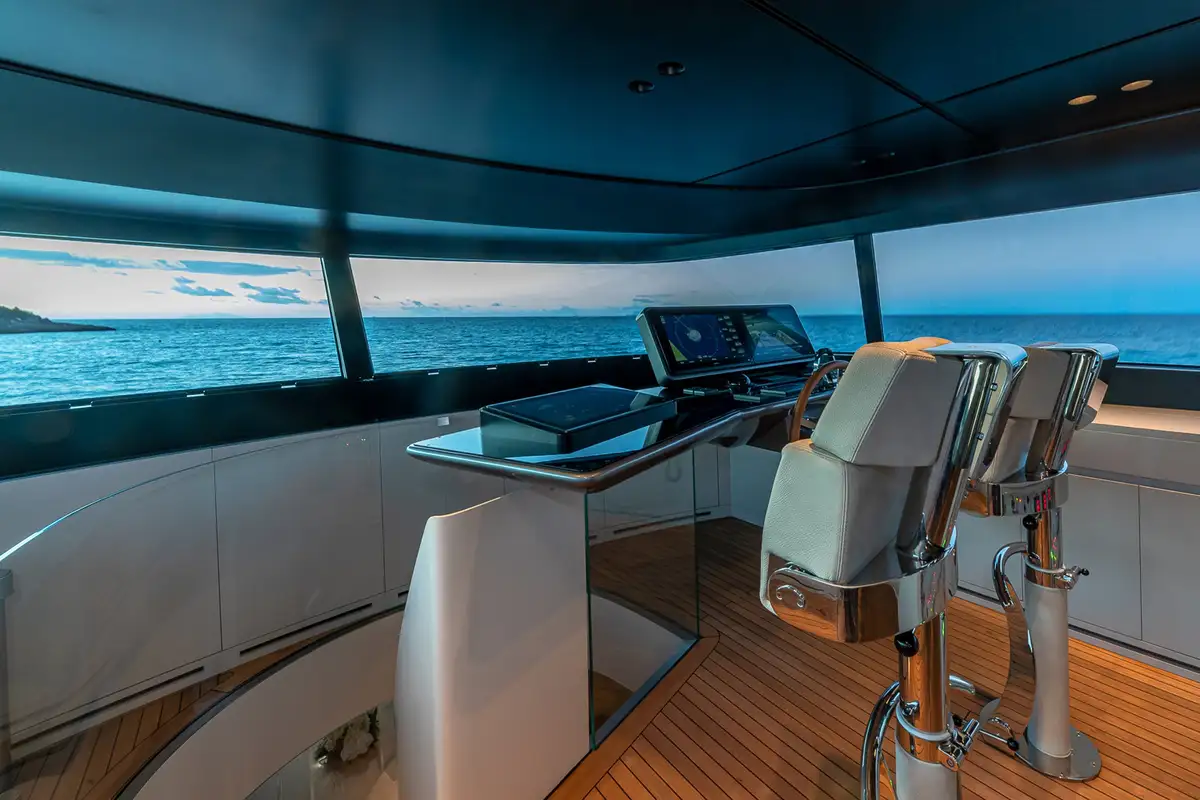 - Indoor-outdoor fly bridge with louvered roof, retractable side windows, and glass sliding doors aft