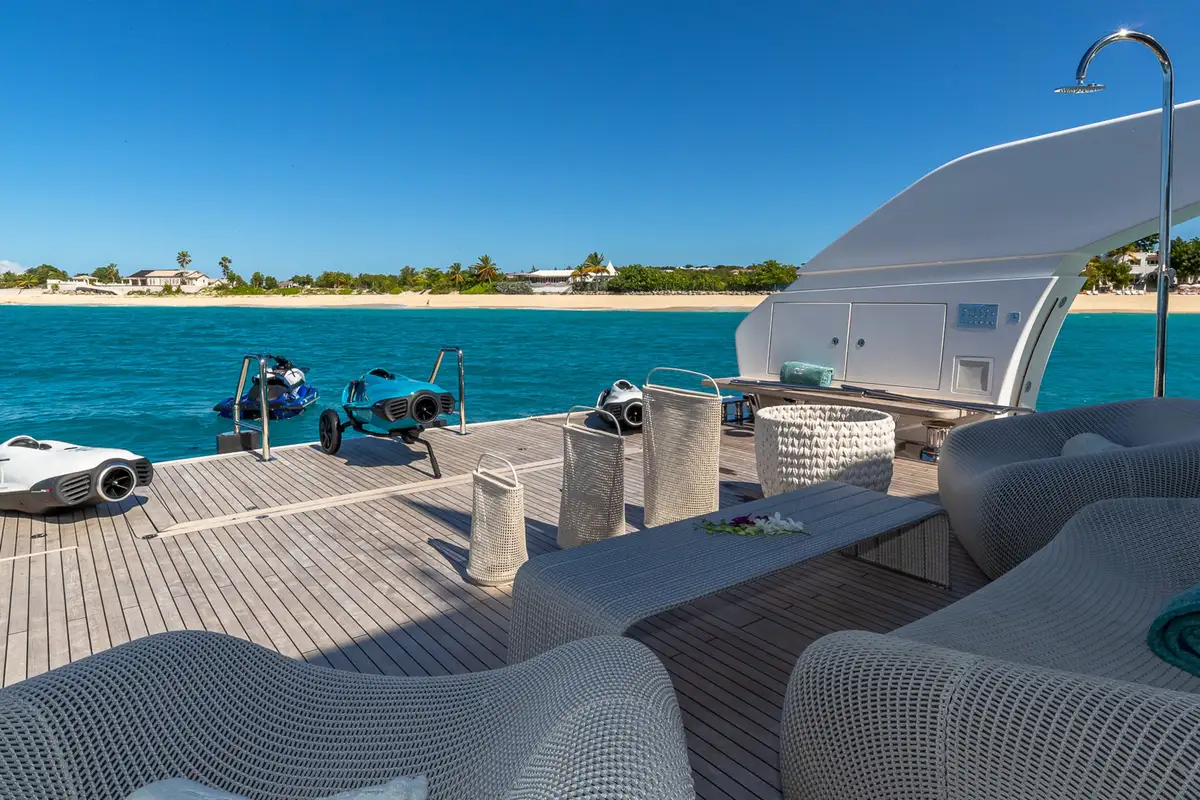 - Explorer-style swim platform with fold-down sea terraces and adjoining beach club