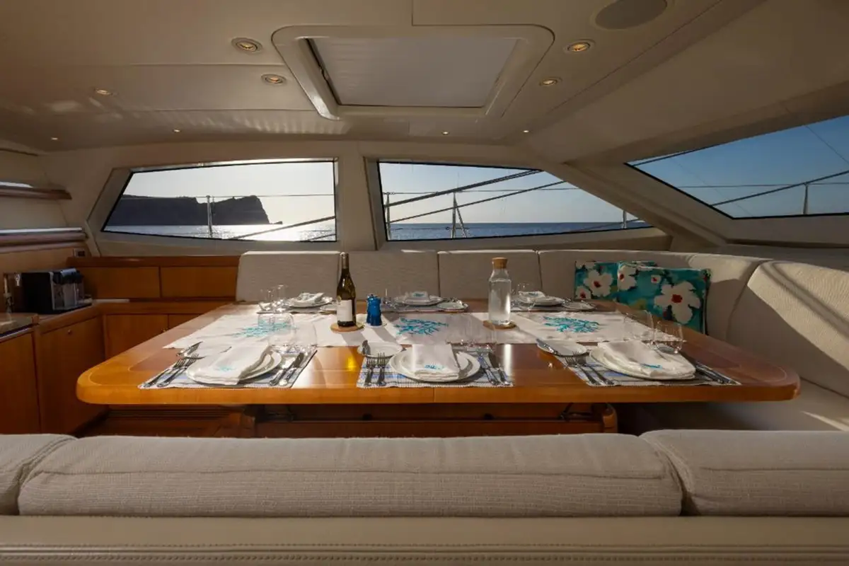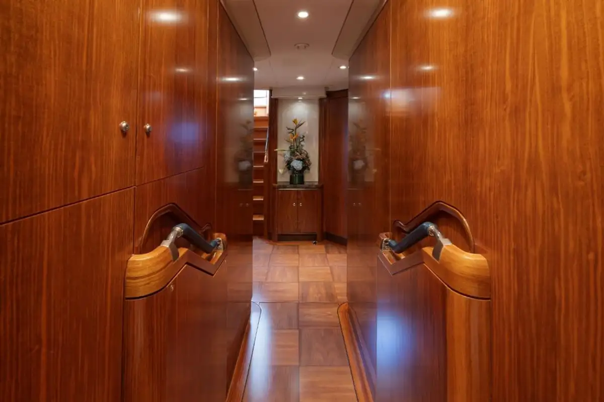This high performance auxiliary ketch is one of the largest designed by Dixon Yacht Design. ANTARES has a versatile four cabin arrangement with multiple interior and exterior entertaining spaces. Designed by Rhoades Young Limited, her interior is uncluttered with a rich pallete of textured leather, edelmessing and specially selected French Walnut. The main dining room steps down to a study starboard that can be converted to a small guest cabin and opposite is the compact, but cleverly designed galley.