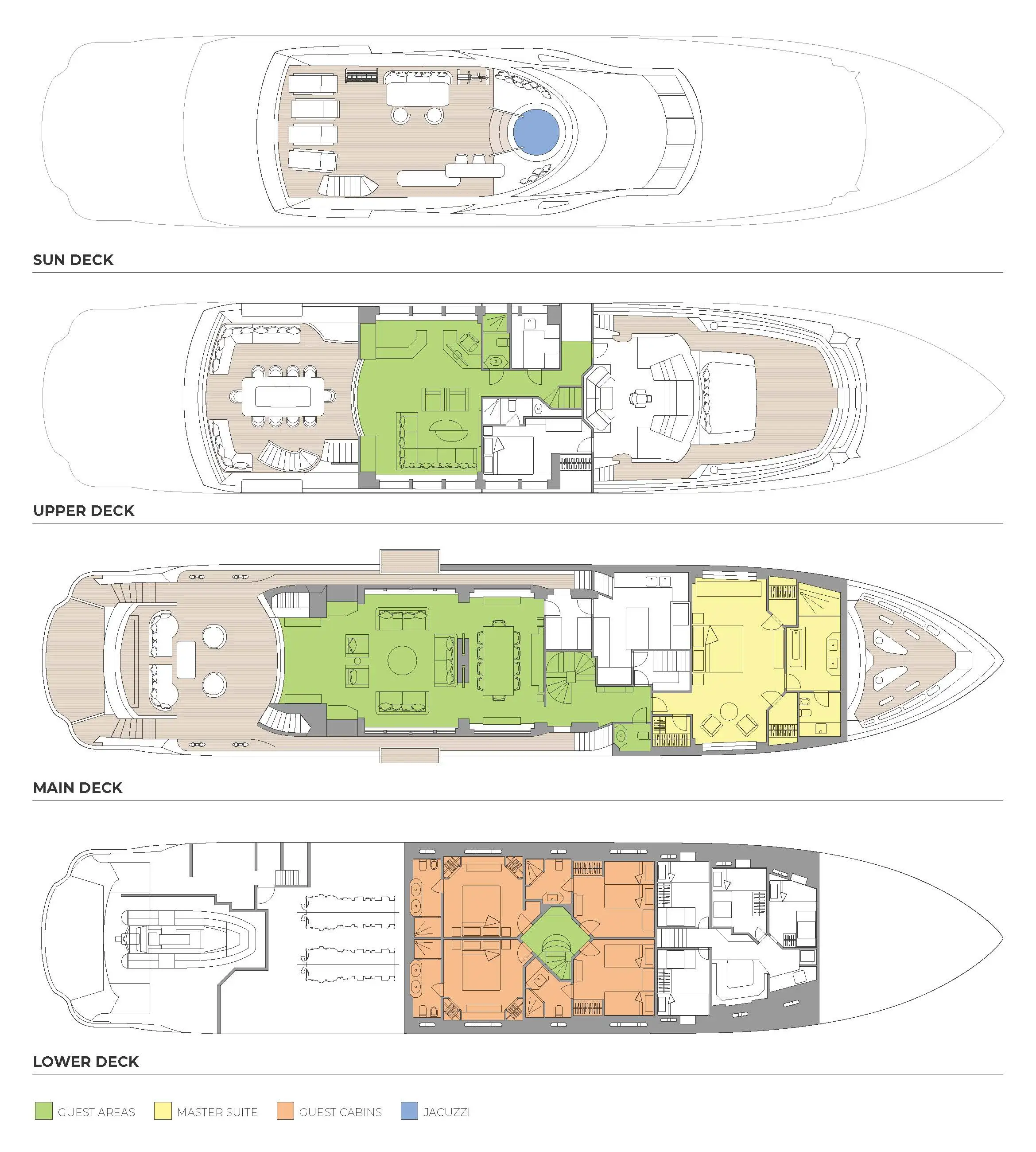 - Huge sun deck with jacuzzi, foredeck sun lounge, open-air dining, spacious main deck aft