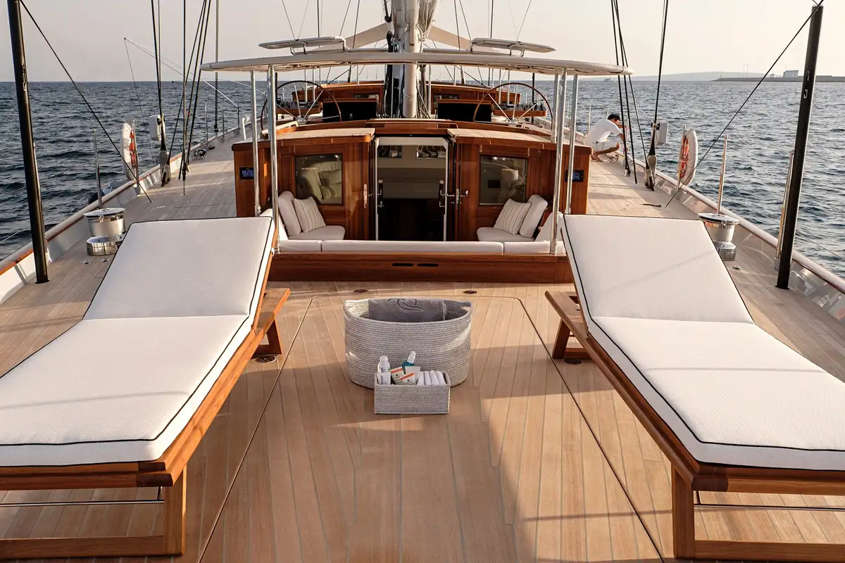 Her deck features two low-profile teak clad deckhouses, and a mid-deck lounge area with a sun canopy which can easily be set up when at anchor. The main cockpit is the perfect spot for socialising, sheltered by a large bimini, with tables that can serve as individual, low-level coffee tables or elevate and integrate to seat a party of 10, or provide an intimate breakfast setting for just two.