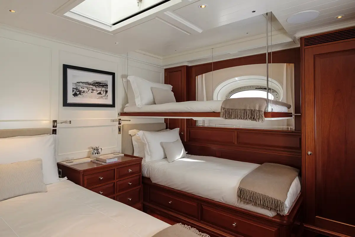 APSARA accommodates eight guests across four cabins. Special attention has been paid to the owner’s suite, where natural light floods in from an oval skylight. Expect a private deckhouse, an office, a walk-in wardrobe and a double bed. The remaining accommodation is in the form of two double guest cabins aft and one convertible guest cabin which can be configured as a double or between two and four single bunks.