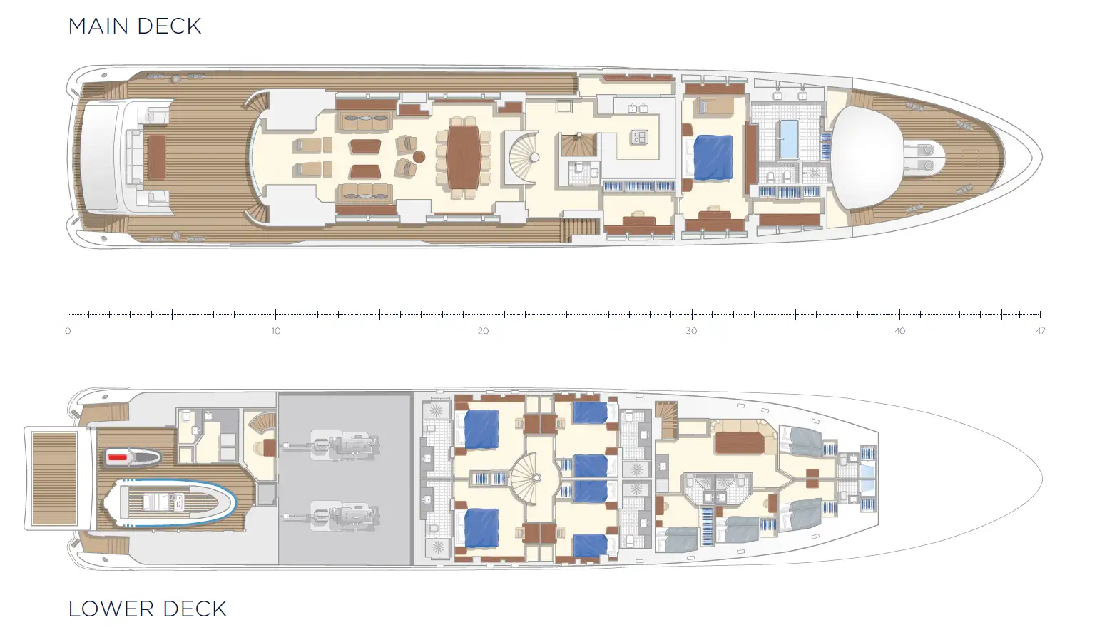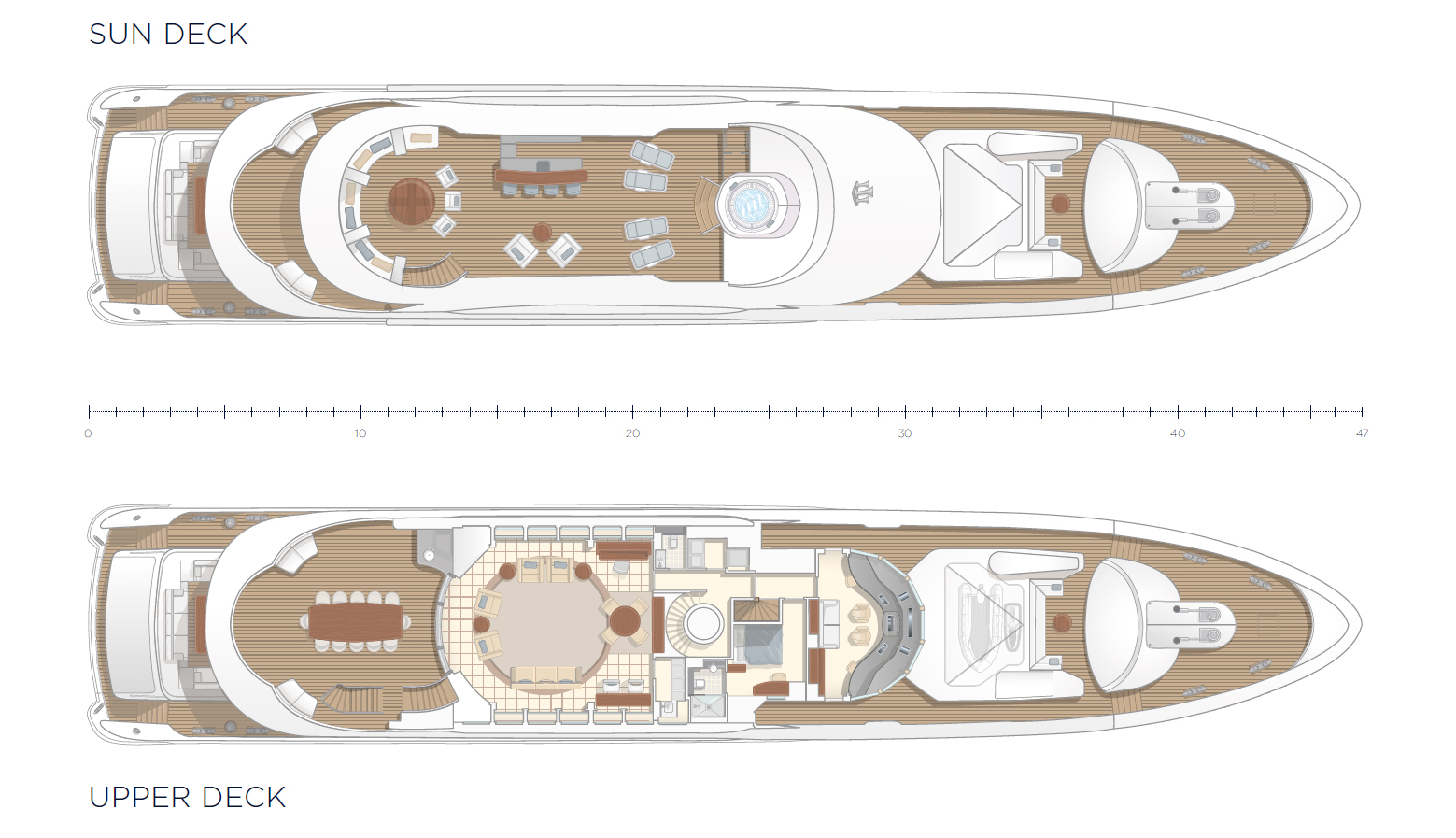 The 47-metre series is known for its outdoor spaces, devoting almost 185 square metres to exterior decks. Her's cosy bow seating area is the owners’ preferred place for sunsets, cigars, and Mediterranean vistas, but the pièce de résistance is the sprawling sun deck. Taking up 83 square metres, it features a spa pool forward surrounded by sunpads, loose lounging chairs, a bar to port, and a large seating area aft. Versatile in nature, the sundeck has proven to be the ideal spot to host parties, friends and family.