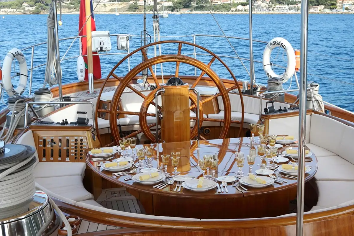 ASGARD is a 43-metre (140.5ft) ‘spirit of tradition’ centreboard ketch designed for world cruising by Bruce King with interiors by Andrew Winch. She was built by Abeking & Rasmussen in cold-moulded mahogany with laid teak decks and delivered in 1993. She was refitted in Southampton, UK in 2010-2011 and had a mechanical refit, including a full rebuild of her engine and generators, in 2020. A past winner of the Superyacht Cup and winner in class at the Rolex Maxi Worlds, she is known to be a good performer under sail.