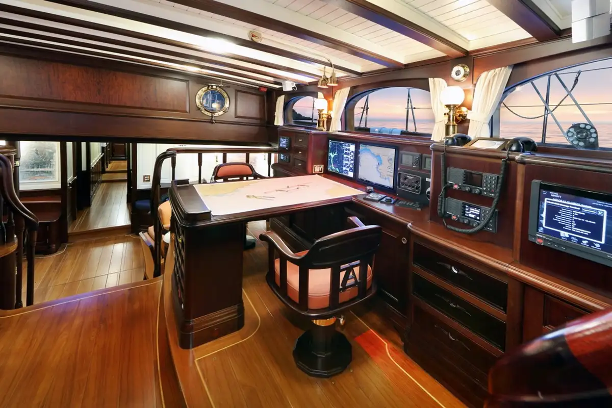 The sailplan comprises a 272sqm mainsail, 335sqm overlapping genoa, 137sqm staysail and 136sqm mizzen, plus spinnaker and mizzen staysail. All sails are by Doyle. Her masts, booms and poles are carbon, by Southern Spars, with in-boom mainsail and mizzen furlers. She has hydraulic sail control systems and deck hardware by Lewmar including six captive winches under the deck, plus Reckmann hydraulic headsail and staysail furlers.