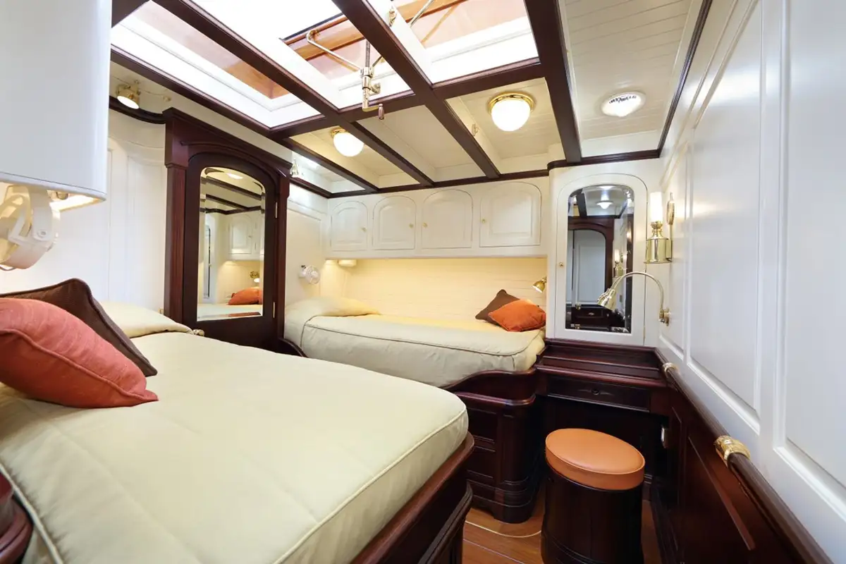 The master cabin is a full-beam suite located aft on the lower deck with private access from the deckhouse. It has three large skylights overhead, a large double bed, office and lounge areas, en suite heads and shower. The other guest cabins are forward of the lower saloon: two twins and a double, each with en suite heads and a shared shower. The galley is forward on the lower deck, with crew’s quarters in the bow.