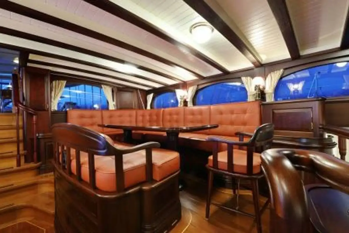 Her 152GT interior is configured to host up to eight guests on board in four cabins, with separate quarters for six crew. Two extra guests can be accommodated in pipe cots when she is operating in expedition mode. The décor is traditional, with fine mahogany joinery, polished brass and gold plated fittings. Inside the deckhouse, which offers good views out in all directions, are the upper saloon and two-seater nav station. Steps lead forward from here into the spacious lower saloon which has lounge and dining areas and a solid fuel stove.