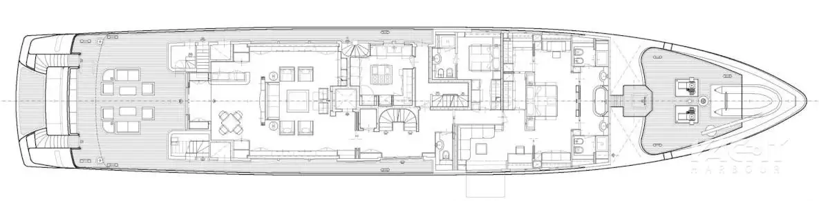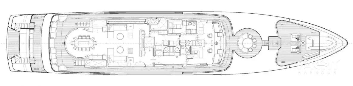 ATLAS’ oversized sun deck proves to be a favourite with a large jacuzzi and sunpad area forward, dayhead and elevator in the mast structure, and a full wet bar with versatile lounge area aft. Additional entertaining areas include a Portuguese bridge with a circular settee and built-in table for enjoying forward facing views while underway, and a large lounging area on the main deck aft. On the lower deck aft is a spacious tender garage with a fold-up transom door and a good-sized swim platform.
