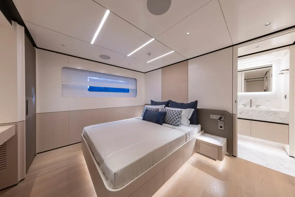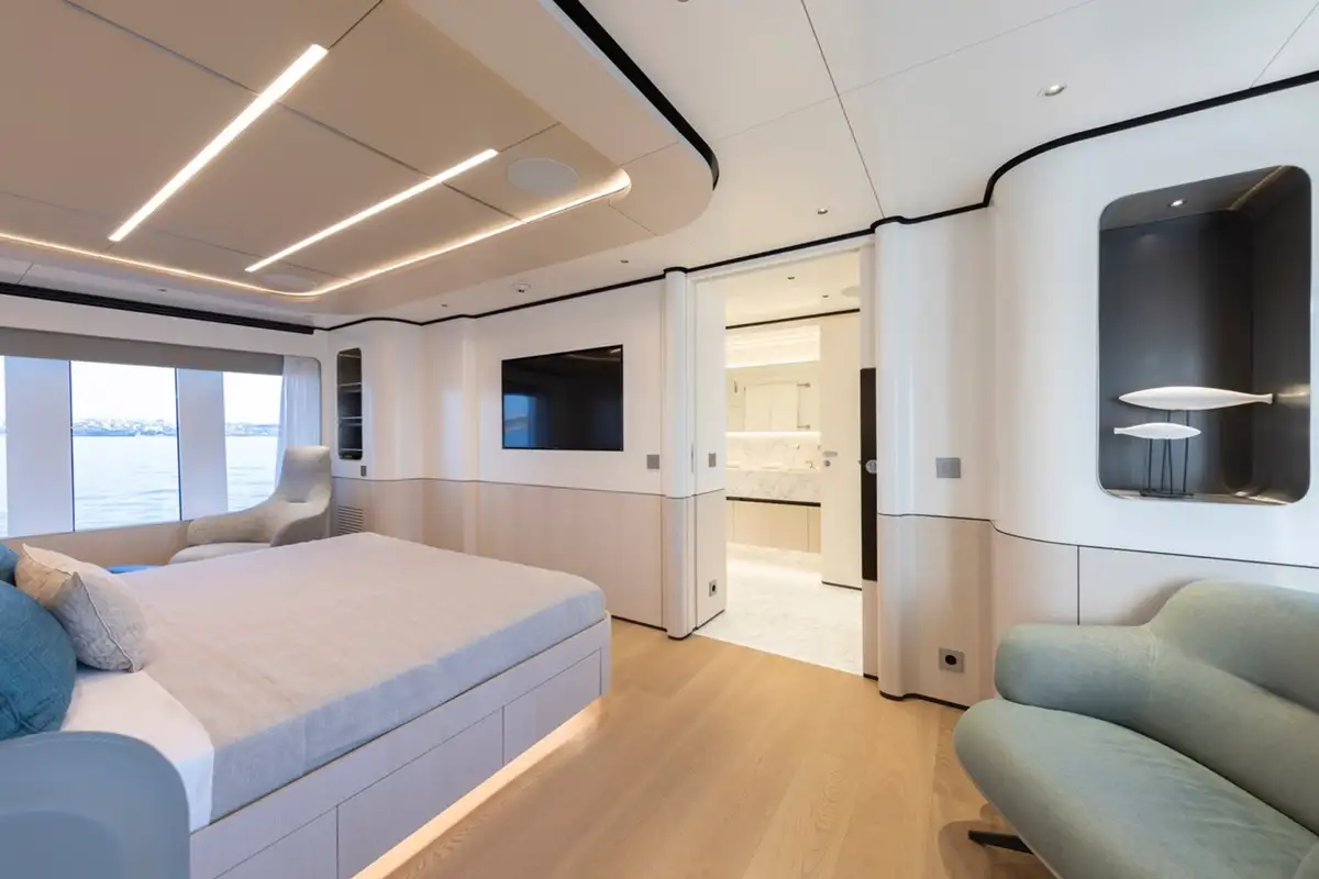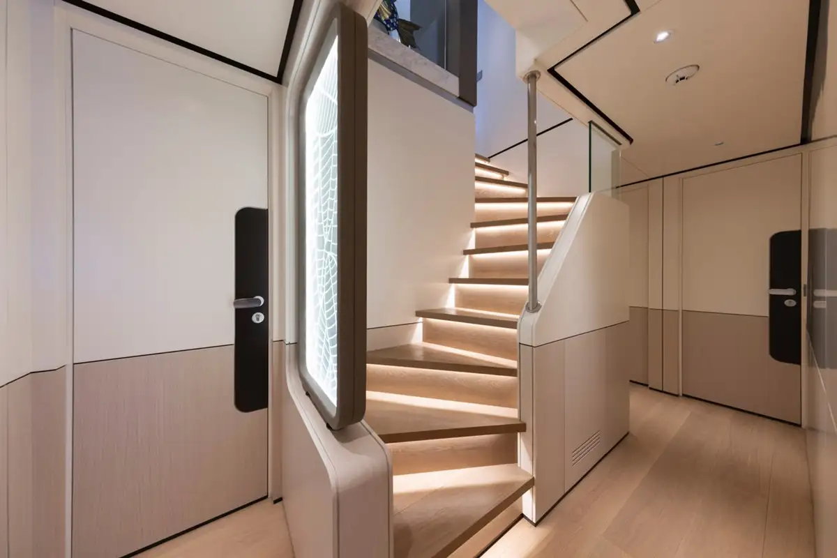 The yacht’s design prioritizes natural light, utilizing floor-to-ceiling windows and reflective materials to create a bright and airy atmosphere. The decor blends light brushed oak flooring, white lacquered ceilings, and dark-framed walls for a modern yet warm aesthetic.