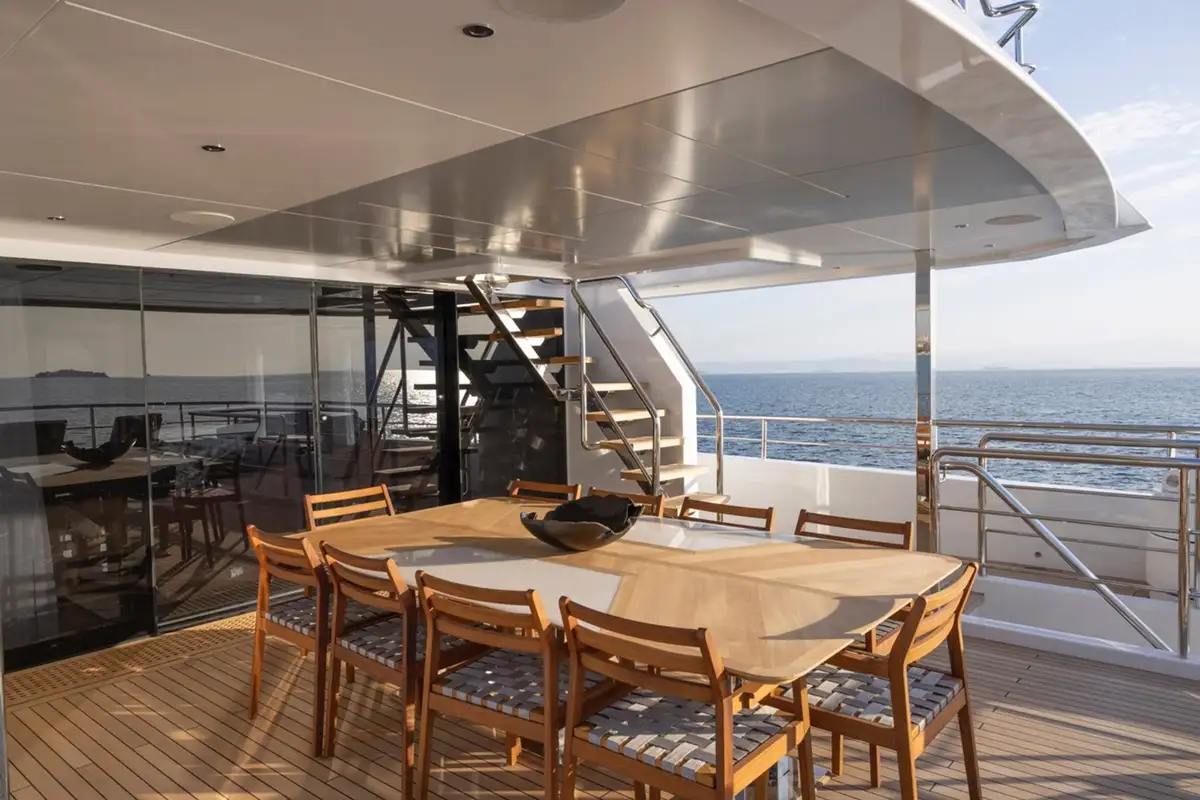 Beyond her refined interiors, BEE is equipped for serious exploration. The aft main deck features an infinity pool and a 40-square-meter multifunctional area adjacent to the main saloon, perfect for relaxing or entertaining. The upper deck includes a crane for tender launch, maximizing space for other outdoor activities.