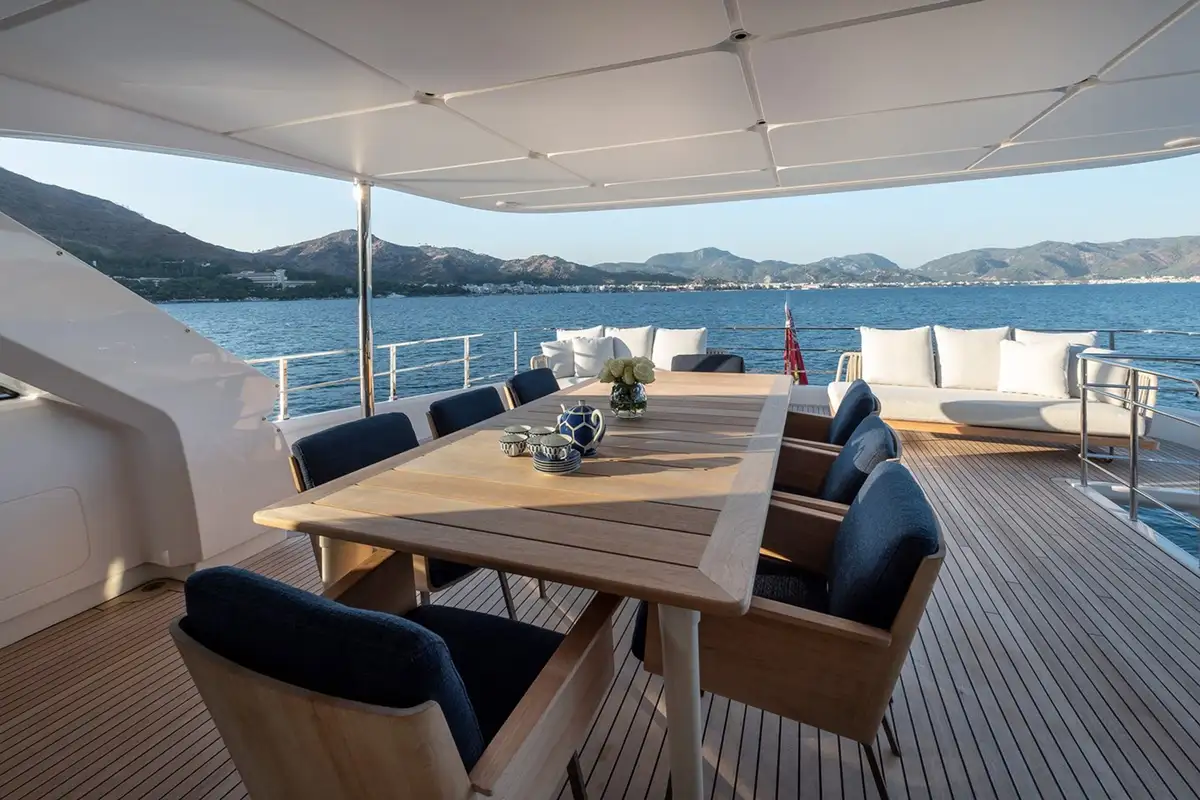 She is decorated with a modern and stylish interior, featuring a calming, neutral colour palette, wooden accents and pops of blue. The spacious main deck features a capacious main salon with spacious sofa seating and a formal interior dining setup.