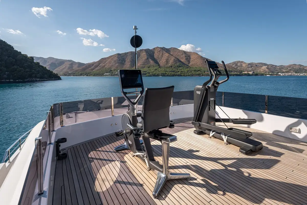 A standout feature of BELLE ILE’s exterior is the brand-new techno gym equipment situated on her beautiful sundeck, as well as a barbeque and sofa seating with panoramic ocean views.