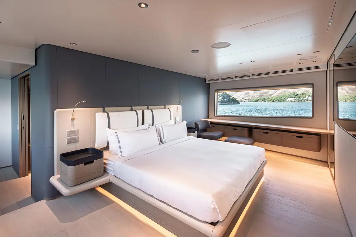 BELLE ILE accommodates 8 across four cabins - her full-beam Owner’s suite on the main deck, and three guest cabins on the lower deck. A full study on the lower deck could be easily converted back into a fifth guest cabin, to accommodate a total of 10.