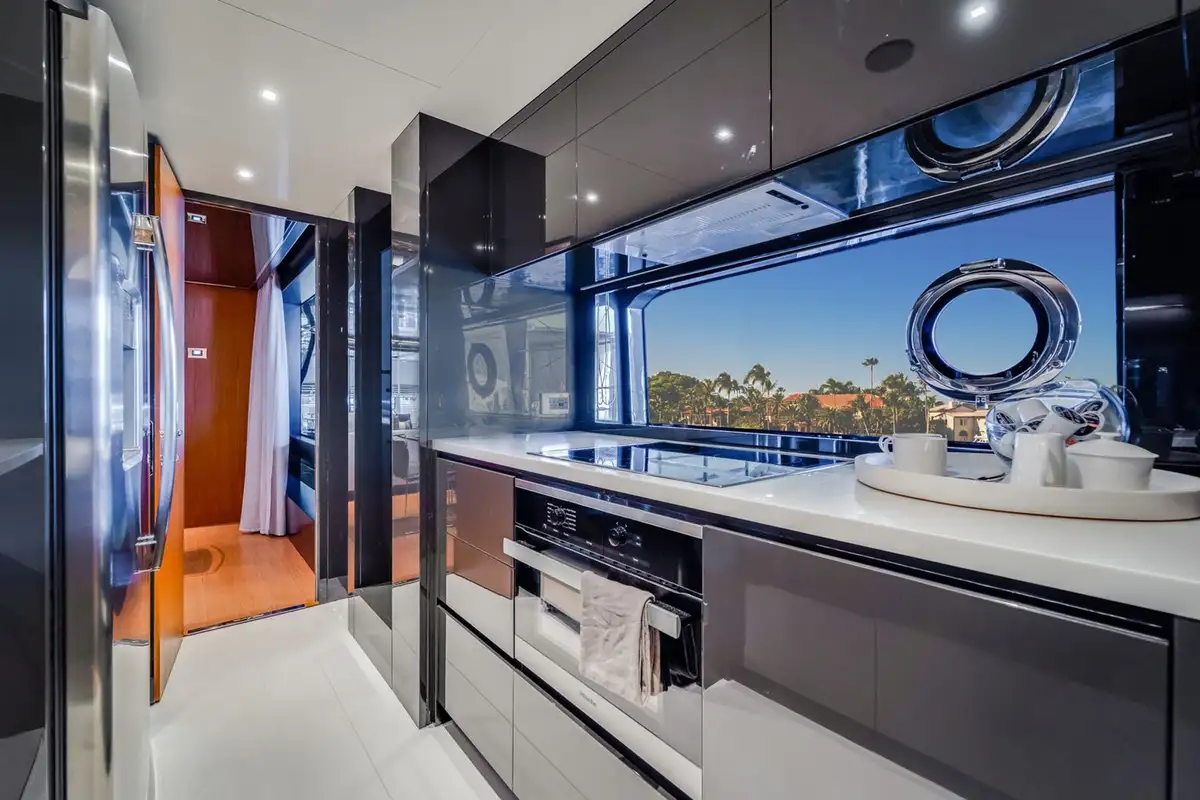 Her interior is also beautifully designed by Officina Italiana Design. Her spacious main salon features full-height windows, two lounge chairs, an L-shaped sofa, and a retractable TV. Forward of the lounge is the large dining table with seating for eight guests