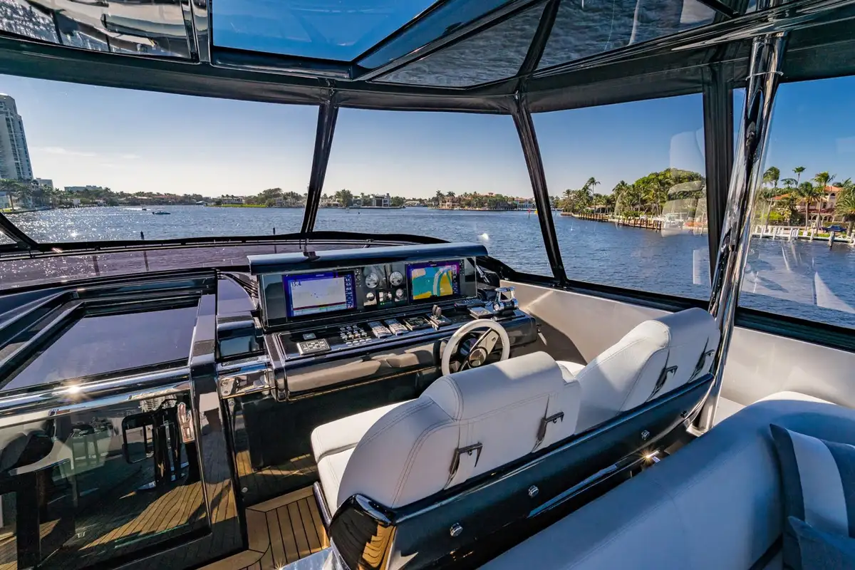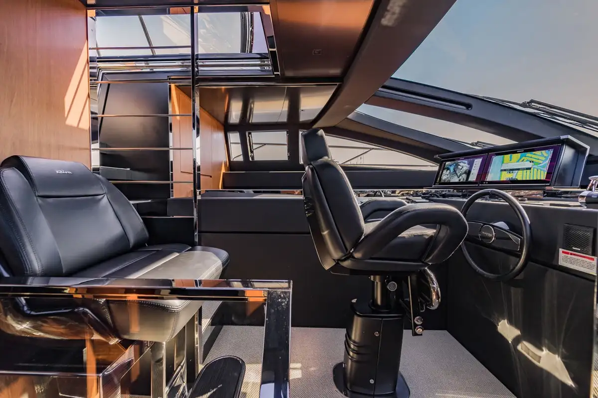 Her exterior was designed by Officina Italiana Design and was made for entertaining. Her main deck aft features a comfortable settee and a bar with bar stools. She has dual descending teak staircases that lead to the swim platform and aft garage with an electrohydraulic platform. Her Sun deck features an open flybridge with a varnished control station, dining table, L-shaped sofa, wet bar, and an electric BBQ. For additional guest space, there is a comfortable lounge located on the foredeck with fantastic views over the bow