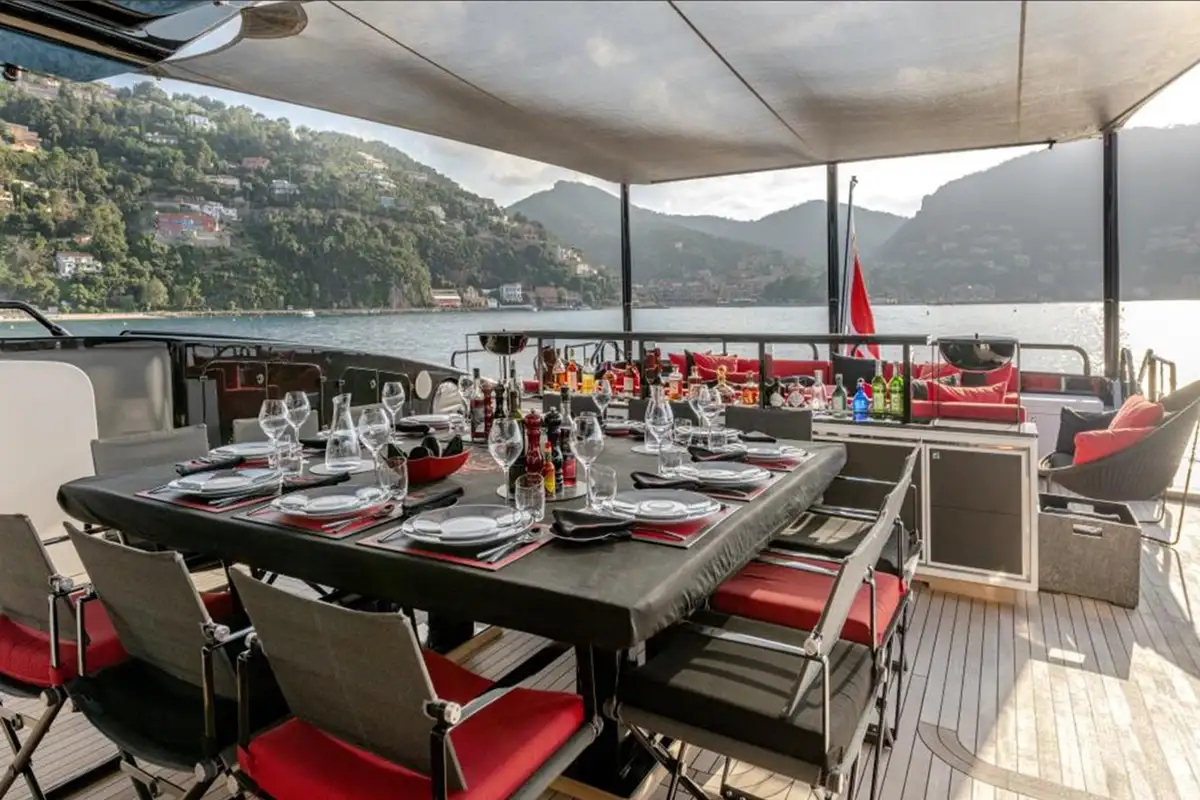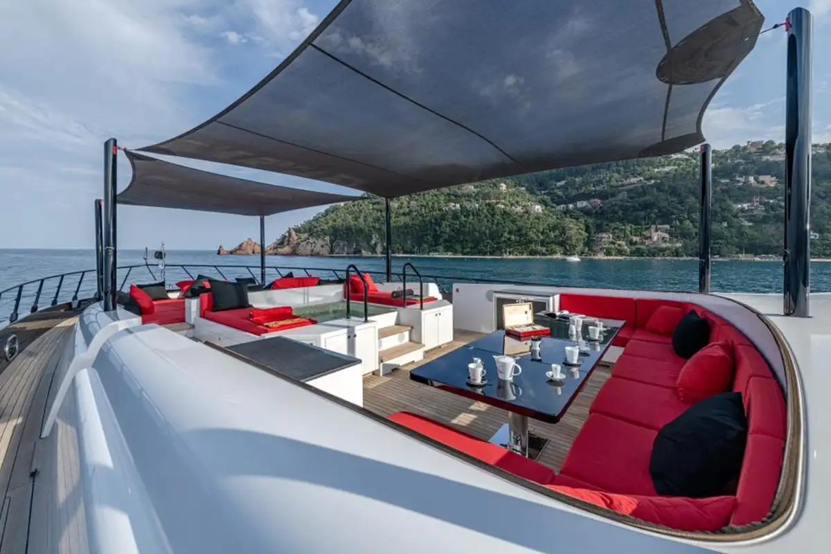 Her exterior offers an abundance of lounging spaces, an al fresco dining table on the main deck aft, an easily accessible swim platform, and a jacuzzi on the foredeck with views overlooking the bow
