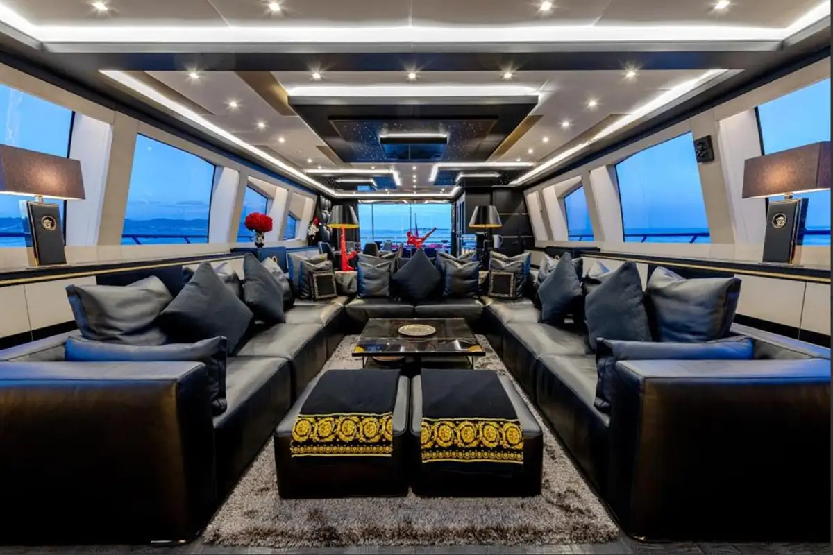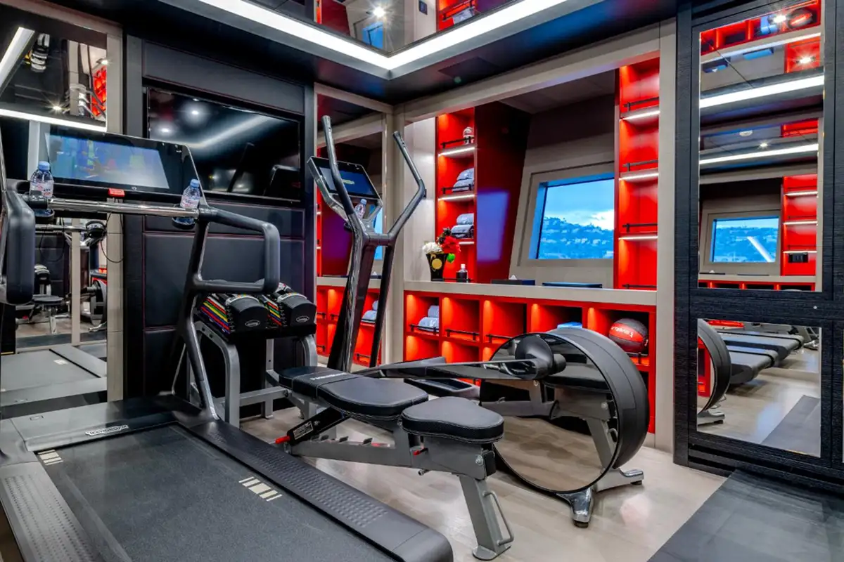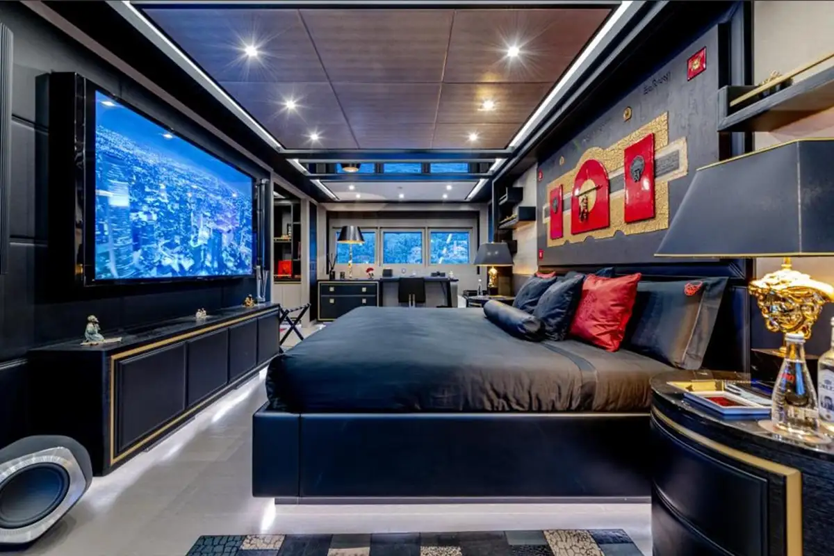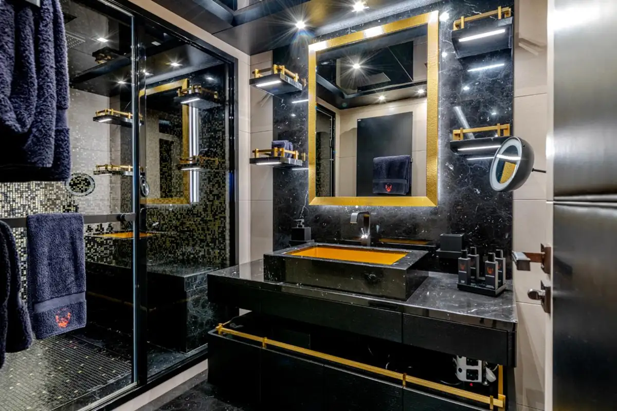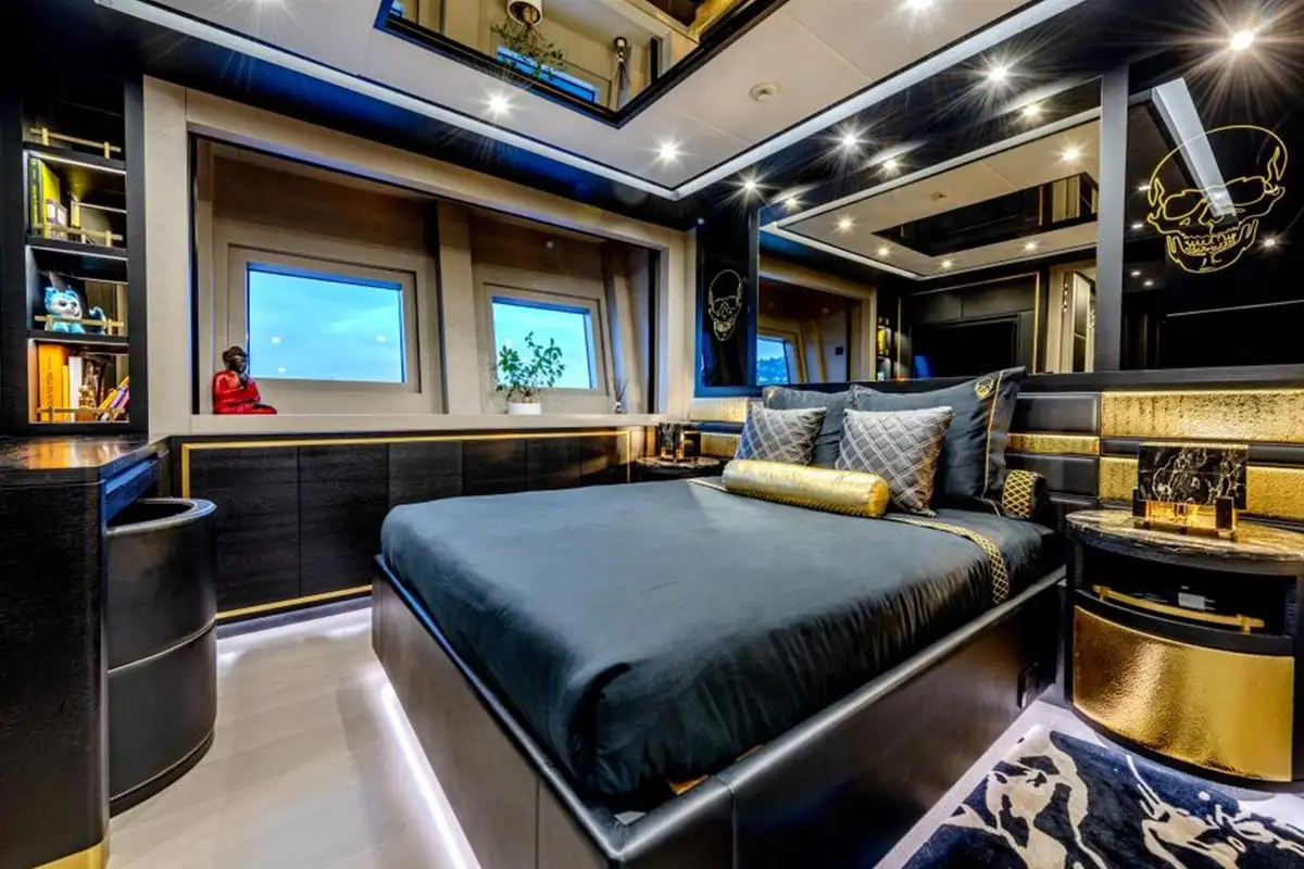 BLACK LEGEND’s interior is configured to host eight guests in four cabins. Her full-beam master cabin features a library, walk-in wardrobe, and an en suite bathroom with a hammam shower. Guests will find comfort in her VIP cabin and two double cabins, each with a private en suite bathroom. Her layout includes a fully equipped gym and a cinema room that can be converted into a twin cabin for extra guests. The separate crew quarters can accommodate nine crewmembers