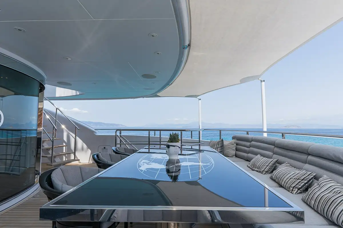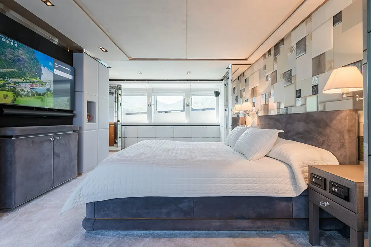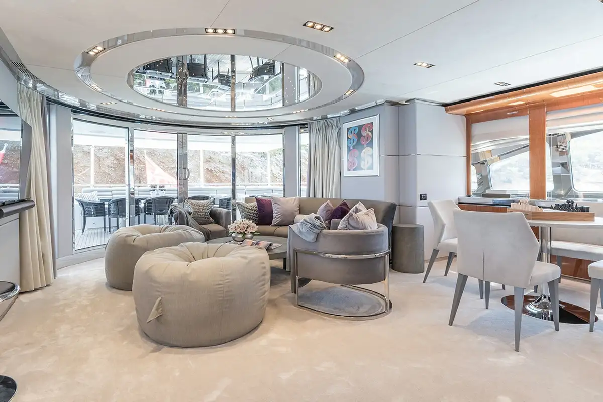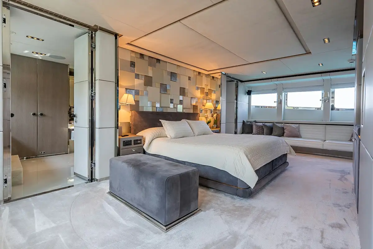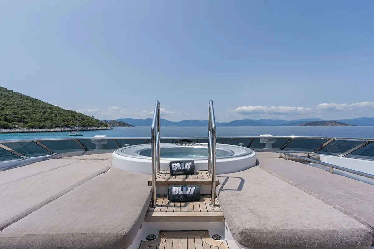 BLISS can accommodate 12/14 guests in five well-appointed cabins. Each cabin has its own unique design and style, ensuring guests can enjoy a welcoming and relaxing personal space to retreat to when on board. The upper salon can be converted to be used as an extra guest cabin with a Pullman king size bed. An elegant main salon forms the heart of the yacht; the large seating area and entertainment system is completed by a formal dining space, with circular table and leather seating, for enjoying sumptuous meals prepared by Bliss’ talented chef. She can accommodate 10 crew members on board to ensure the best luxury experience.
