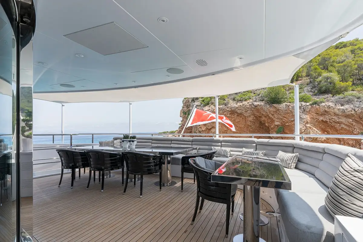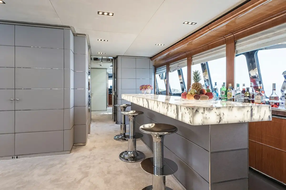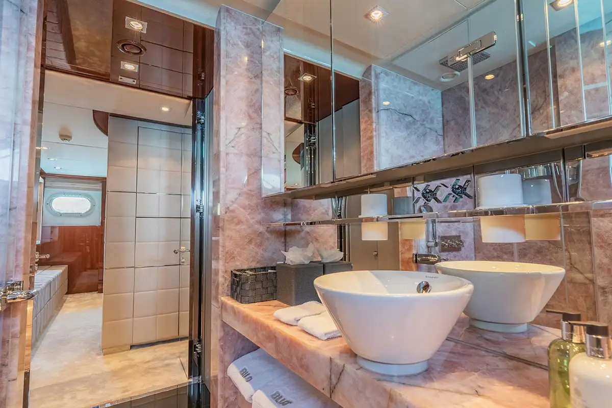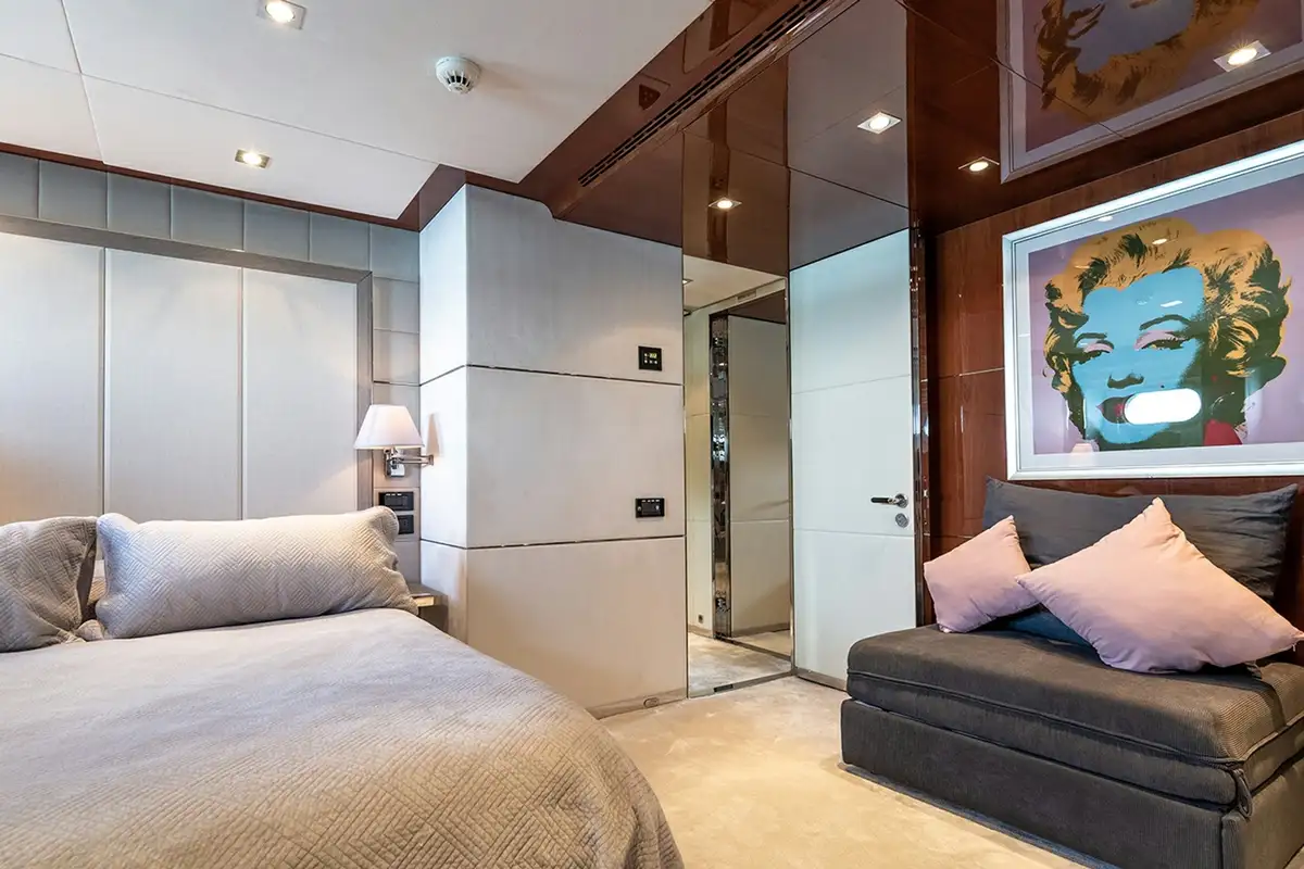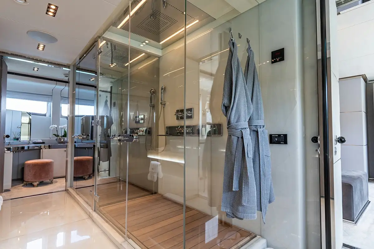 BLISS can accommodate 12/14 guests in five well-appointed cabins. Each cabin has its own unique design and style, ensuring guests can enjoy a welcoming and relaxing personal space to retreat to when on board. The upper salon can be converted to be used as an extra guest cabin with a Pullman king size bed. An elegant main salon forms the heart of the yacht; the large seating area and entertainment system is completed by a formal dining space, with circular table and leather seating, for enjoying sumptuous meals prepared by Bliss’ talented chef. She can accommodate 10 crew members on board to ensure the best luxury experience.