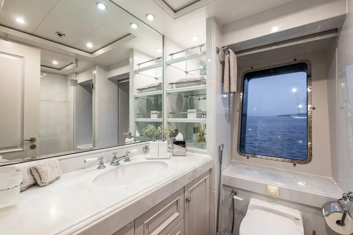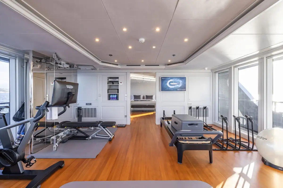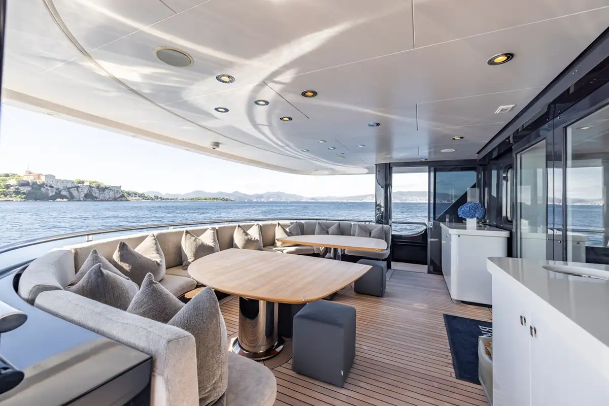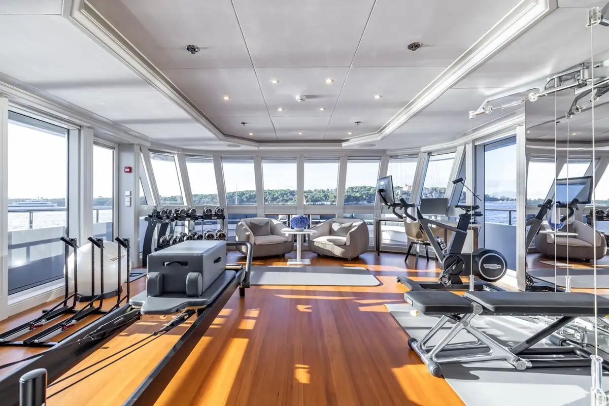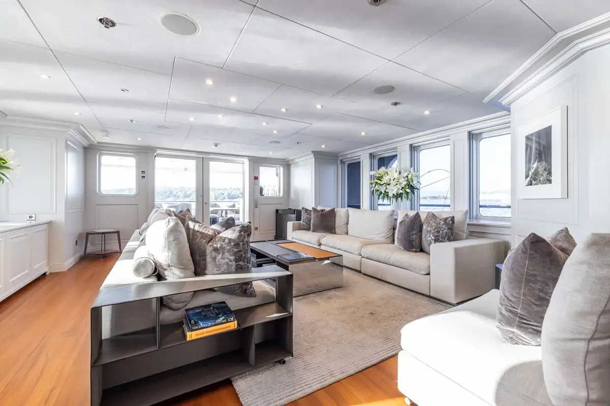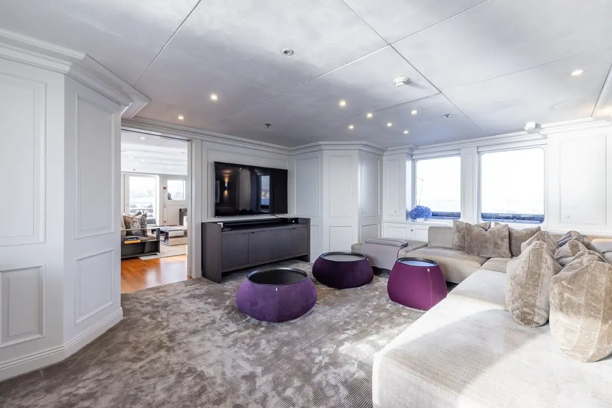 Her main deck saloon is amidships and notably spacious, with large lateral windows. There is a separate formal dining room aft, plus a dedicated cinema room.