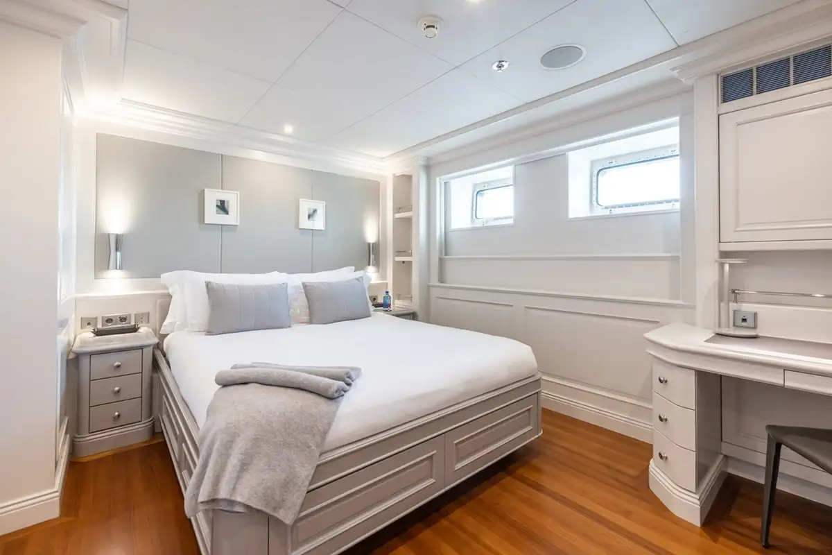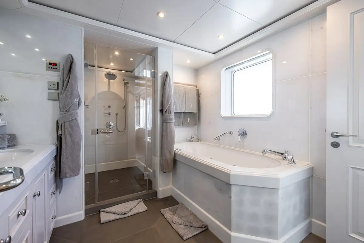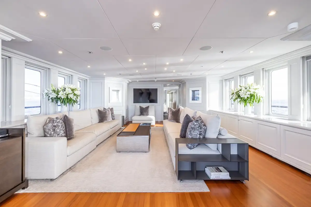 Her total internal volume adds up to 499GT, arranged on three main levels. She is designed to host up to 12 guests in six cabins, with separate quarters for up to 12 crew. The interior was redesigned and extensively refurbished in 2015-2016, with a palette of pale grey and off white, and about 200 square metres of Burma teak flooring.